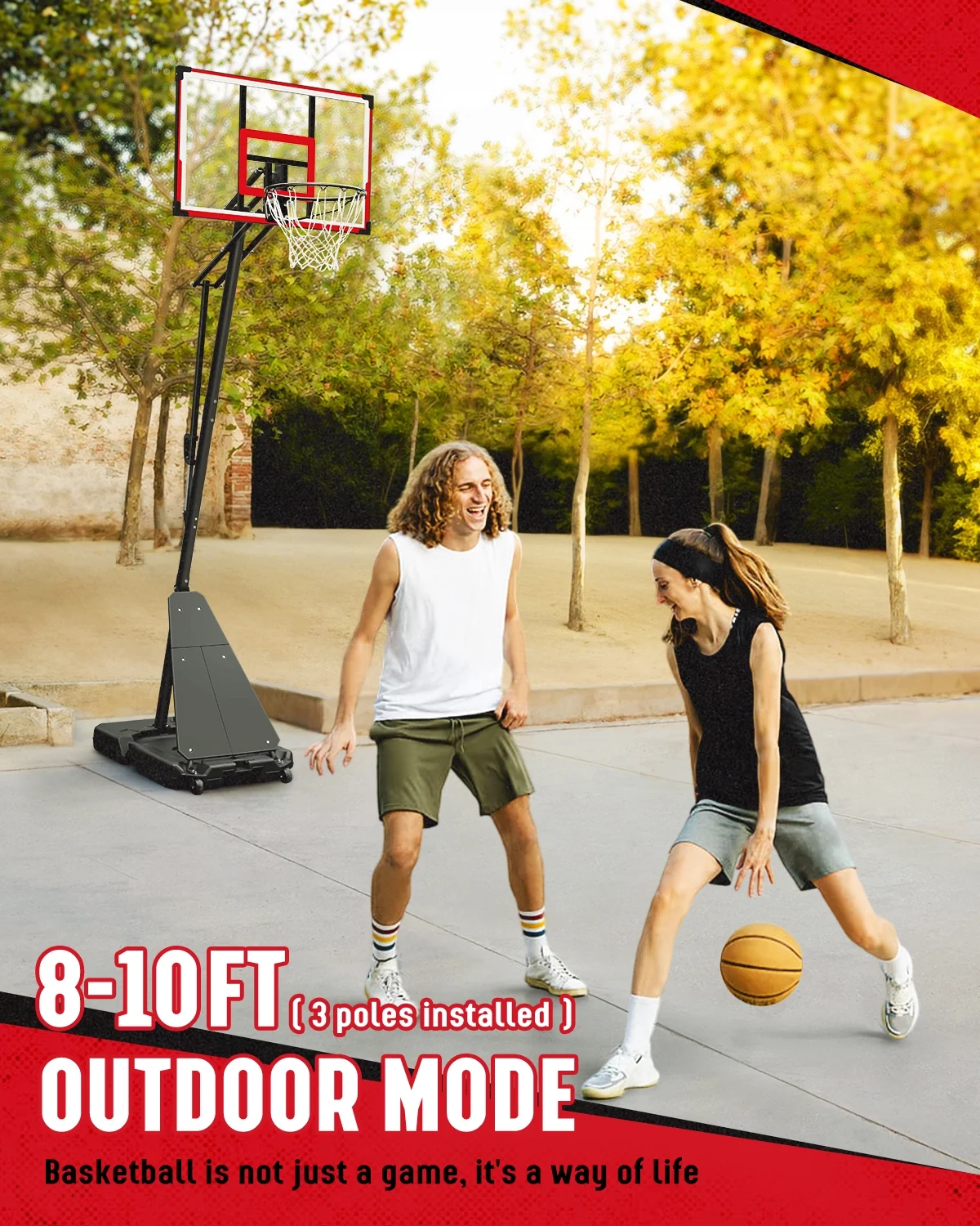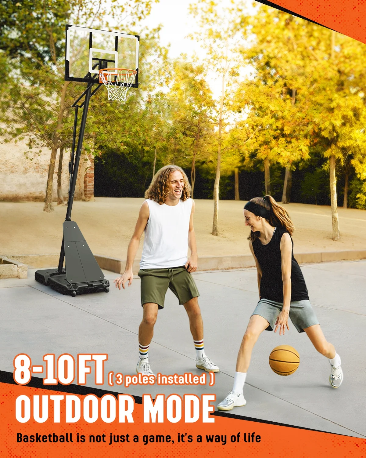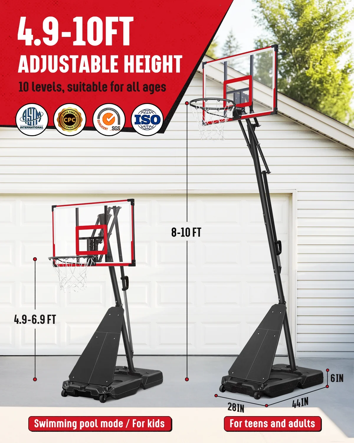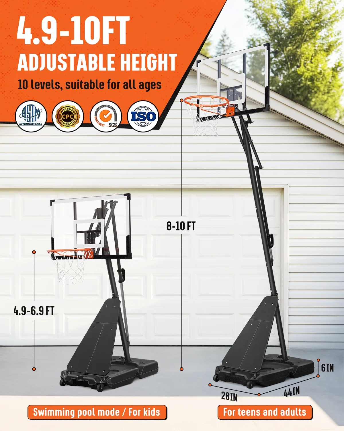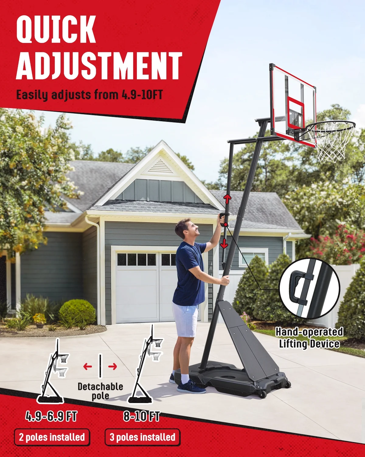 - ��One-button Adjustment, 4.8-10 feet��This basketball goal has a wide range of adjustment, from 4.8 feet to 10 feet. You only need to dismantle a pole to change the lifting range from 4.8-6.8 feet to 8-10 feet. One-button control of the lever can easily adjust the height and lock within the range (4.8-6.8 feet/8-10 feet), convenient and labor-saving. It can handle high-intensity games and training, and is also suitable for family activities, sports games, and school activities with family and friends.