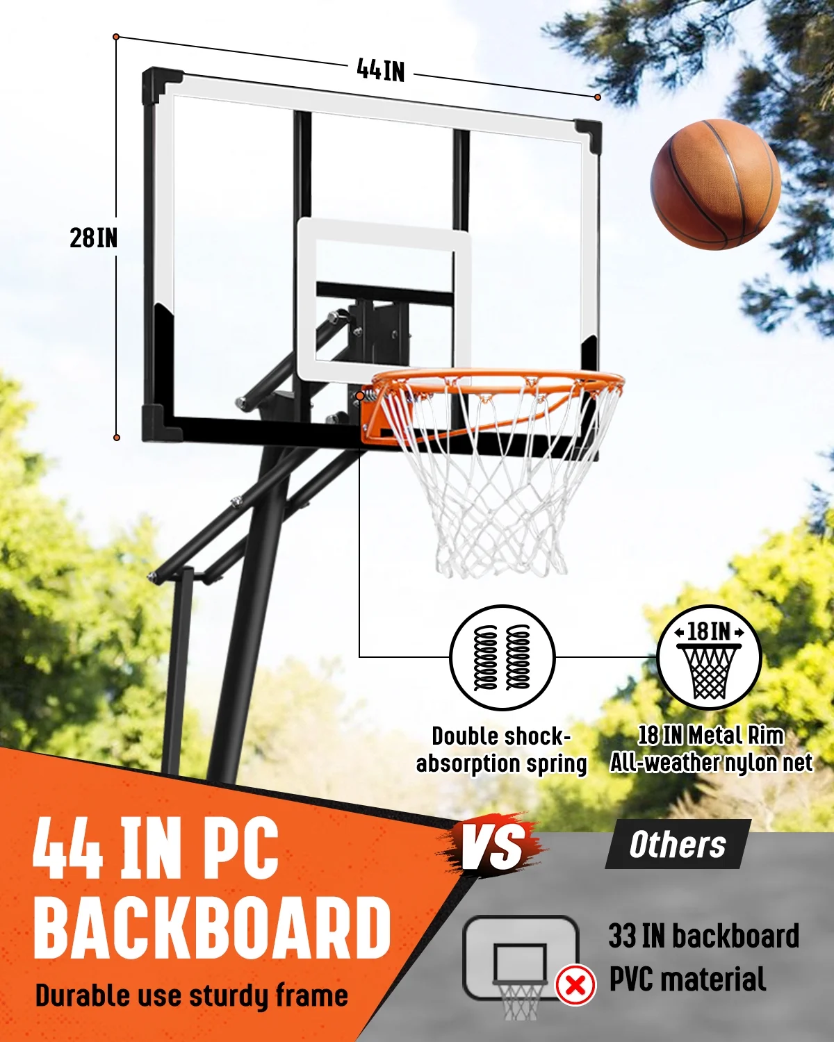 - ��Strong Shockproof and Sturdy��The shockproof rim suitable for standard size 7 balls is made of 16mm thick Q195 steel, equipped with 44 inches of super strong strength and high-strength windproof PC transparent backboard, which will avoid impact and fragmentation when dunking. All-weather nylon mesh is perfect for all seasons.
