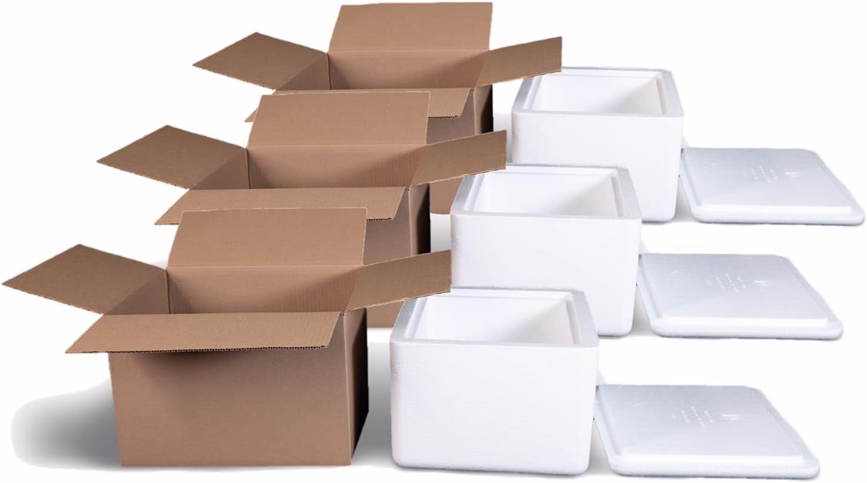 - Pack of 3 Polystyrene Insulated Shipping Coolers in sturdy Carboard Boxes.