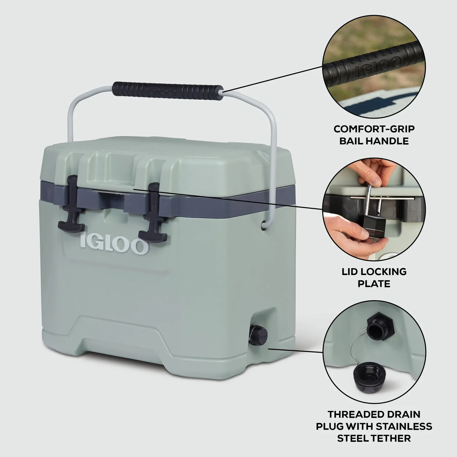 When the outdoors beckon, Igloo Overland is ready. From superior ice retention to little features that go a long way, Igloo built the compact, adventure-ready Overland 25-Quart Bail Handle Cooler to see you through your journey outdoors �� all while keeping your provisions fresh. The Overland cooler won't let you down. With extra-thick 1.5-inch foam-insulated walls and an insulated lid, you'll get dependable, long-lasting ice retention, so your essential food and drinks stay chilled. The lid shuts securely using the durable rubberized latches �� which seals the cooler, so things won't spill out. In addition, the built in locking plate allows you to lock your cooler for added security. Igloo also crafted Overland with convenient features, like a bottle opener, UV inhibitors that'll help prevent sun damage and a threaded, tethered drain plug to make emptying any melted ice at the end of your trip practically effortless.