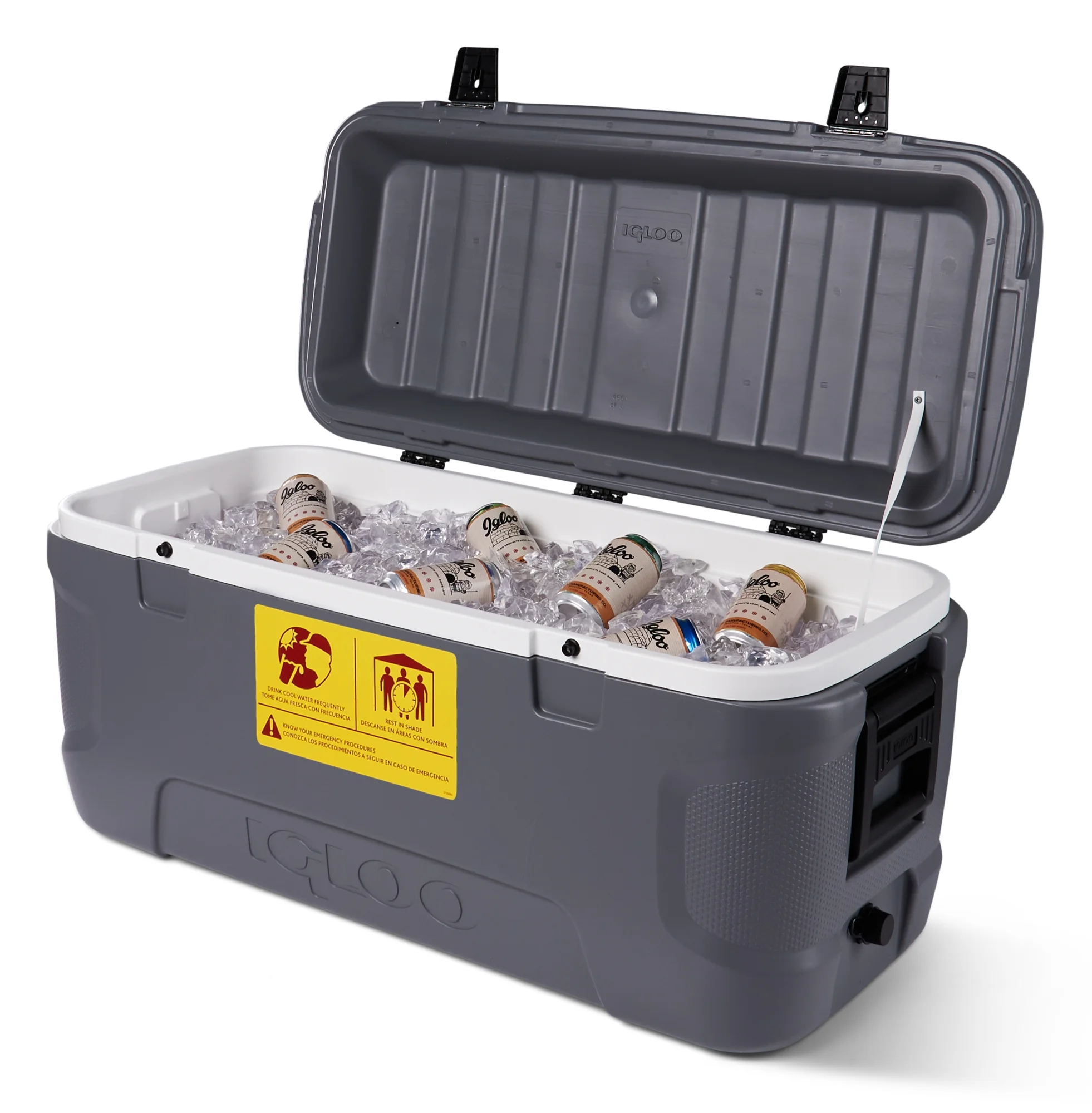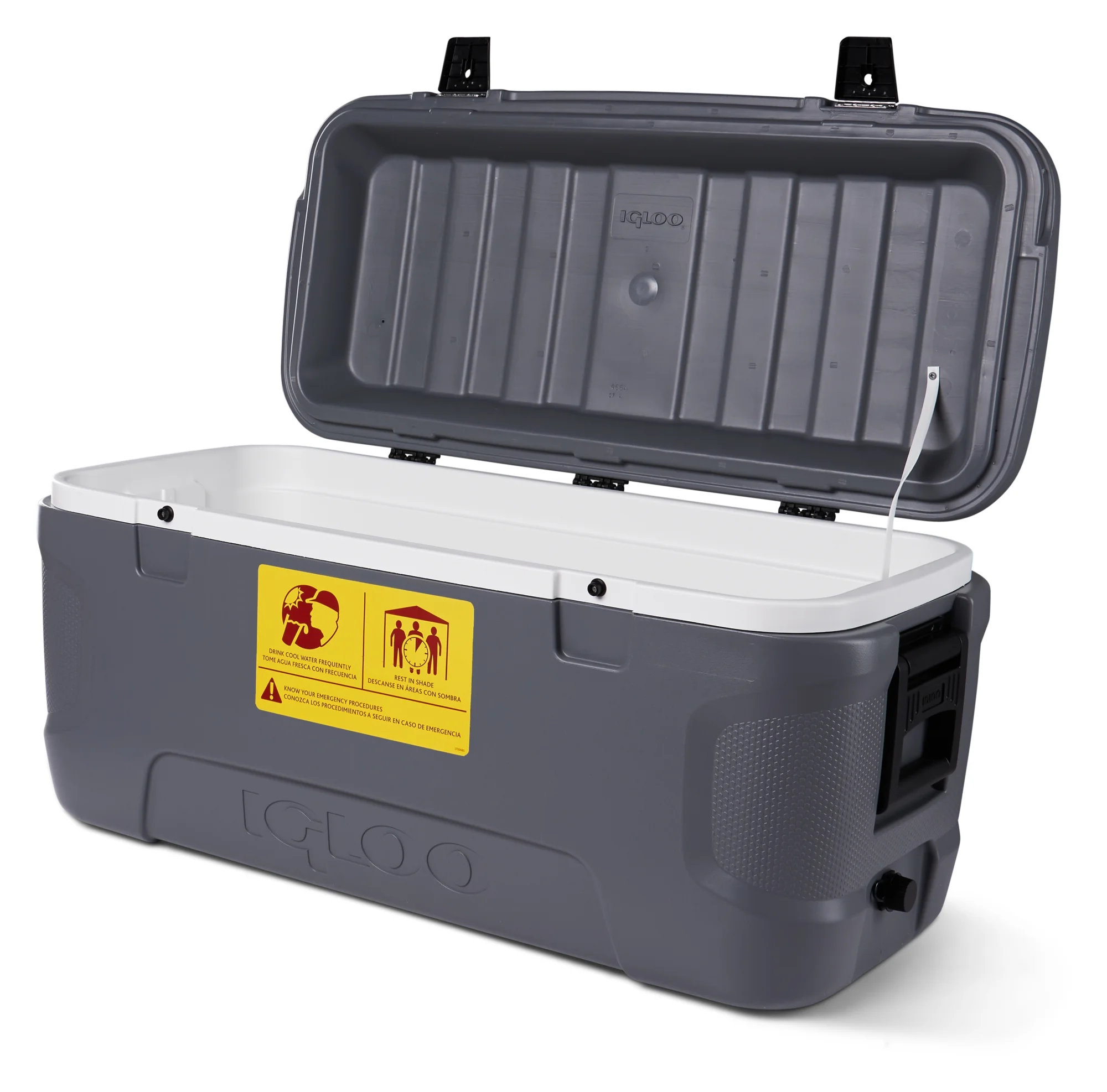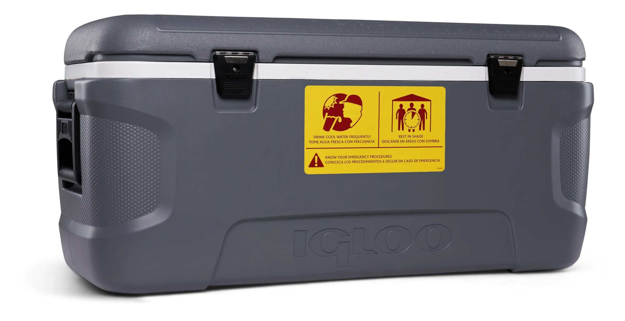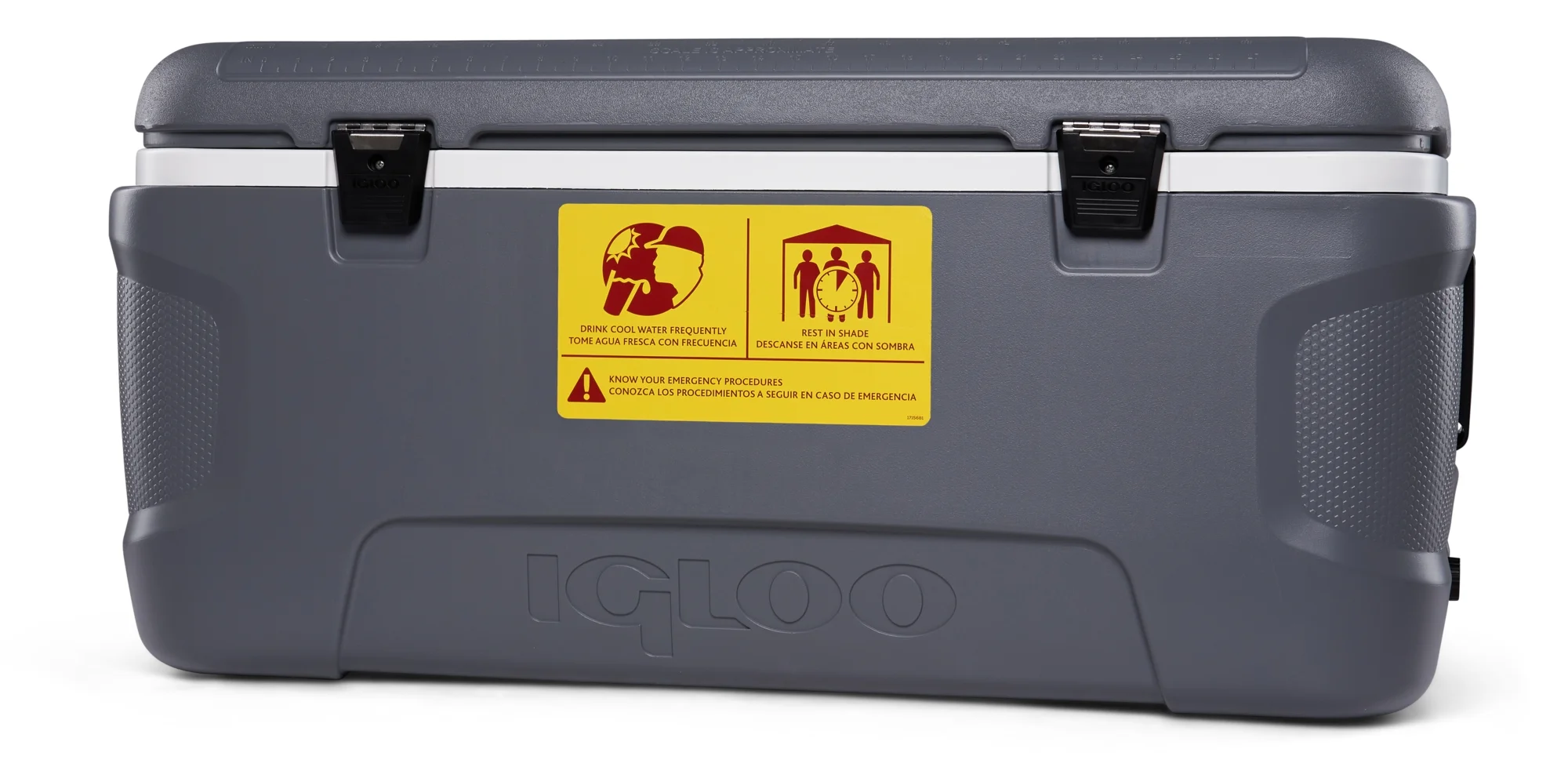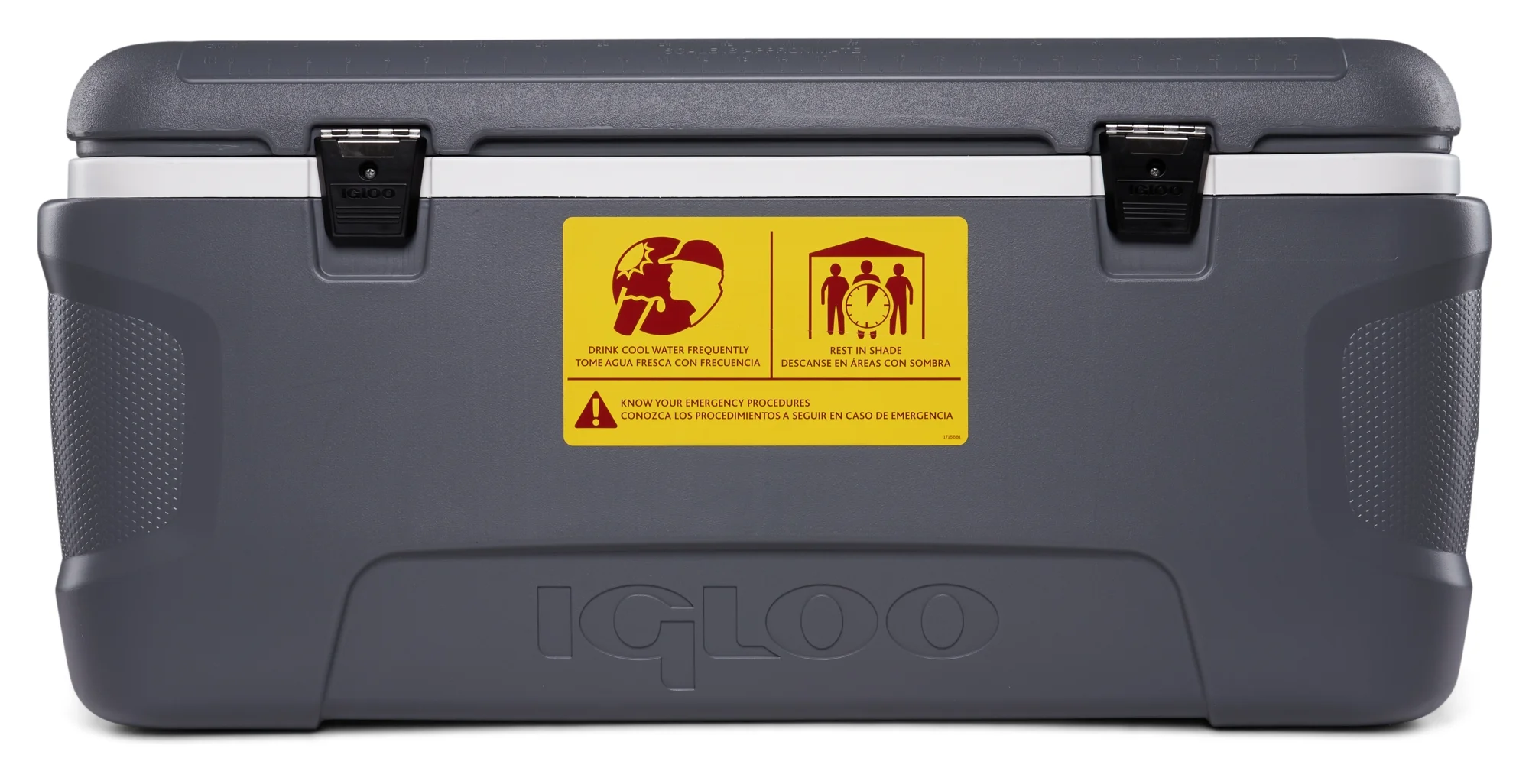 Workman 120 quart ice chest is an industrial-grade ice chest from the brand, Igloo. The product features a heat stress decal with bilingual and icon messaging to remind workers they can avoid heat stress by staying hydrated, resting in the shade, and knowing emergency procedures related to safety. Large capacity ice chest to keep bottled water and electrolyte replacement drinks at the optimal temperature to keep your job site hydrated. Components parts are durable for long product life. Parts include replaceable stainless steel screws that are rust-resistant, marine-grade hinges, and plastic latches that are easily replaced to provide maximum value.
