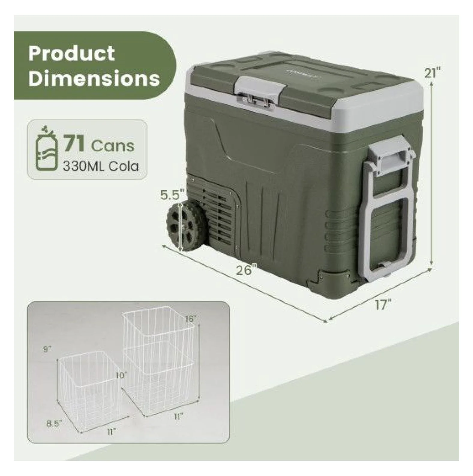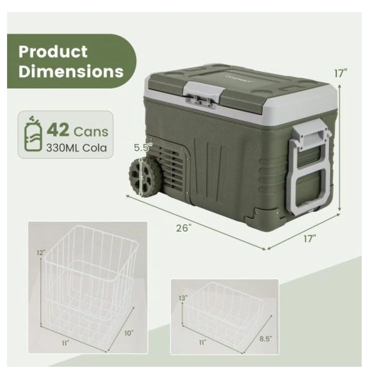 35L Color Green Material PP HDPE ABS Product Dimensions 26" x 17" x 17" Small Storage Basket Size 11" x 8.5" x 5" Large Storage Basket Size 11" x 10" x 12" Diameter of Wheel 5.5" Capacity 37QT/35L Input Voltage 12/24V DC &100-240V AC Power 45W (ECO mode) 72W (HH mode) Noise Level ��45dB DC Power Cord Length 7.8 ft AC Power Cord Length 4.8 ft Net Weight 33 lbs Adjustable Temperature Range -4�H~68�H/-20��~20�� Preservation Temperature Fruits& Vegetables 5��~10��/41�H~50�H Fast Food & Pastries -3��~4��/27�H~39�H Seafood -11��~-4��/12�H~25�H Frozen Meat -18��~-12��/0�H~10�H 50L Color Green Material PP HDPE ABS Product Dimensions 26" x 17" x 21" Small Storage Basket Size 11" x 8.5" x 9" Large Storage Basket Size 11" x 10" x 16" Diameter of Wheel 5.5" Capacity 53QT/50L Input Voltage 12/24V DC &100-240V AC Power 45W (ECO mode) 72W (HH mode) Noise Level ��45dB DC Power Cord Length 7.8 ft AC Power Cord Length 4.8 ft Net Weight 35 lbs Adjustable Temperature Range -4�H~68�H/-20��~20�� Preservation Temperature Fruits& Vegetables 5��~10��/41�H~50�H Fast Food & Pastries -3��~4��/27�H~39�H Seafood -11��~-4��/12�H~25�H Frozen Meat -18��~-12��/0�H~10�H Box QTY 1 Package Includes 1 x Car Refrigerator 1 x DC Power Cord 1 x AC Power Cord 1 x Instruction12V Car Refrigerator Portable Fridge - 35L/50L Electric Cooler, Adjustable Temp -4�H~68�H, DC 12/24V & AC 100-240V, for Road Trips, Camping, Food Preservation