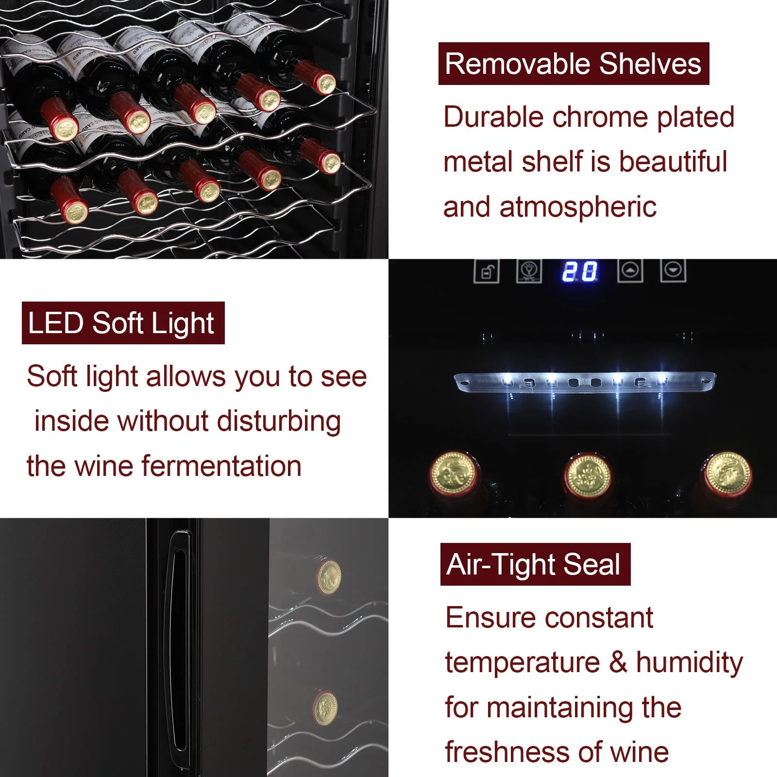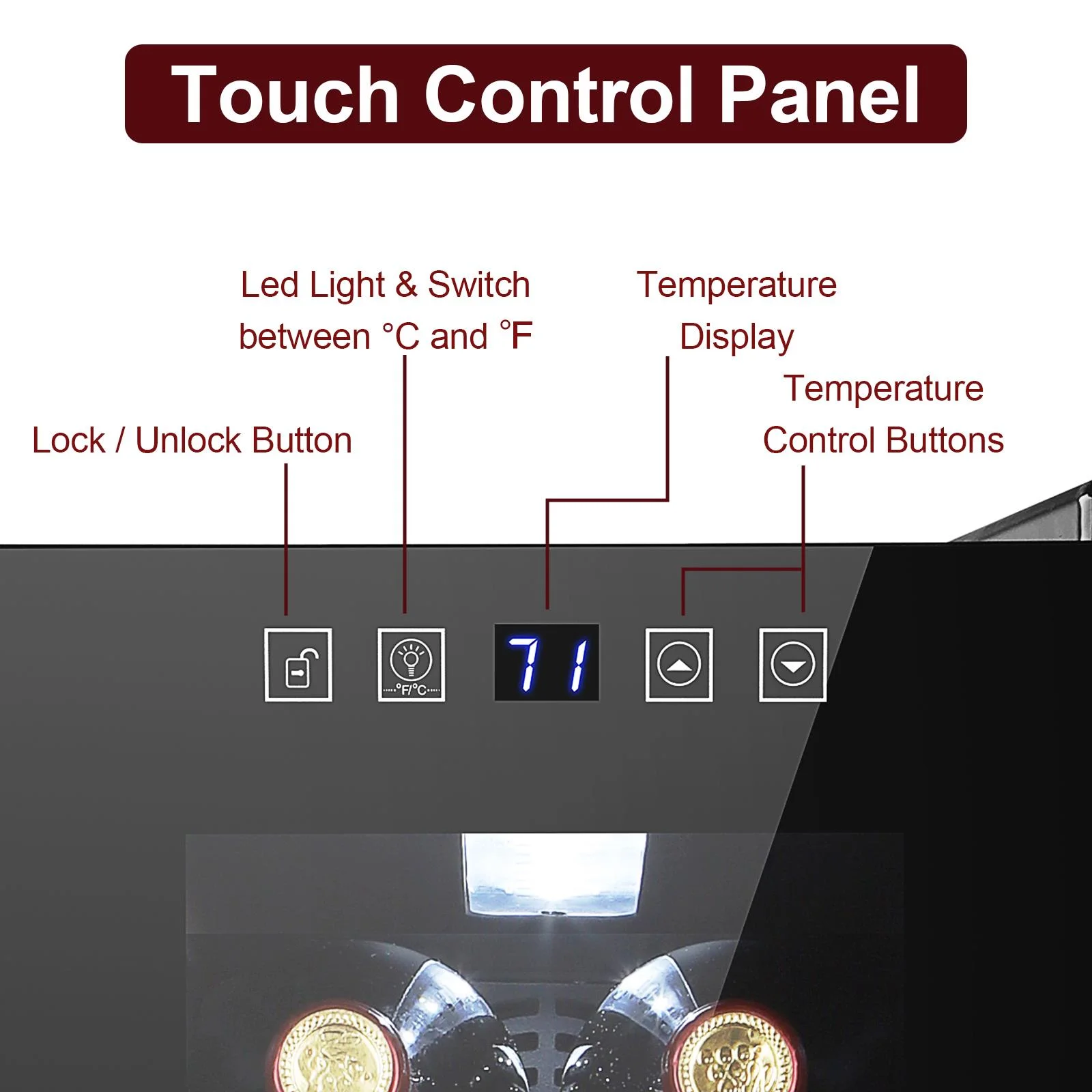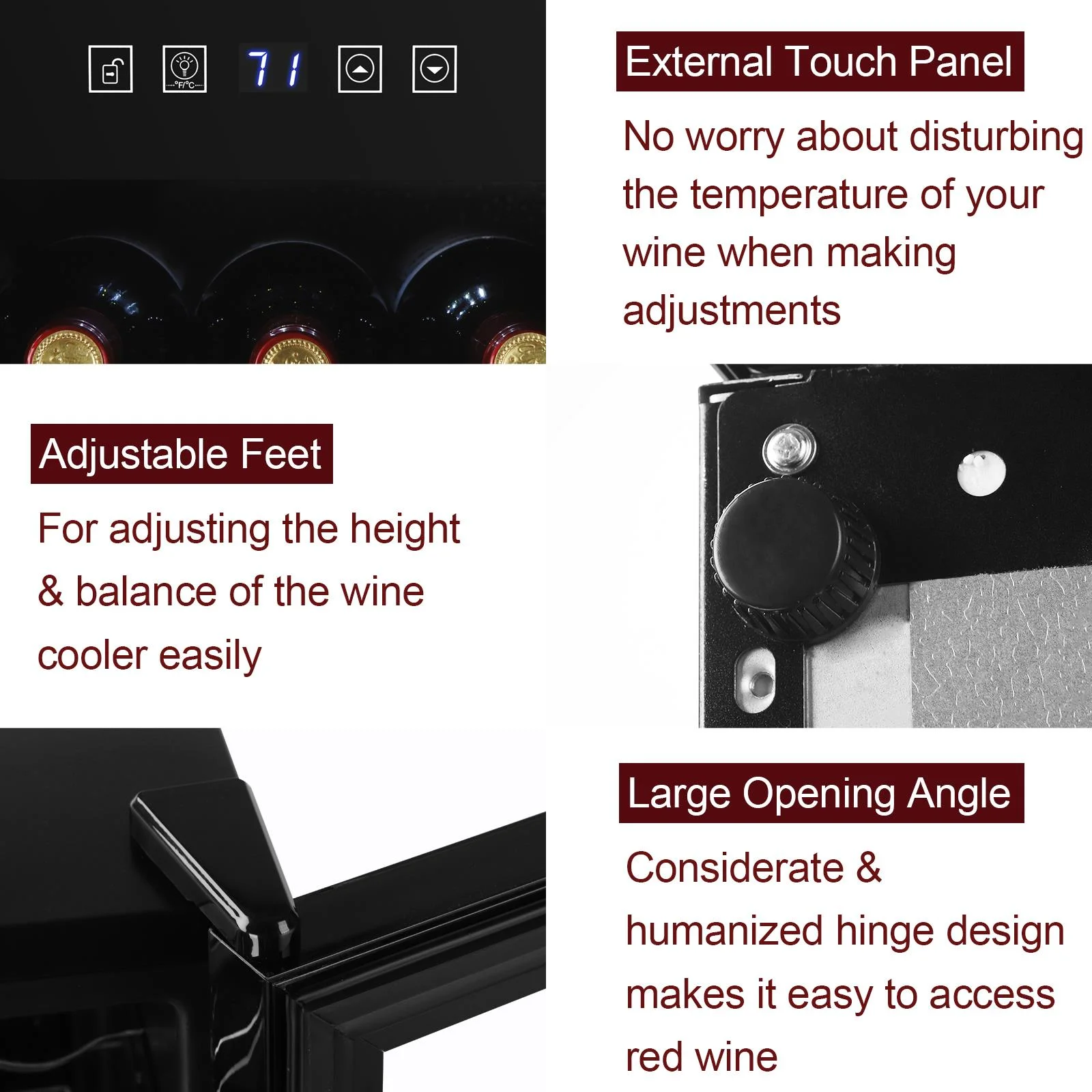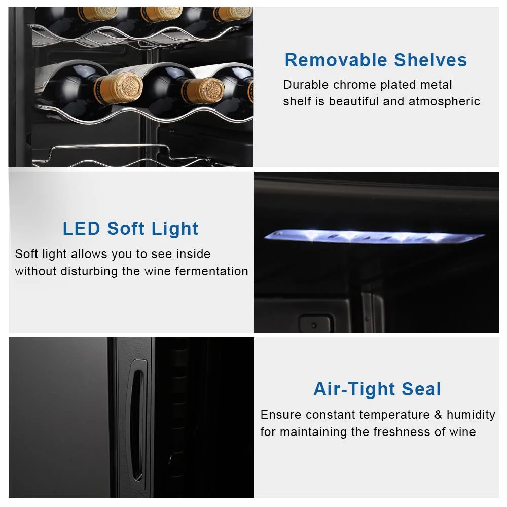 2.Easy use: An easy-to-use digital touchscreen on the front provides easy access to control the internal temperature for your wine collection. LED temperature display always makes the information readable.