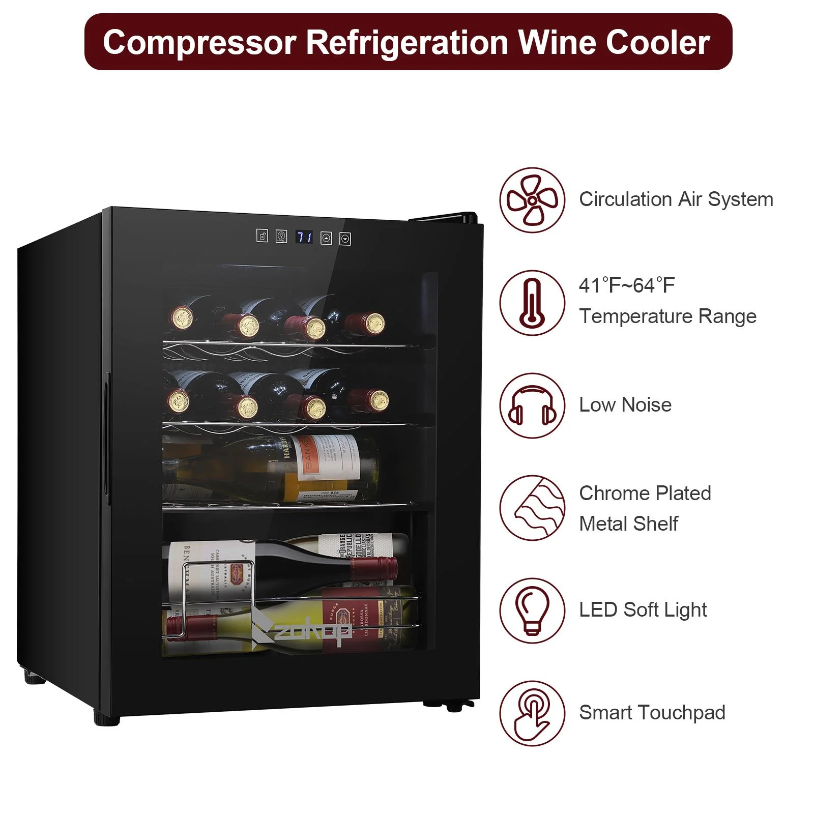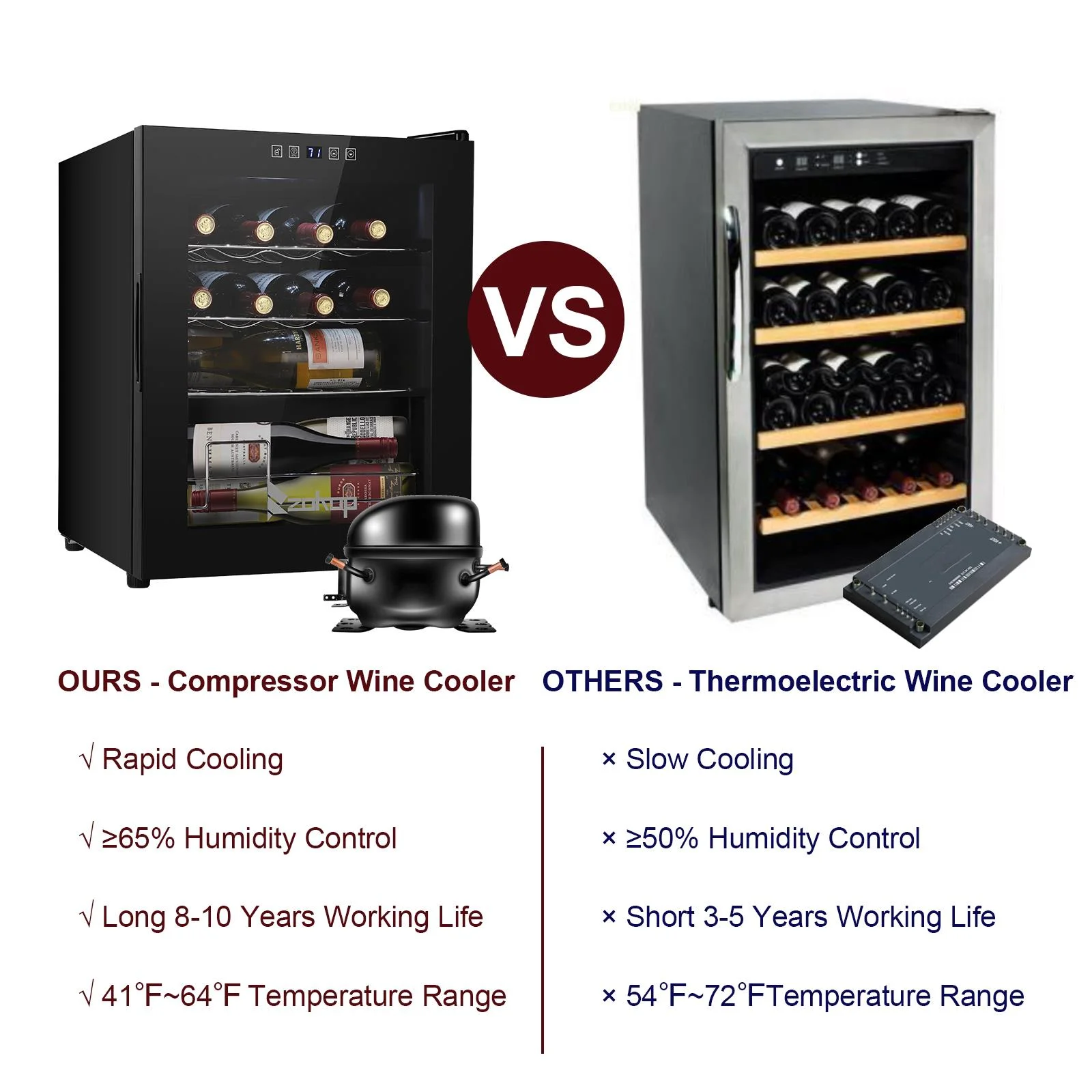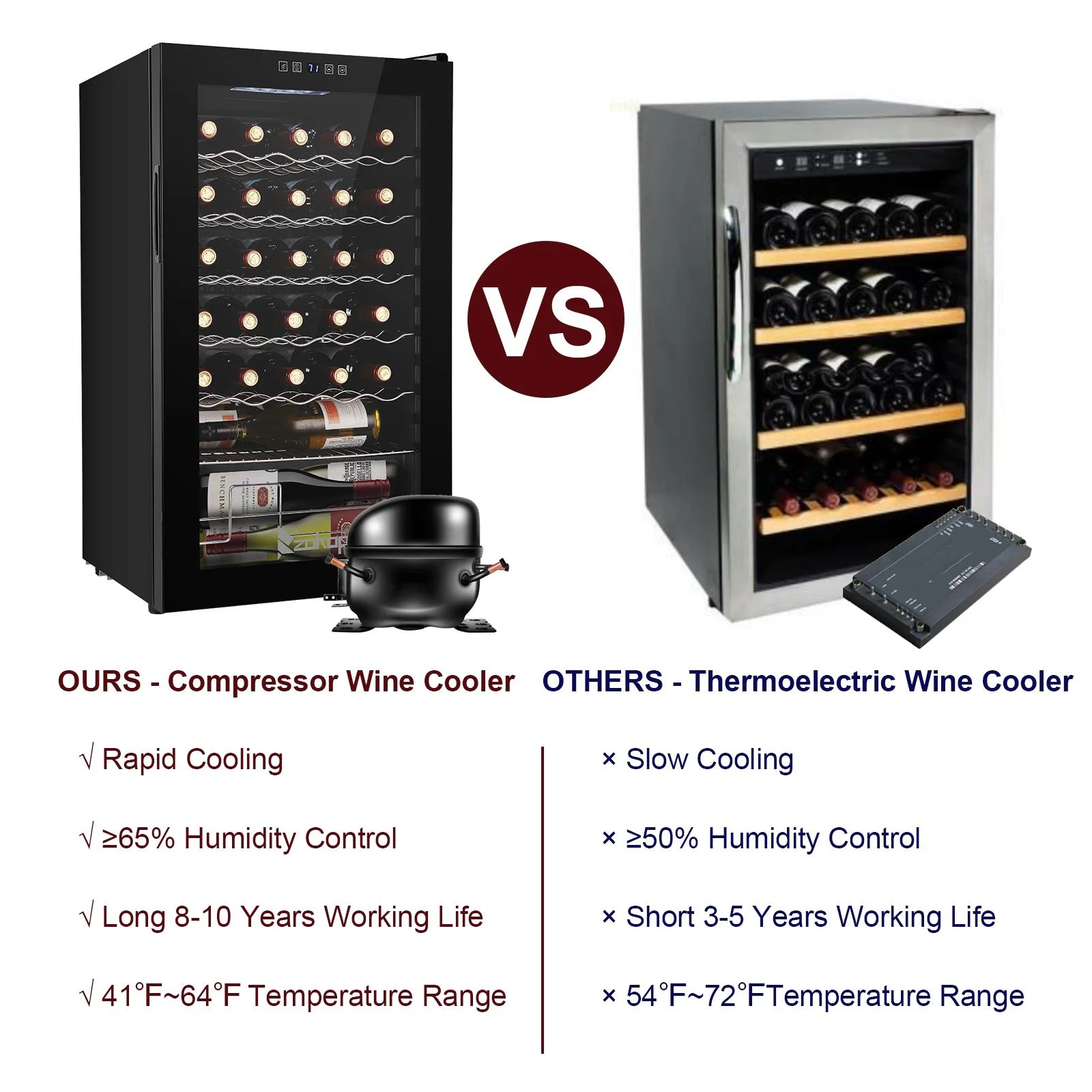 1.Keep wine cool: Heat is enemy number one for wine. wine coolers' compressor technology ensures temperature is not affected by outside heat sources. It enables you to store your wine in optimal conditions for long-term aging. Working temperature range is (41- 64)degree Fahrenheit, and allows you to customize the temp (55degree Fahrenheit is often cited as close to perfect).