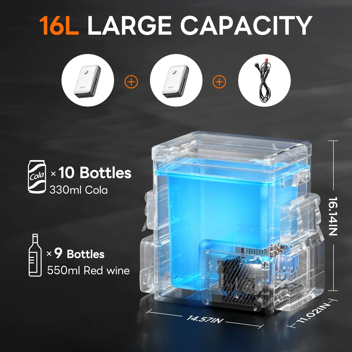 [Space-Efficient & Ultra-Quiet] The portable cooler with 16L capacity can hold 24 cans + 6 wine bottles with collapsible dividers. 42.1% effective volume ratio (industry average: 30%) with see-through lid for quick access. Lid closure becomes a snap closure for better cold retention. Ultra-quiet 35dB operation - quieter than office AC. *Bonus: Top-mounted control panel prevents accidental temp changes vs front-panel car fridges.