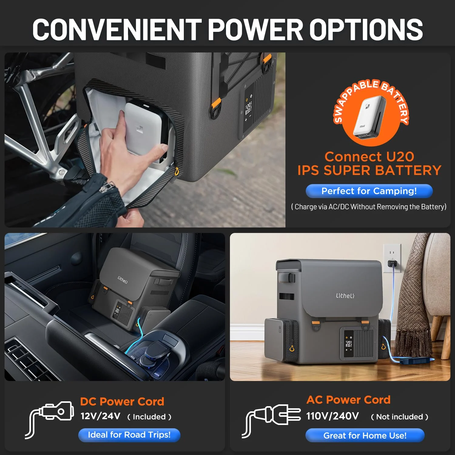 - ��Versatile Power Options & Wide Applicability��Compatible with multiple power sources including the Litheli U20 IPS SUPER BATTERY, 12V/24V car cigarette lighter sockets, and AC adapters, this cooler is versatile for use in hiking, e-bikes, motorcycles, cars, RVs, and home environments.