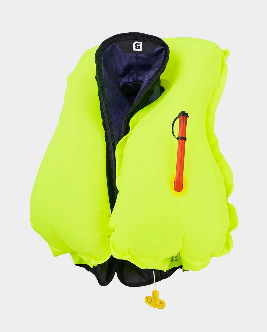 - This apex black inflatable life jacket will manually inflate by grasping the inflation pull tab and pulling sharply downward.