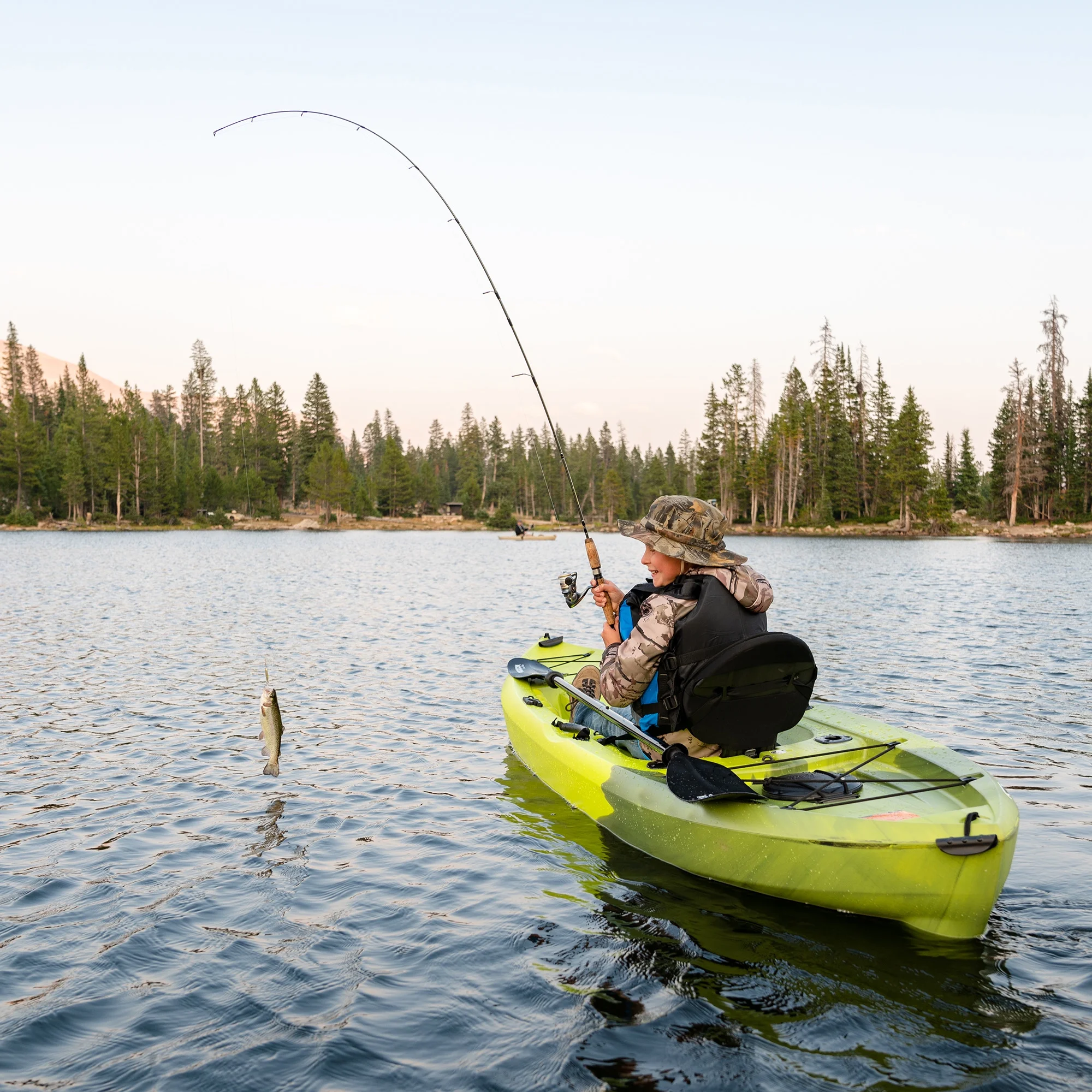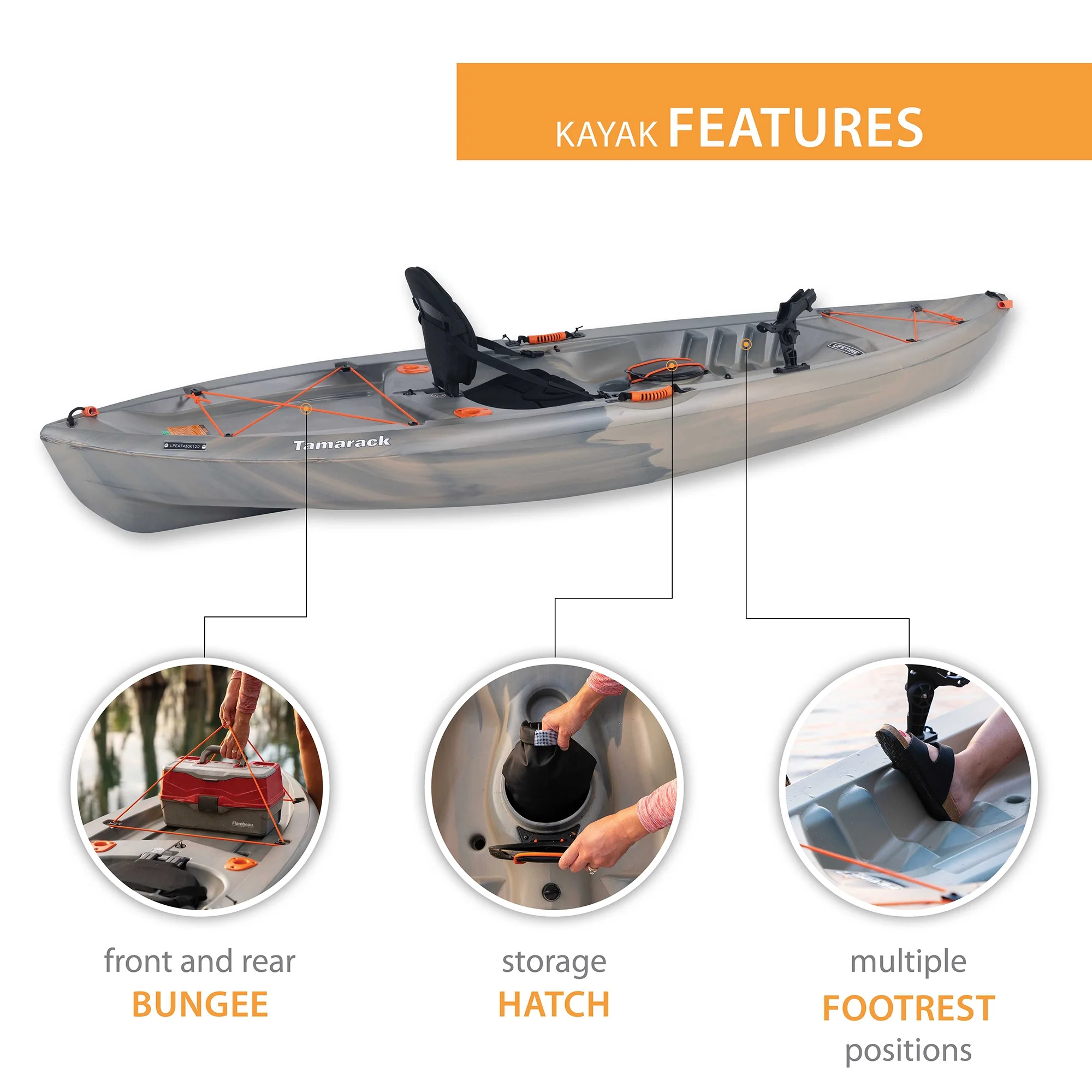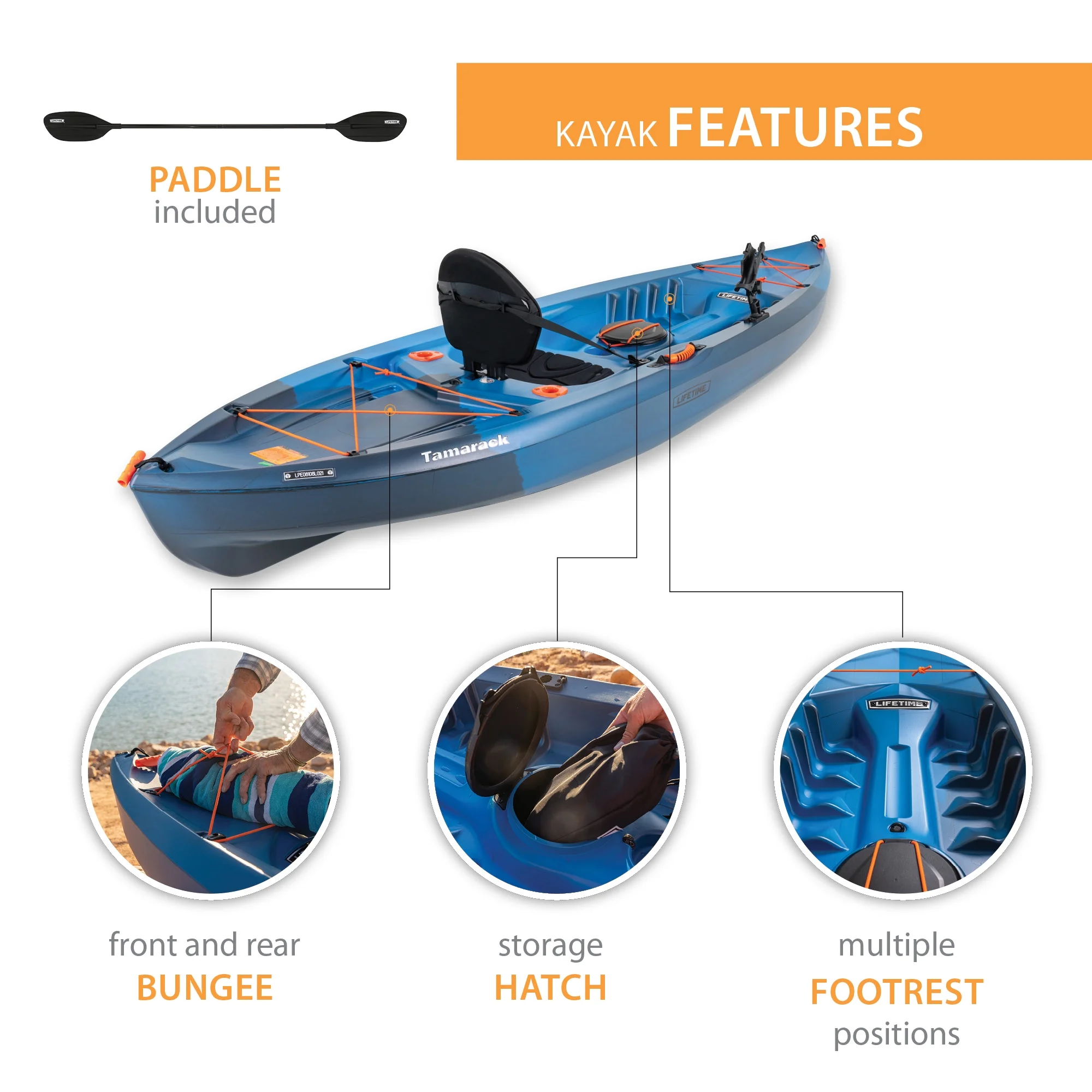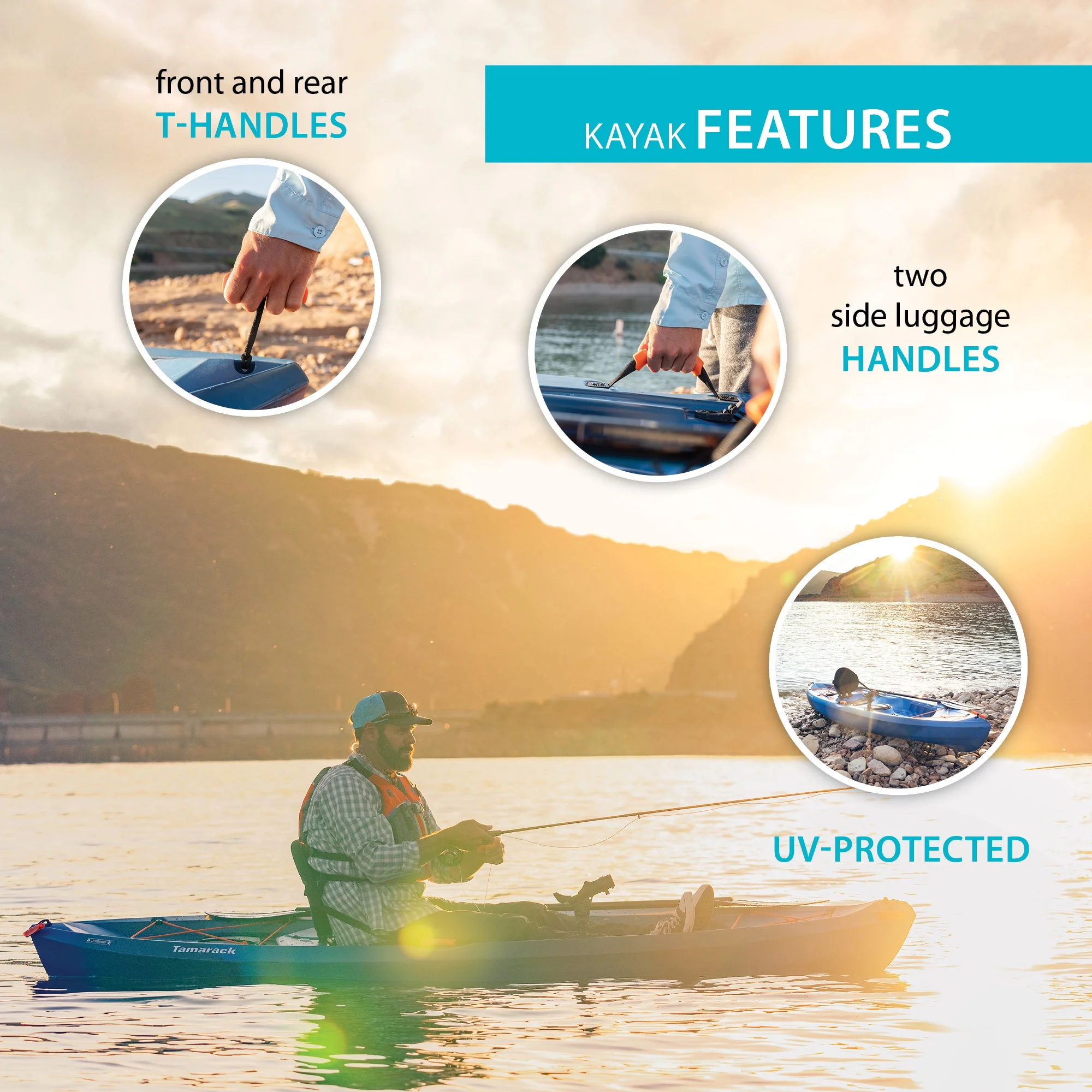 Take some time to relax on the water with family and friends. The Lifetime Tamarack? Angler is a sit-on-top fishing kayak that has a comfortable padded seat and backrest for long fishing adventures. Designed for extreme safety and stability, the Tamarack? Angler has a stable flat bottom with deep tracking channels and stability chine rails. The kayak features durable construction that is UV-protected, and impact resistant. With fishing rod holders, shock cord straps, multiple footrest positions, and a storage hatch, this kayak has plenty of extras to enhance your paddling and fishing experience.