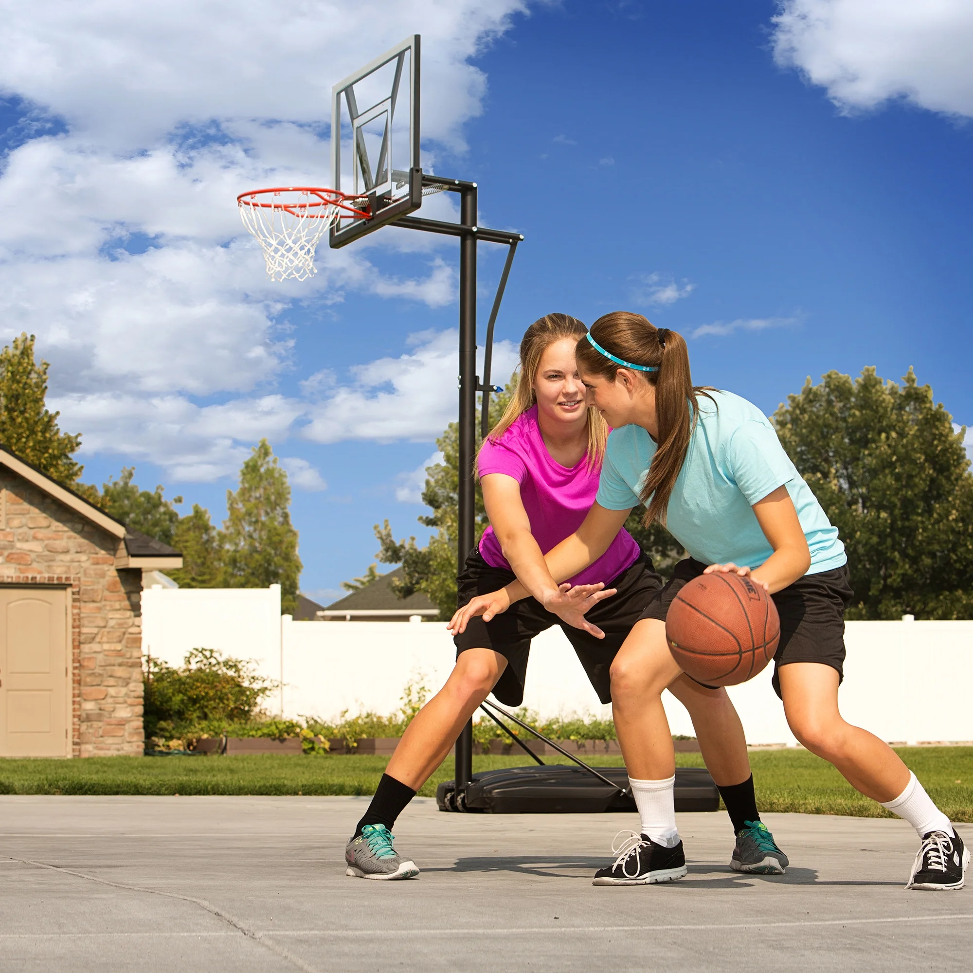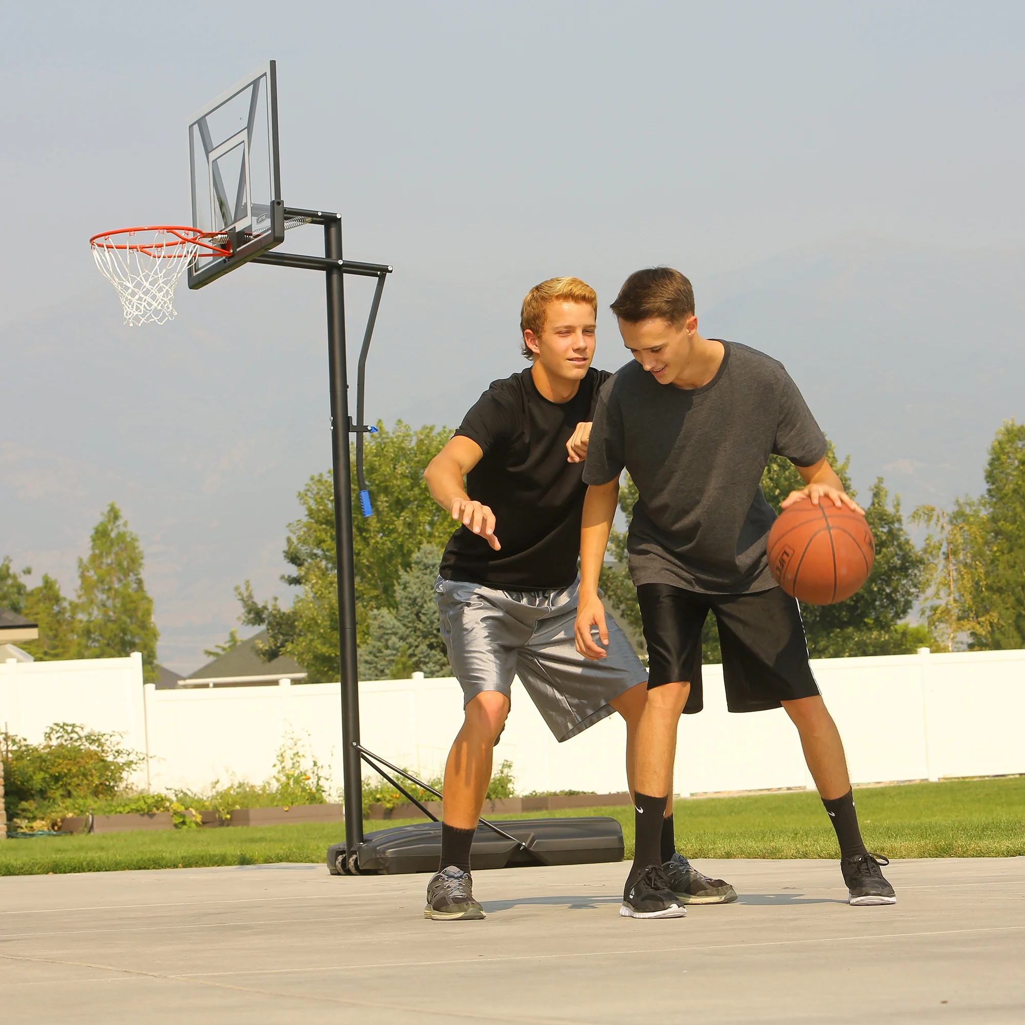 - Courtside Portable Base: The system is supported by a 31 Gallon Heavy-Duty portable base. Just fill with sand or water and play today. No cement required! Base includes wheels making it easy to move to your desired location.