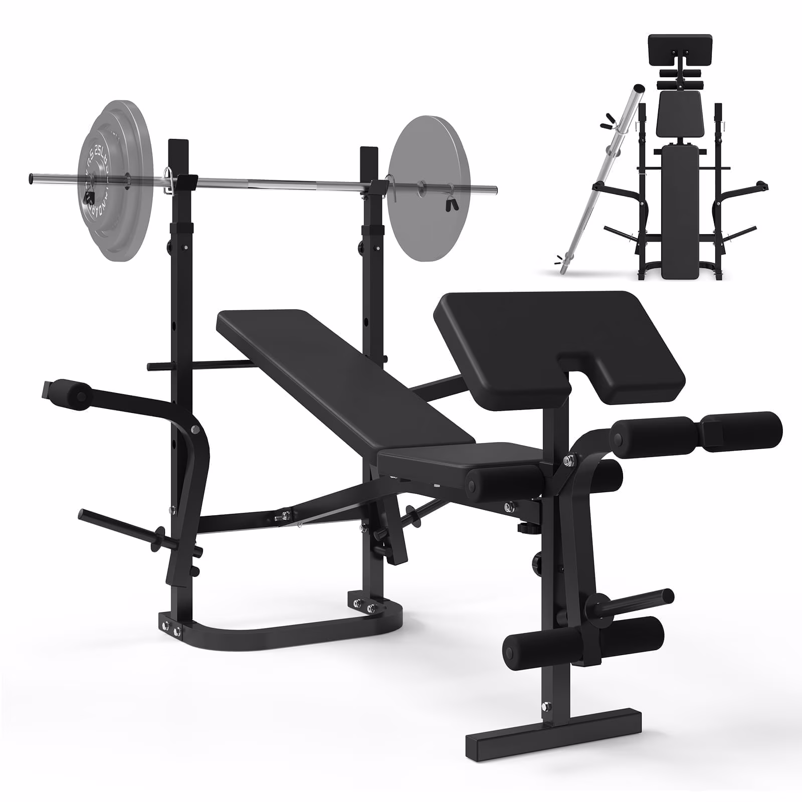 - You don't just get a weight bench; you get a whole gym in one sleek, stylish package. Think Olympic Weight Bench, bench press machine, Preacher curl pad, lying curl machine, leg extension machine, and chest fly machine �?all wrapped up in one convenient, space-saving design. When you buy from us. You basically get six machines for the price of one, ready to sculpt and tone every muscle in your body.