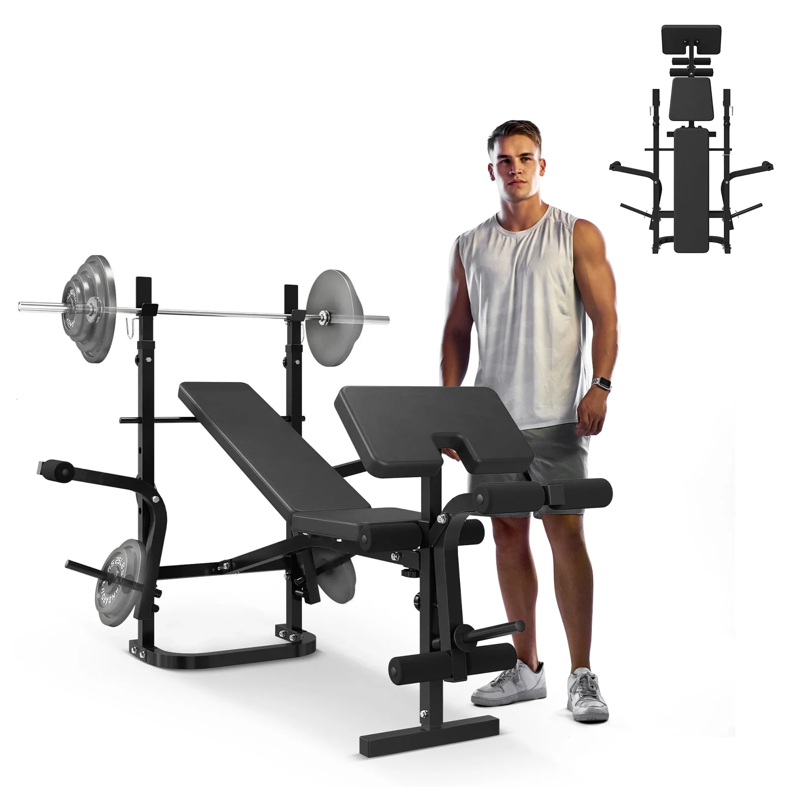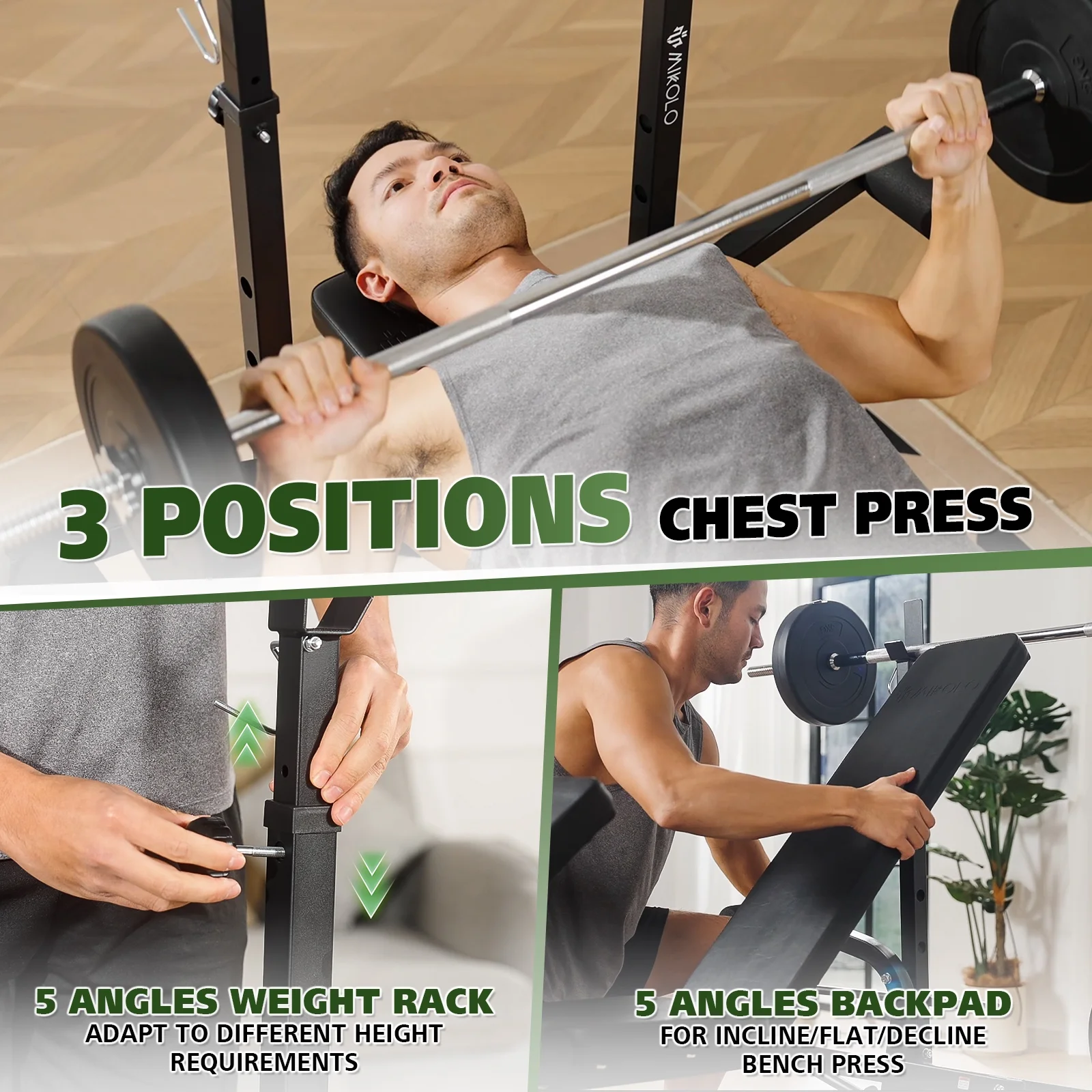 - Whether you're a seasoned lifter or just starting out, our weight bench has got your back �?or your chest, or your legs, depending on the day. With 5 levels of backrest adjustment, you can switch between inclined and flat positions in a snap. And the barbell rack? It adjusts to 5 heights, catering to every body type and finding the perfect lifting posture for you. This means you can hit those muscles from every angle, maximizing your workout and getting the results you crave.