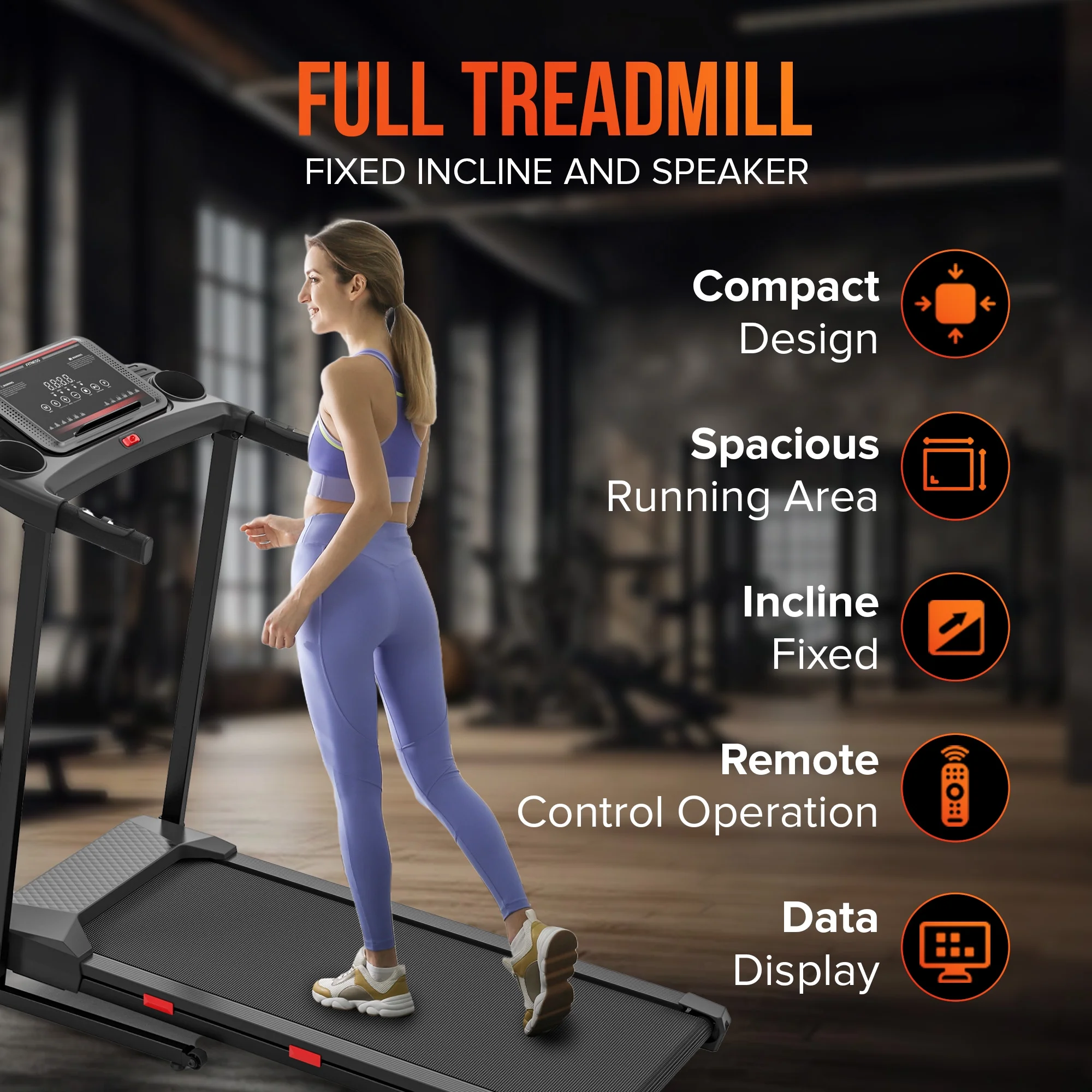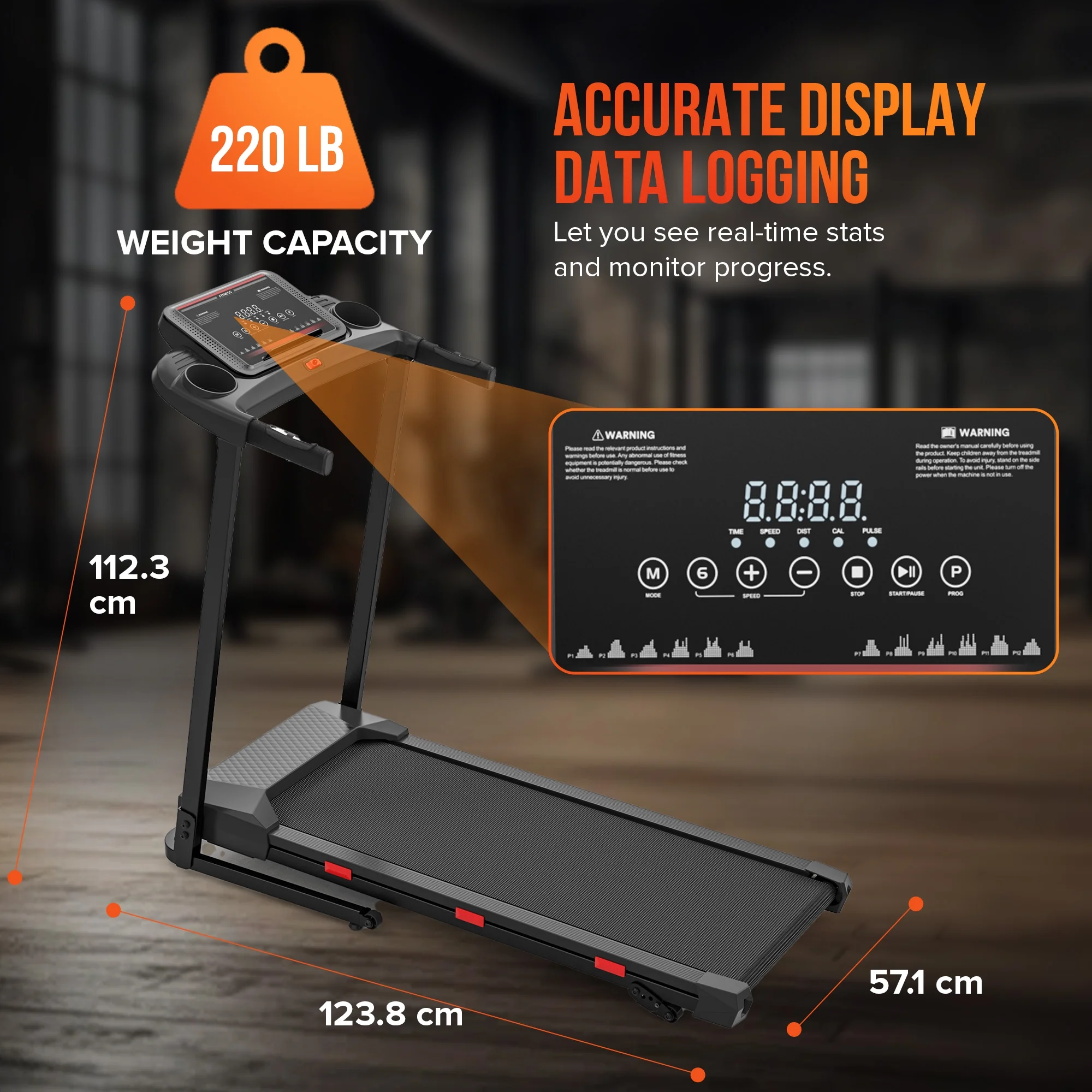 This treadmill with incline provides a spacious running area (400 mm x 1000 mm), supporting users up to 220 pounds. Powered by a continuous 0.88 HP motor that peaks at 2.25 HP, this exercise machine ensures consistent performance for walking, jogging, or running.