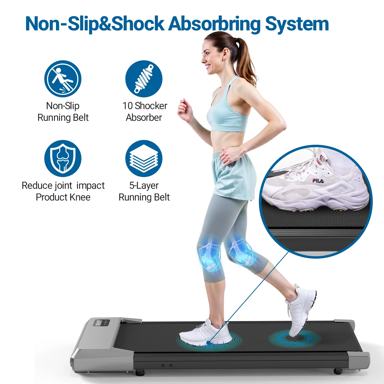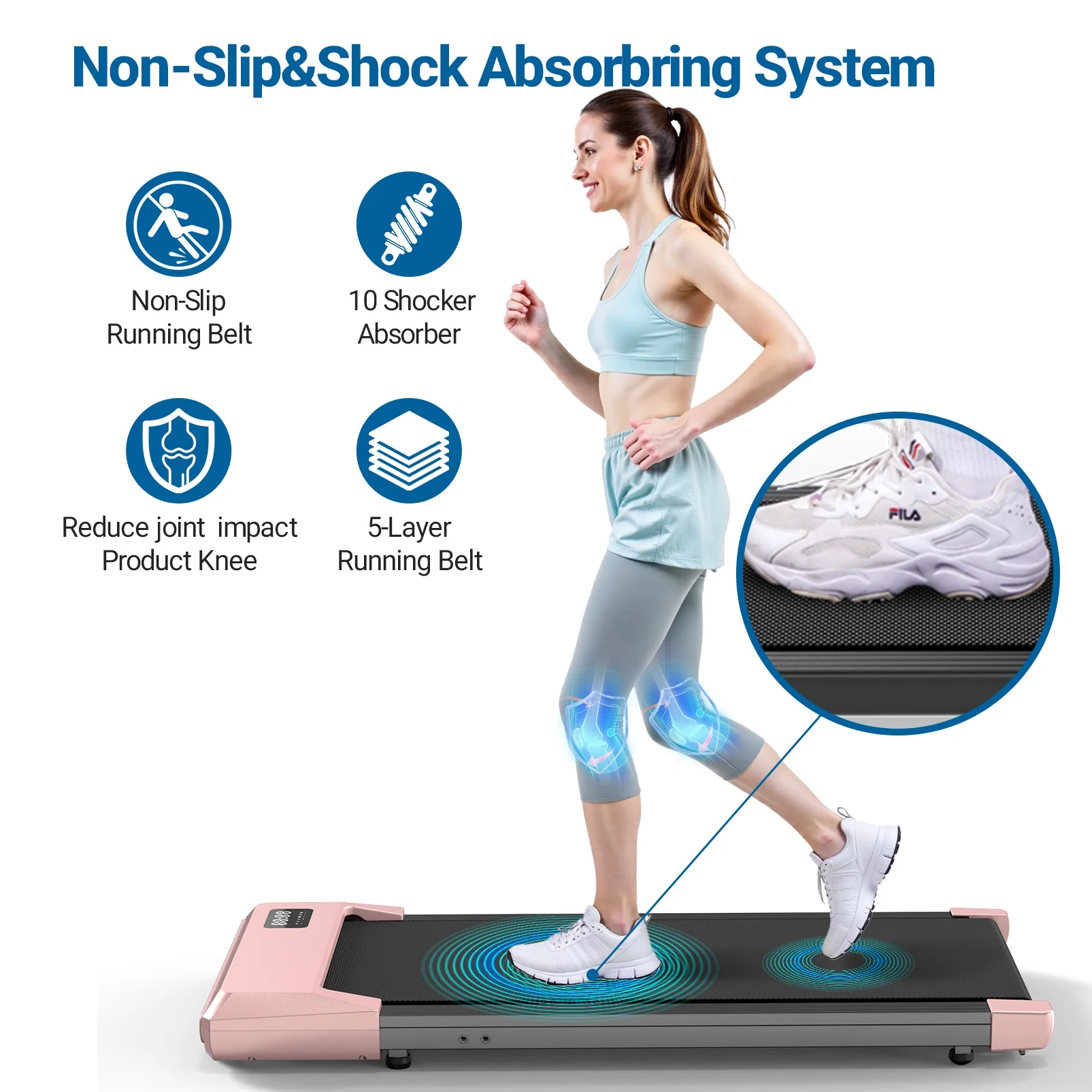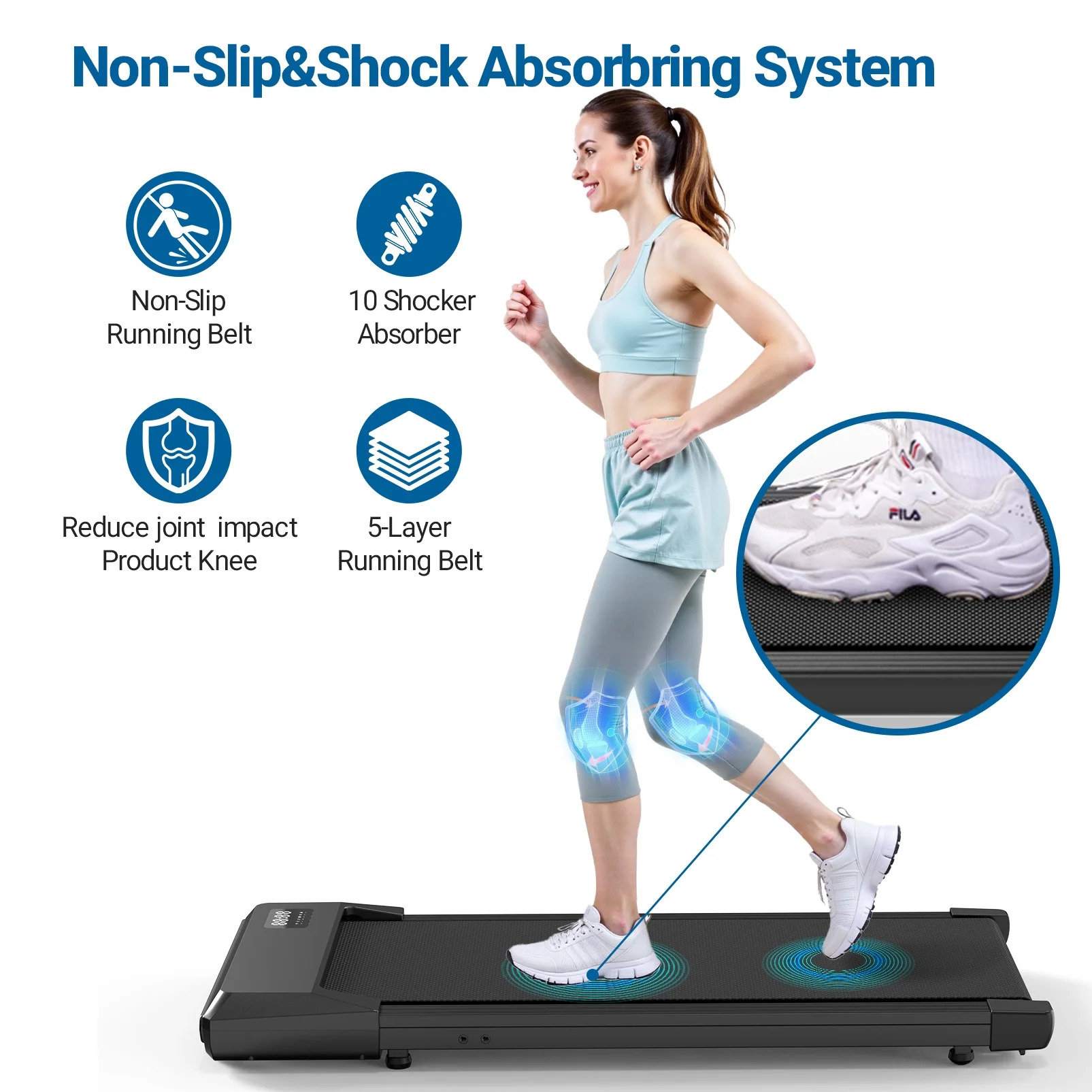- 5-layers 16" Running Belt--This mini treadmill uses a 16" wider 5-layer anti-slip belt and silicone posts to support the impact you experience while exercising, providing protection for your knees, muscles and joints.