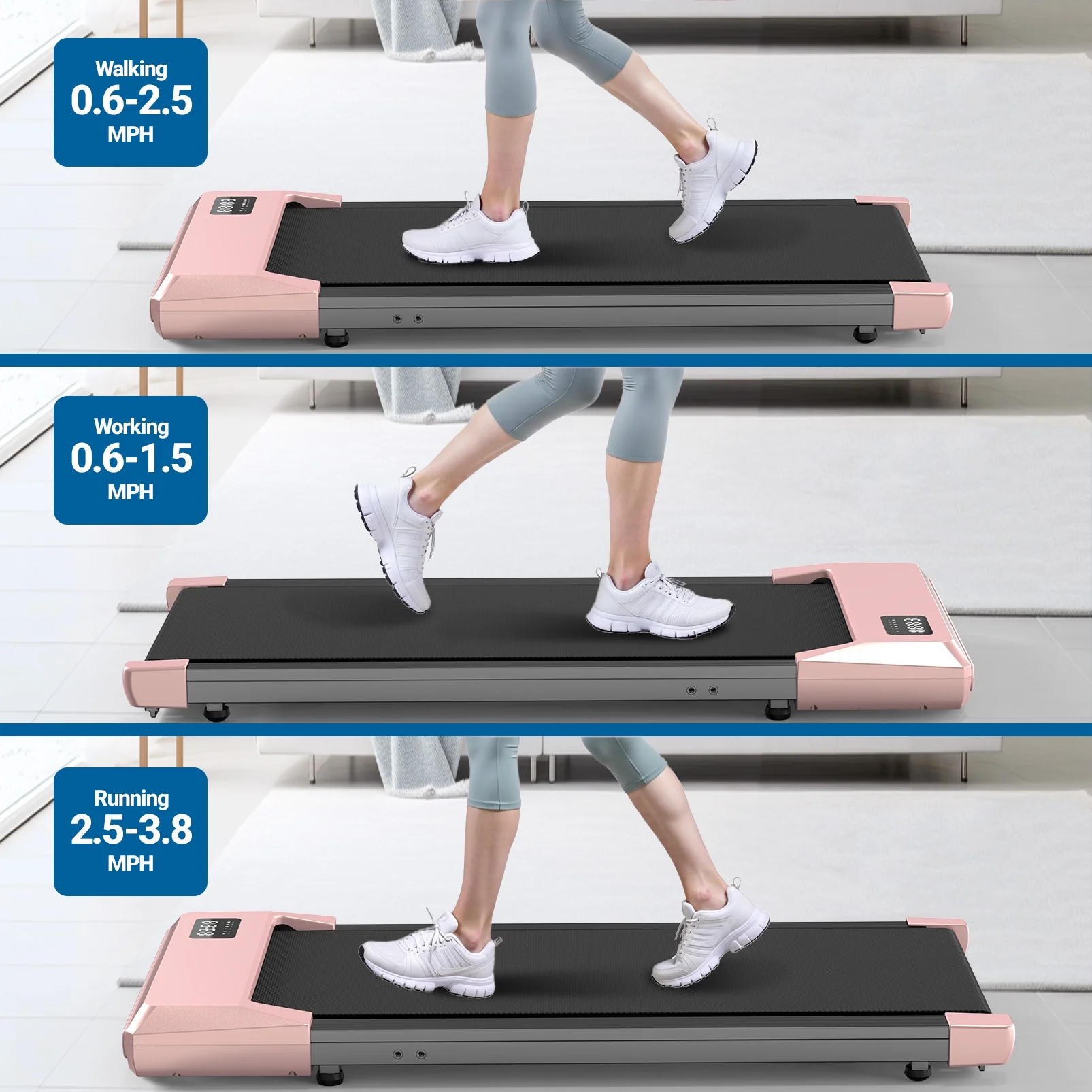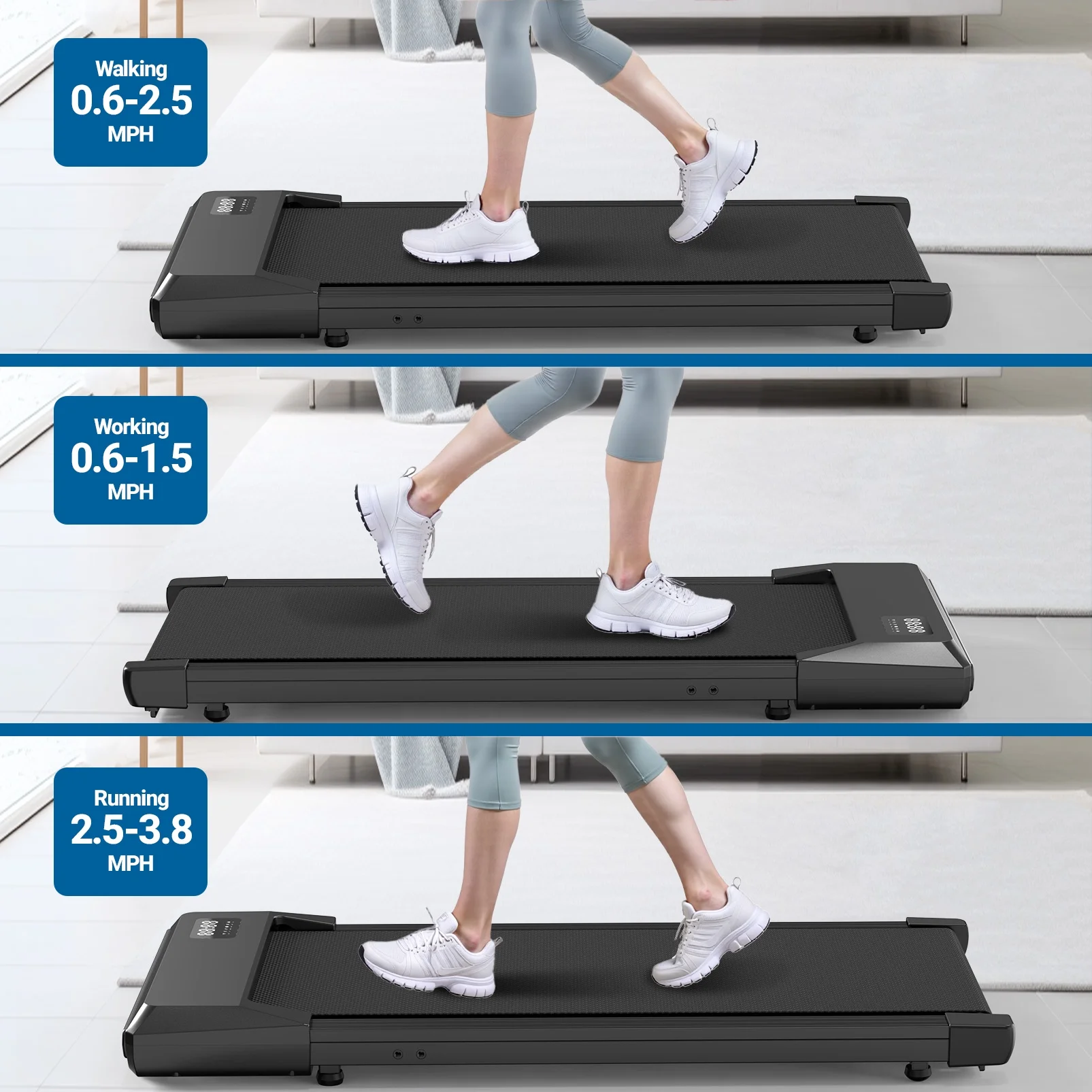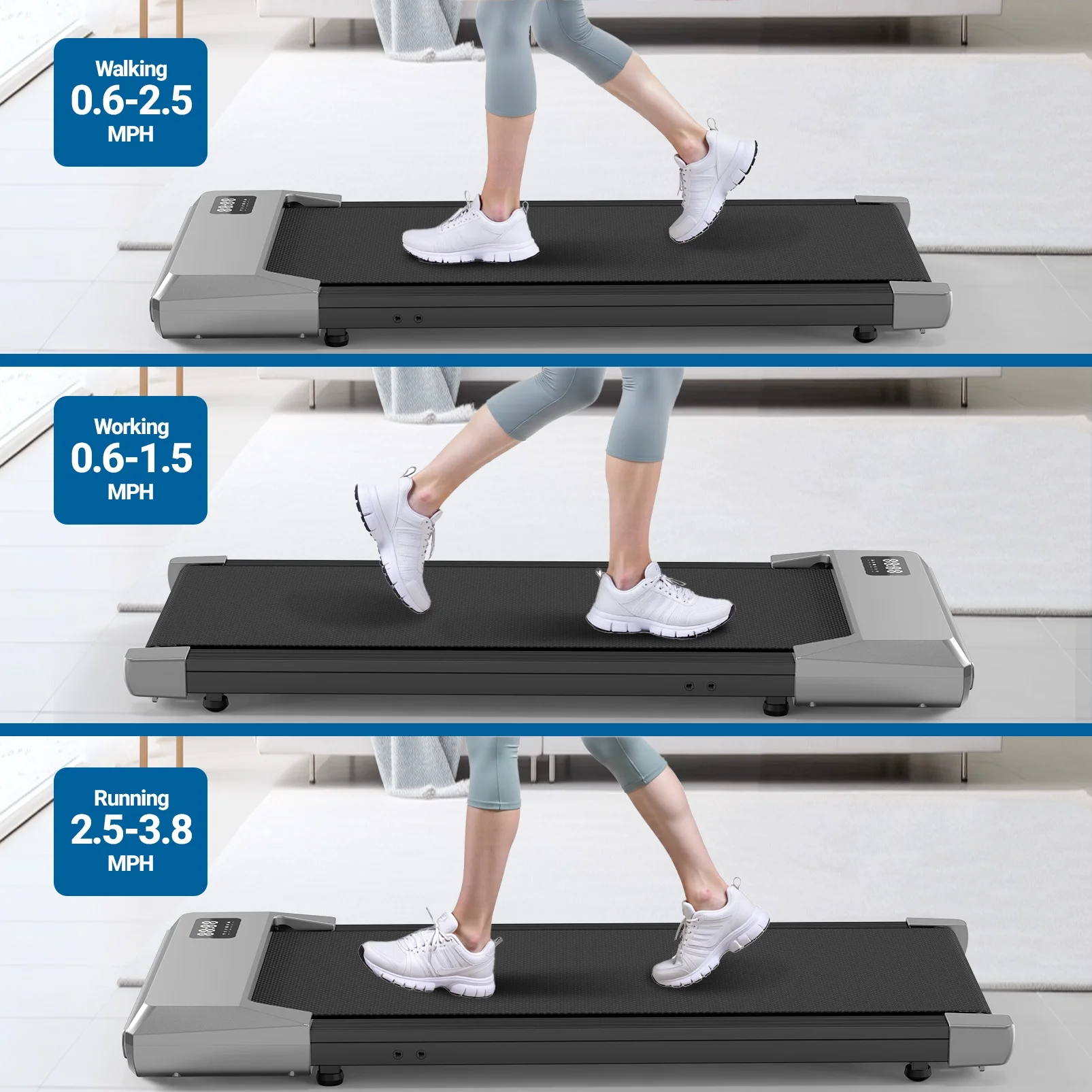 - Powerful & Quiet Motor--The 2.5HP motor enables our under desk treadmill to provide a speed of 0.6~2.5 and a maximum capacity of 265 pounds, while keeping the noise below 50 decibels. Provides a smooth and near-silent workout experience, ideal for both work and leisure.