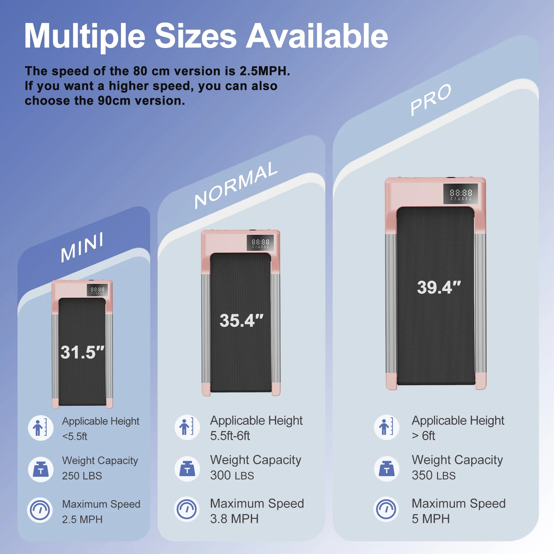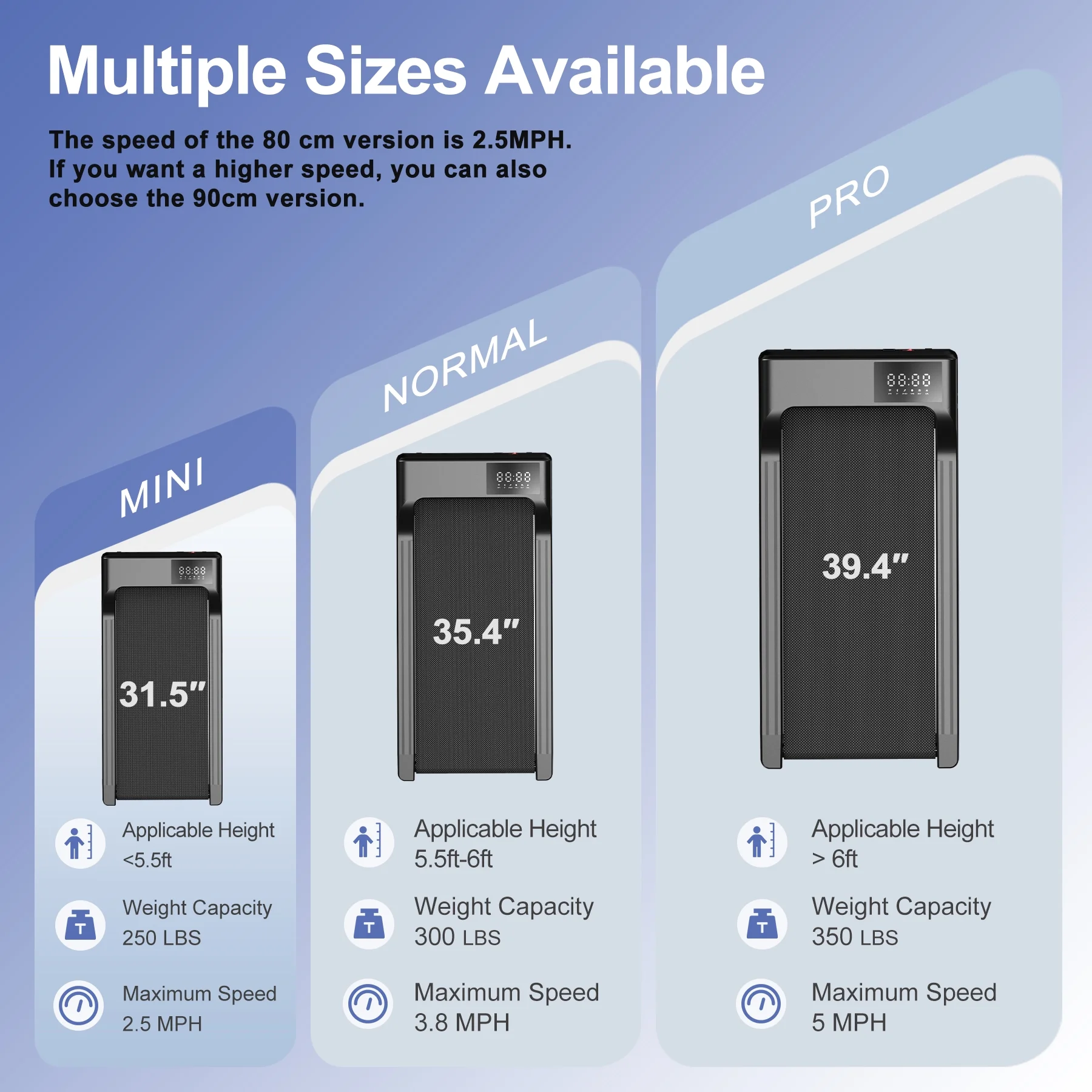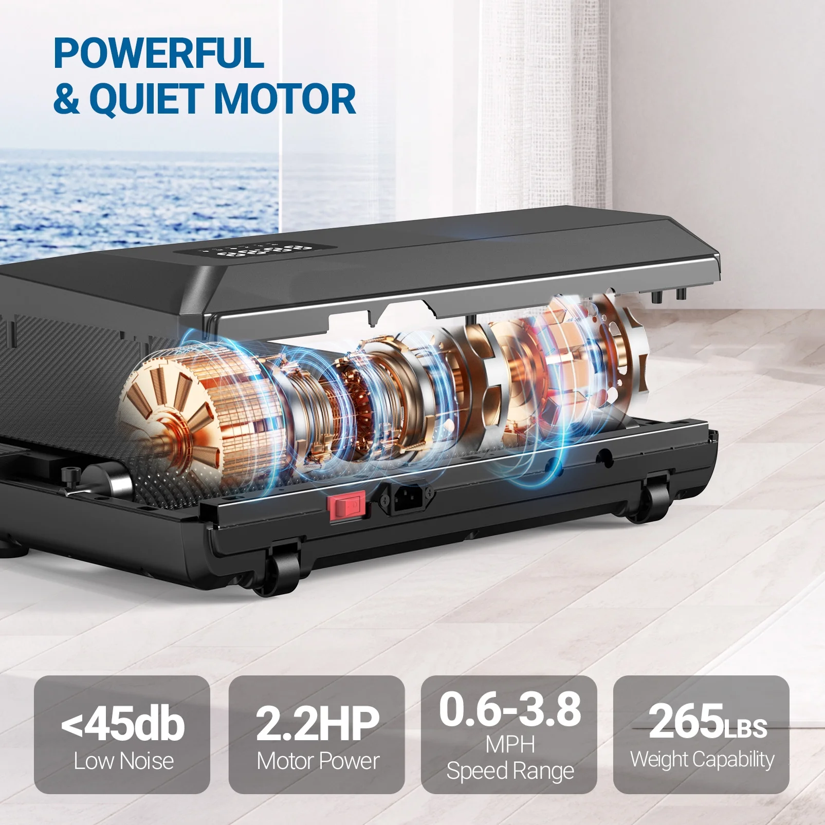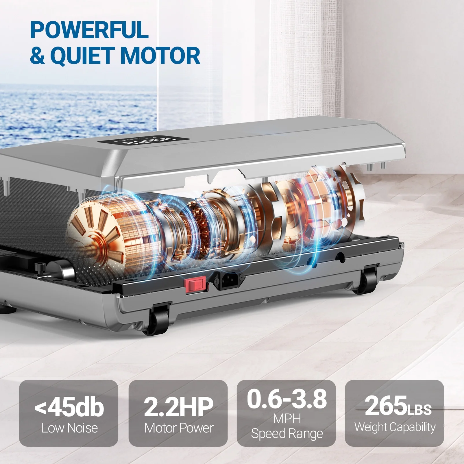 - Powerful & Quiet Motor--The 2.5HP motor enables our under desk treadmill to provide a speed of 0.6~2.5 and a maximum capacity of 265 pounds, while keeping the noise below 50 decibels. Provides a smooth and near-silent workout experience, ideal for both work and leisure.