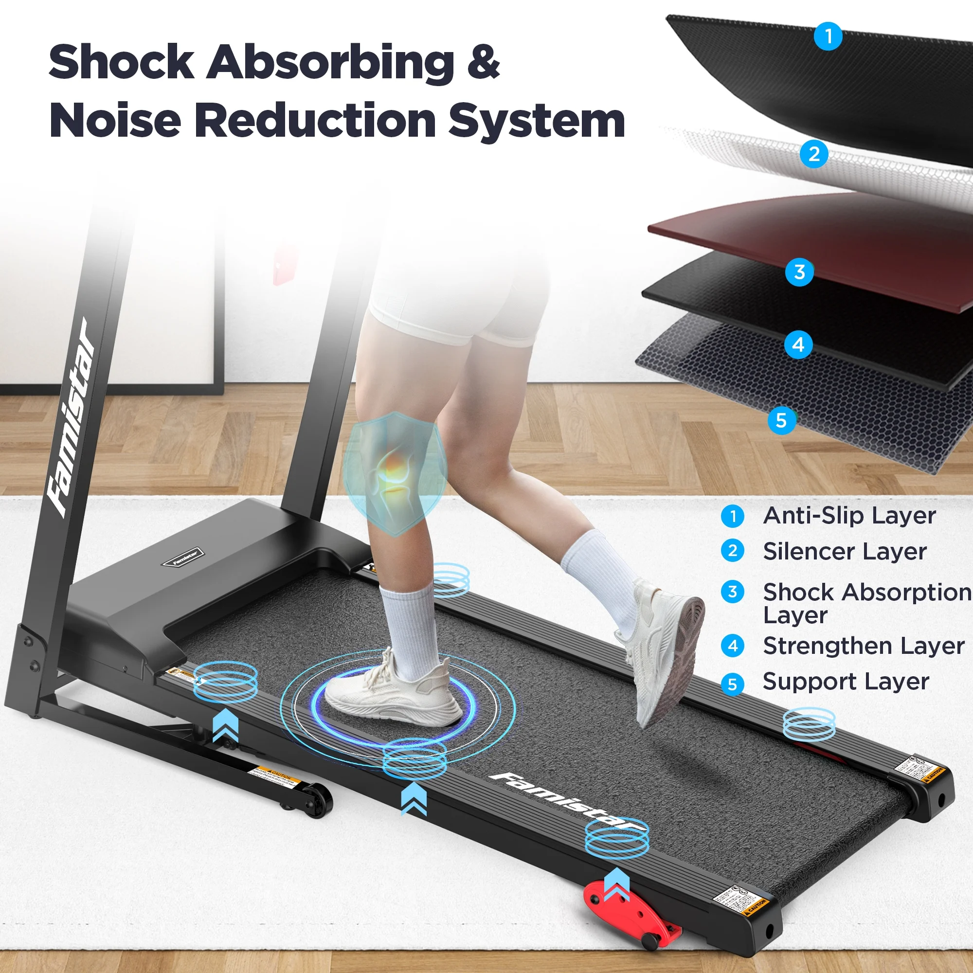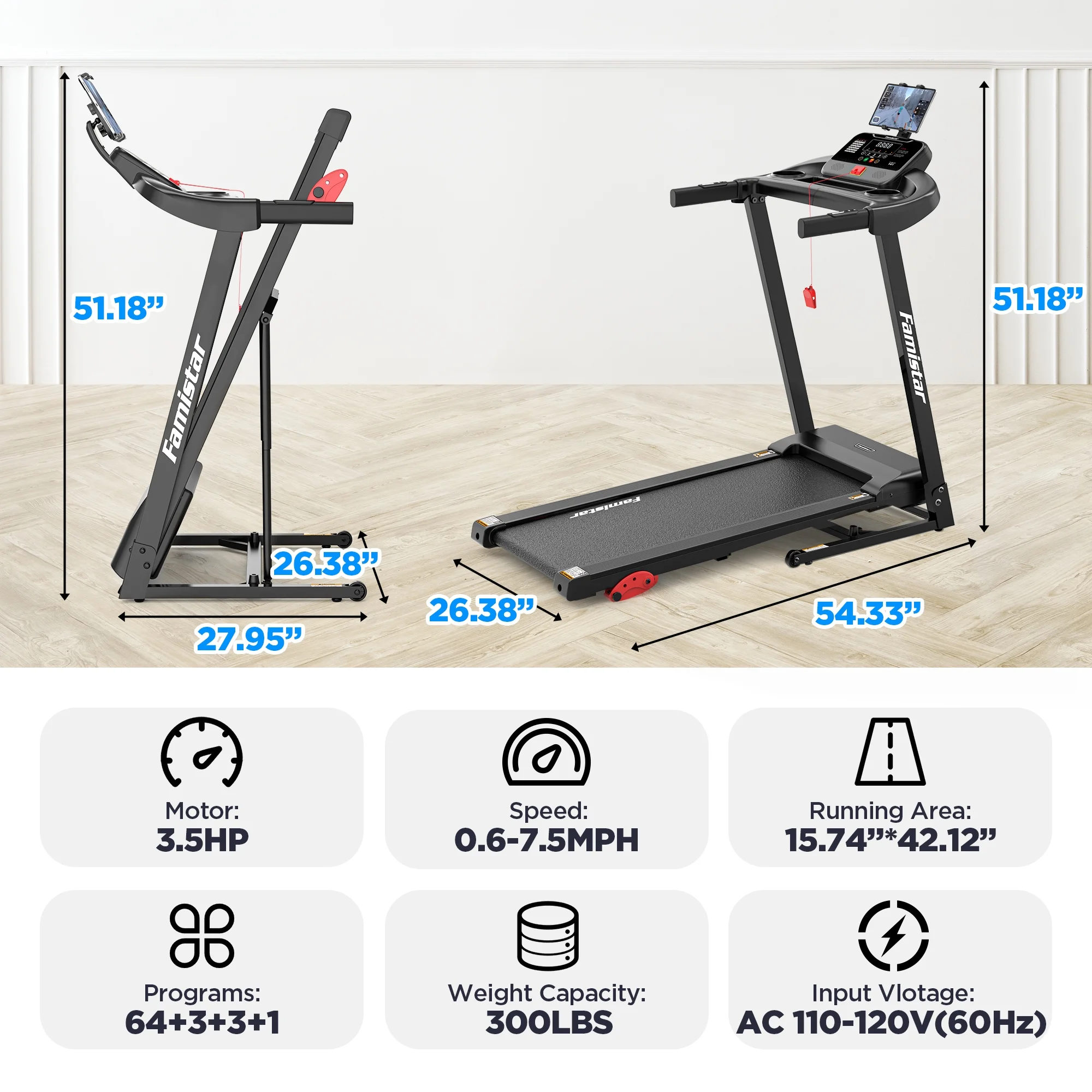 - Comparing to the same level treadmills on the market, this Famistar treadmill comes to the top. It features Quite 3.5HP Motor, Up to 7.5MPH Speed, Max 300lbs Weight Capacity, 64 Automatic Programs, as many as 7 kinds of training data monitoring, Bluetooth Speakers and APP Control, cup holders & device holder, etc.