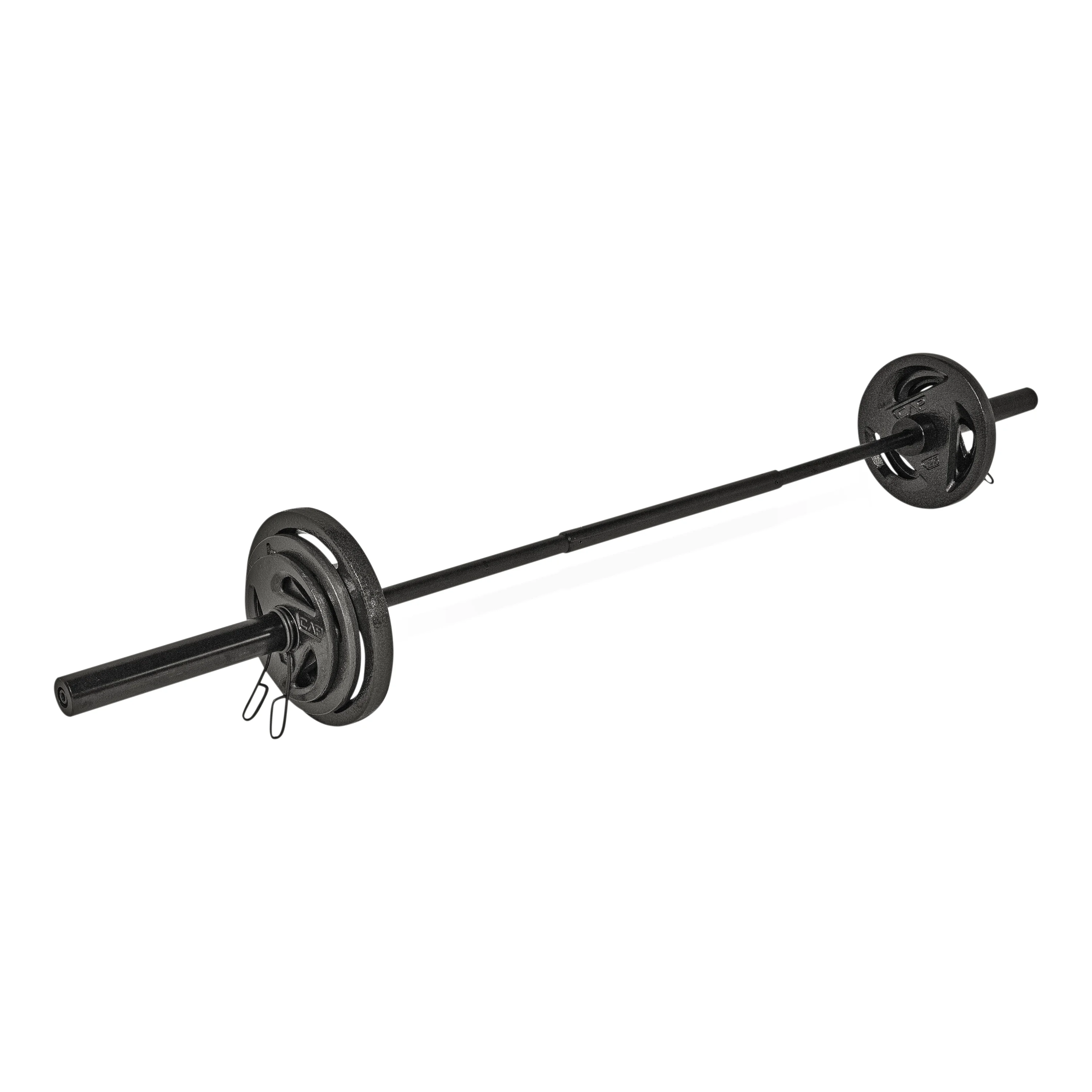 - Includes 7 foot 3-piece Steel Olympic Bar with Two 25-lb weight plates, Two 10-lb weight plates, Two 5-lb weight plates and Teo Spring Clip Collars