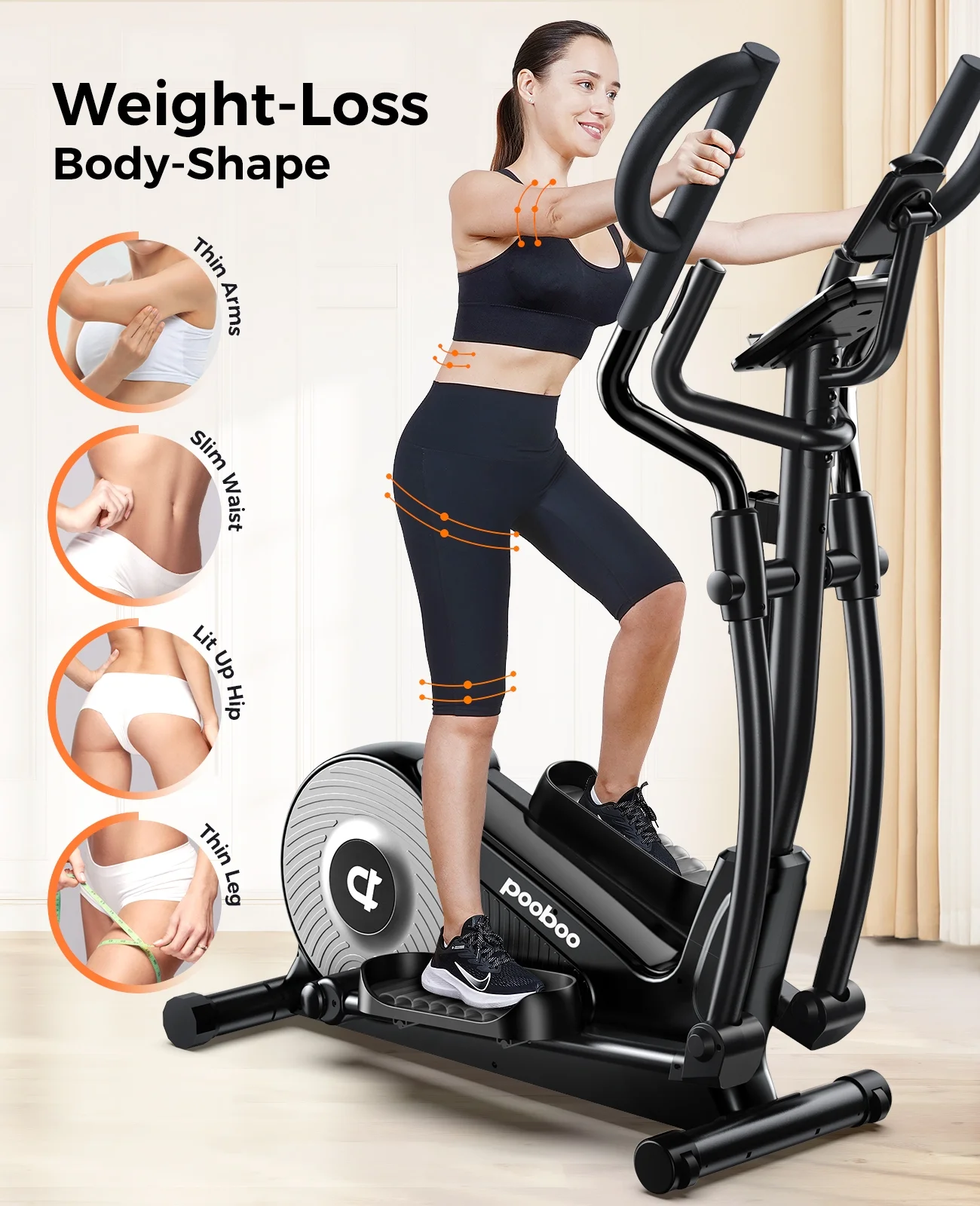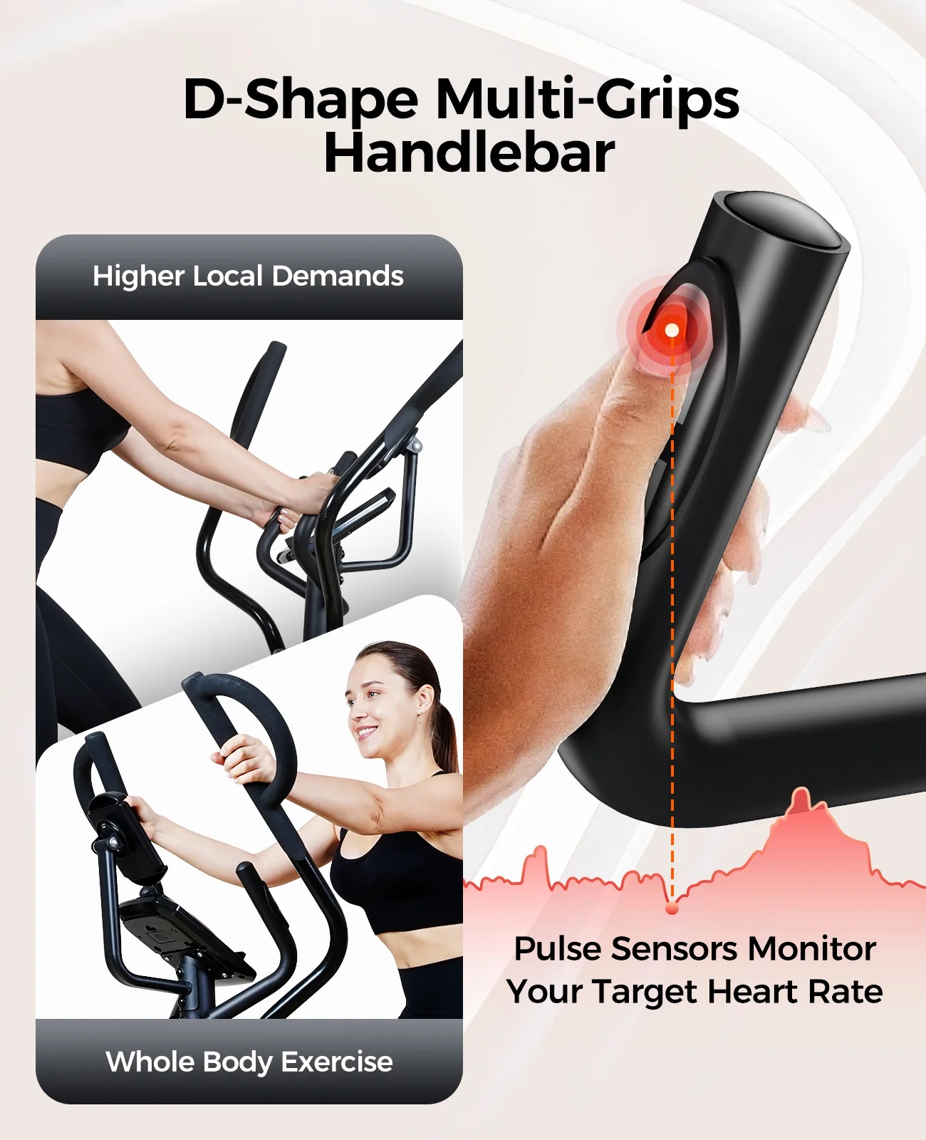 - 【Multi-function Exercise Handle Position】Unlike conventional elliptical machine handles, E399 elliptical machine's handle is adjustable in 3 modes. Combining these 3 modes of training to achieve perfect plasticity effect.1. The Fixed Low Position mainly exercises the buttock.2. The D-shape Wide Outer Position is used to exercise the arms.3. The D-shape Wide Inner Position exercises the waist and back.