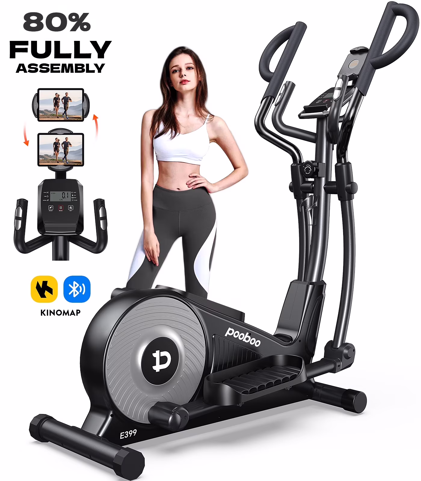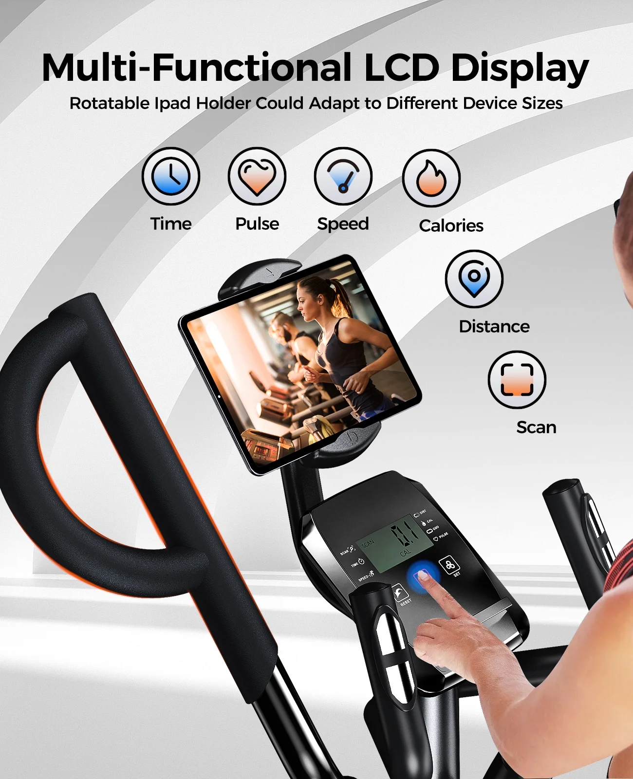 - 【Large Monitor and Rotatable Tablet Holder】The advanced LCD display shows your SCAN, TIME, SPEED, DISTANCE, CALORIES, PULSE, and ODO. In addition, E399 elliptical machine is designed with a rotatable tablet holder which could rotate horizontally and vertically. The stand can accommodate an 11.8-inch tablet screen, you can use your smart device to watch programs or follow exercise programs.