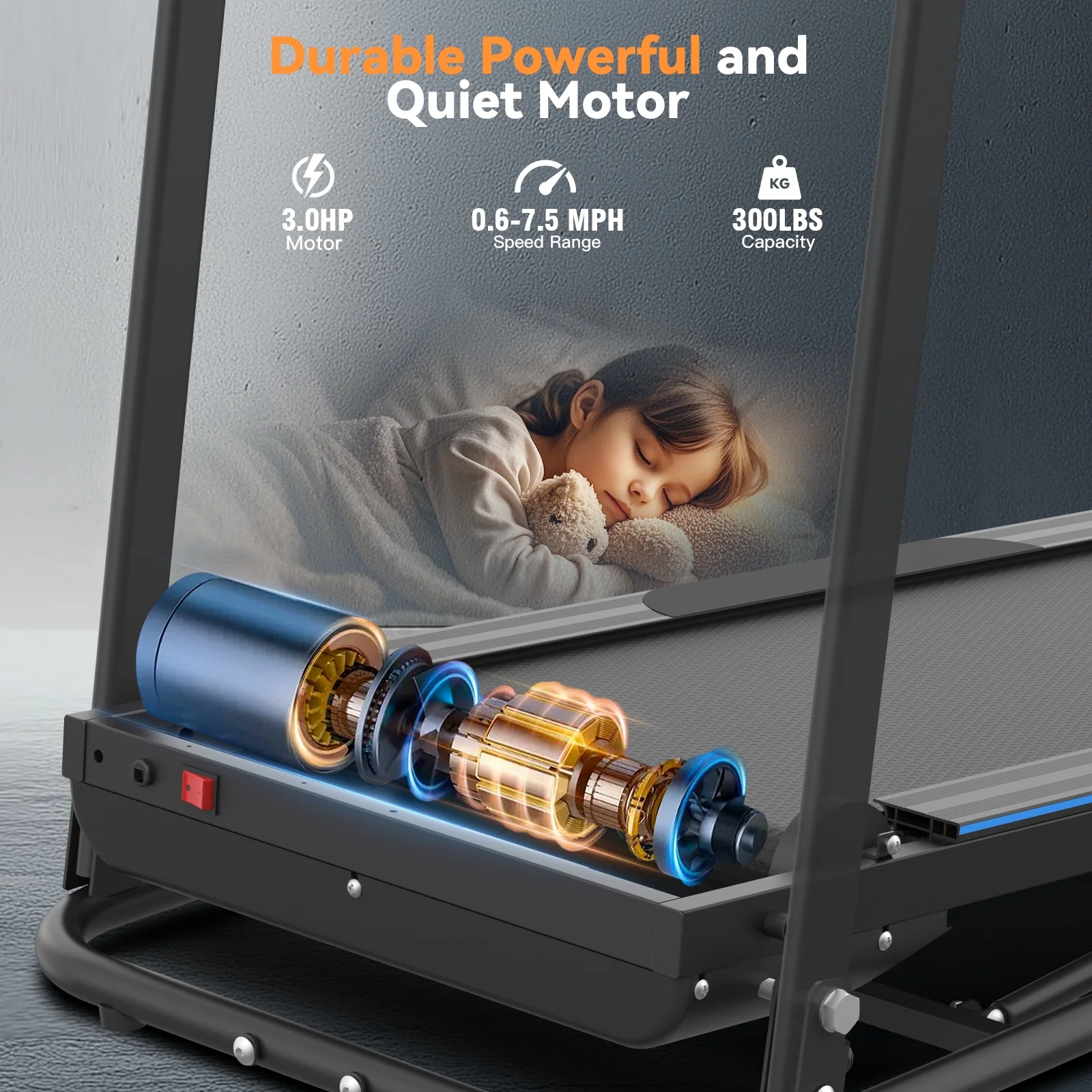 【Quiet and Powerful Motor】This folding treadmill is equipped with a 3.0-horsepower motor, a thickened running deck, and a 300-pound load capacity, ensuring stability and durability. It offers a speed range of 0.6-7.5 mph. A soft descent system and transport wheels make it easy to fold and move. It's ideal for small apartments or homes with limited space.