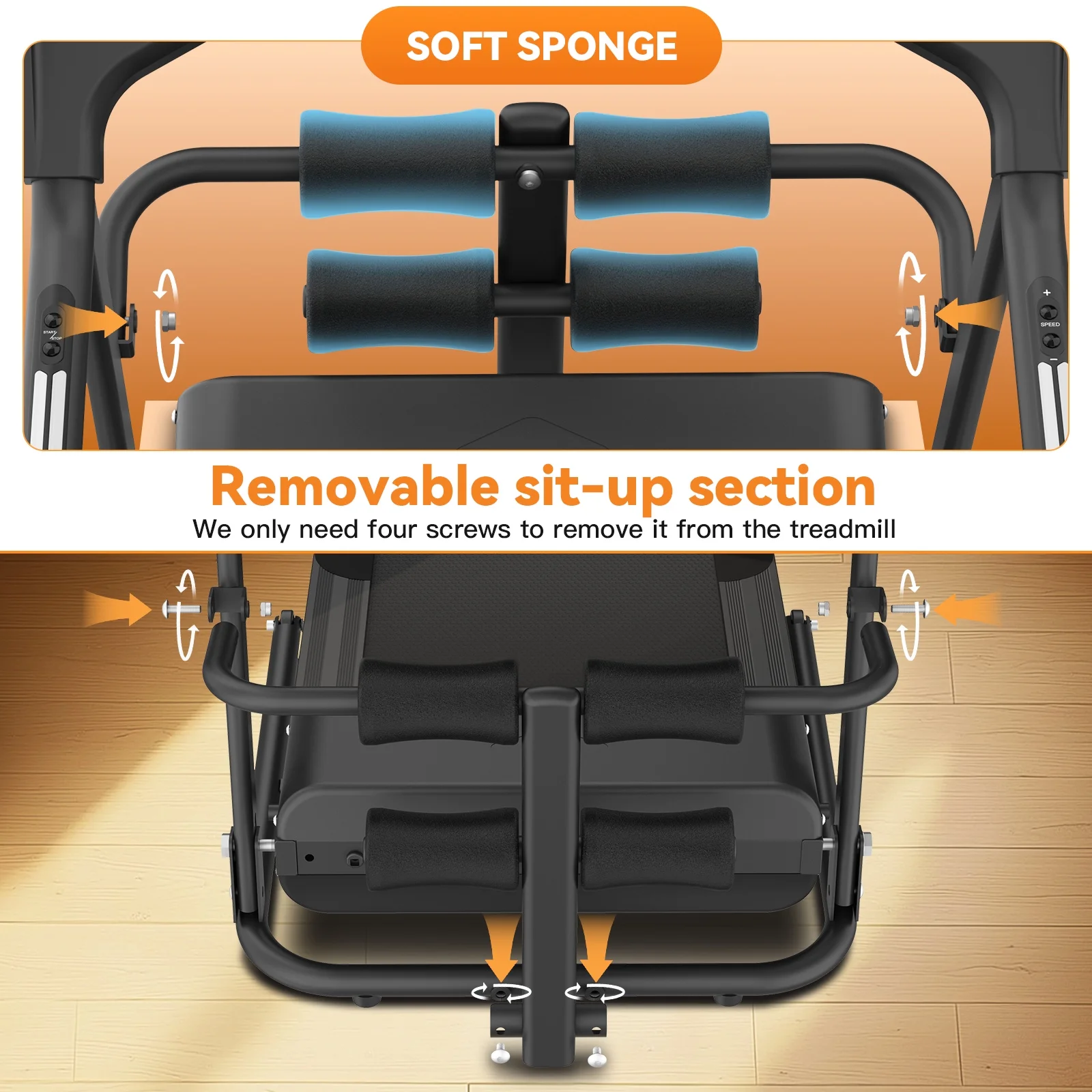 【Sit-Up Function】This treadmill with a sit-up attachment satisfies your abdominal muscle needs. Sit-ups strengthen core muscles, stabilize the torso, and improve flexibility and elasticity in the abdominal and back muscles.