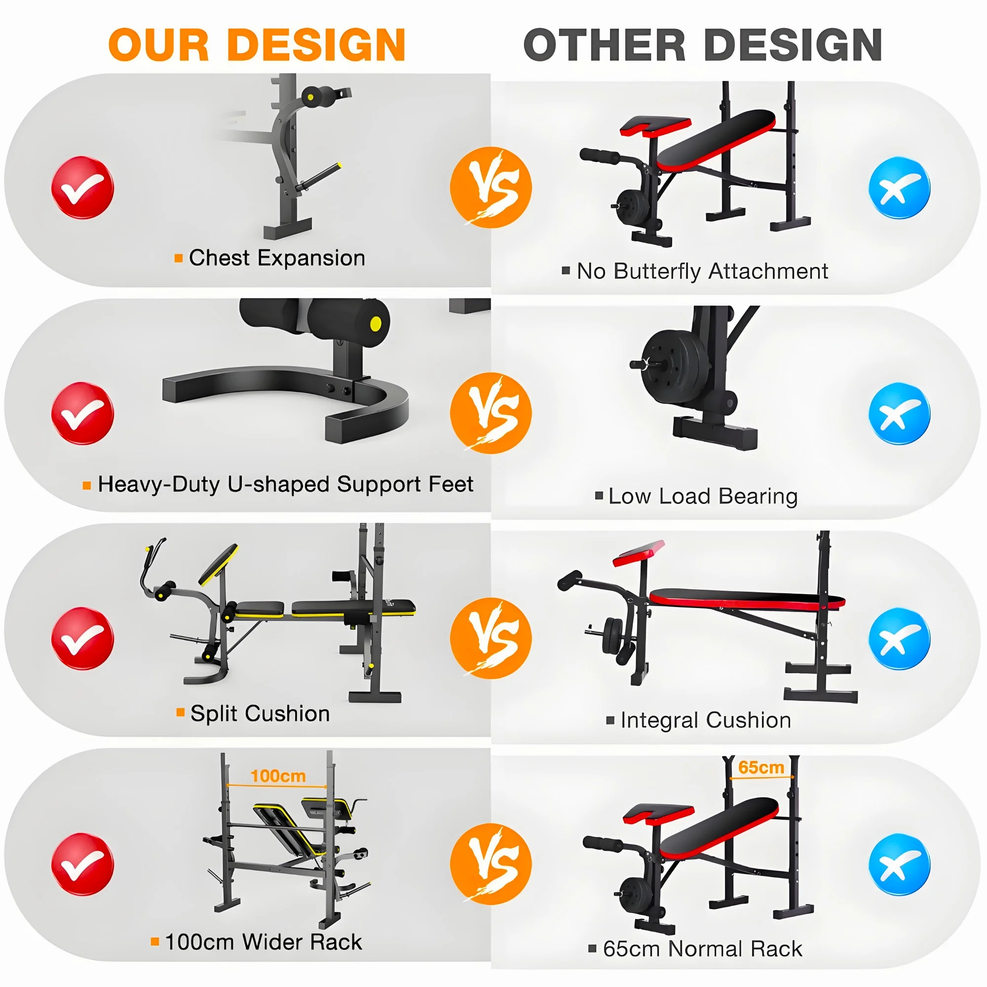 - �? in 1 workout bench】:Blacksmith Multifunctional Gym Bench is designed to leg extension, bench press, sit-ups, preacher curl, chest expansion, deep squat. Equipped with squat rack, leg extension, preacher curl and butterfly arms. Fully exercise legs, back, chest, abs, shoulders, arms by 1 machine, meets all fitness needs.