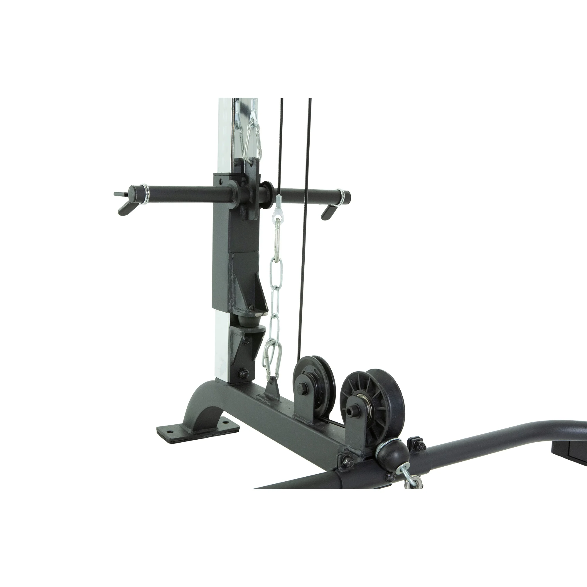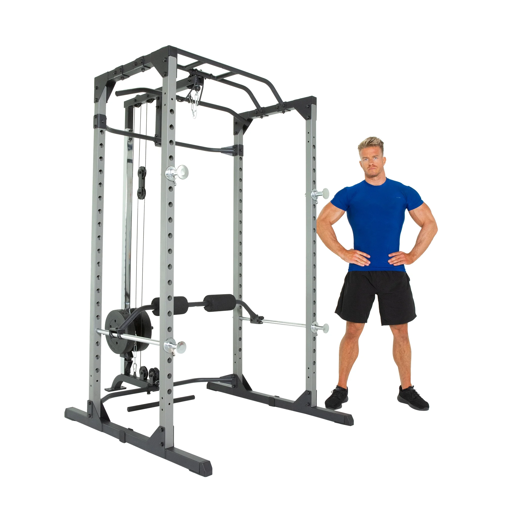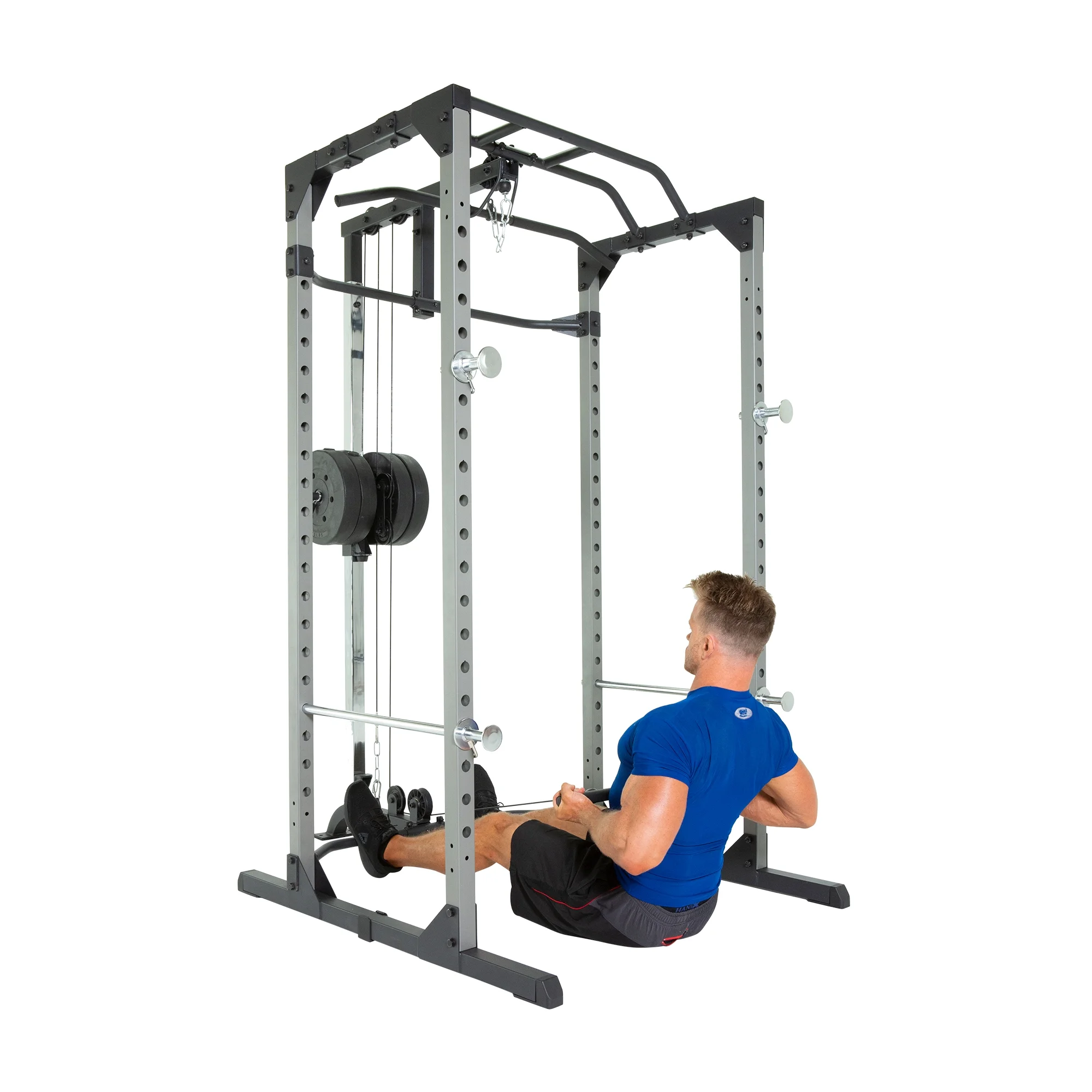 - Extended lower rear crossbar provides extra space for fitting in benches and footrests for seated row exercises