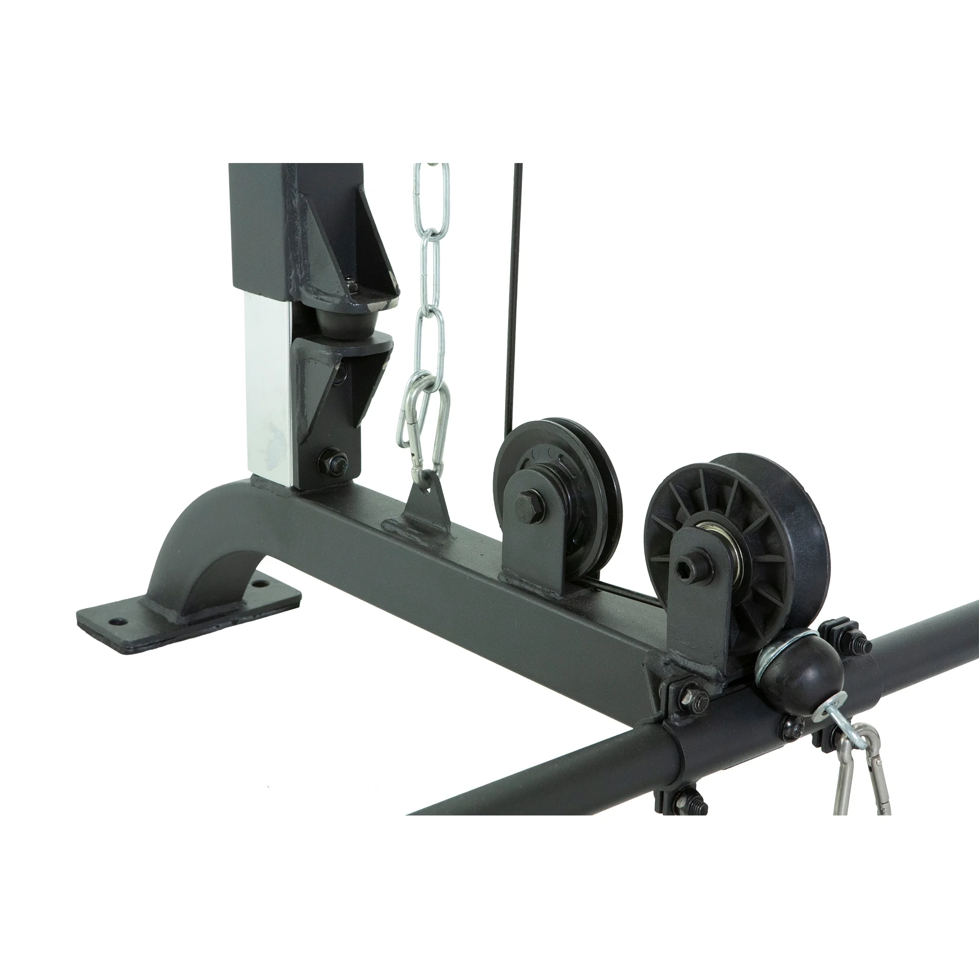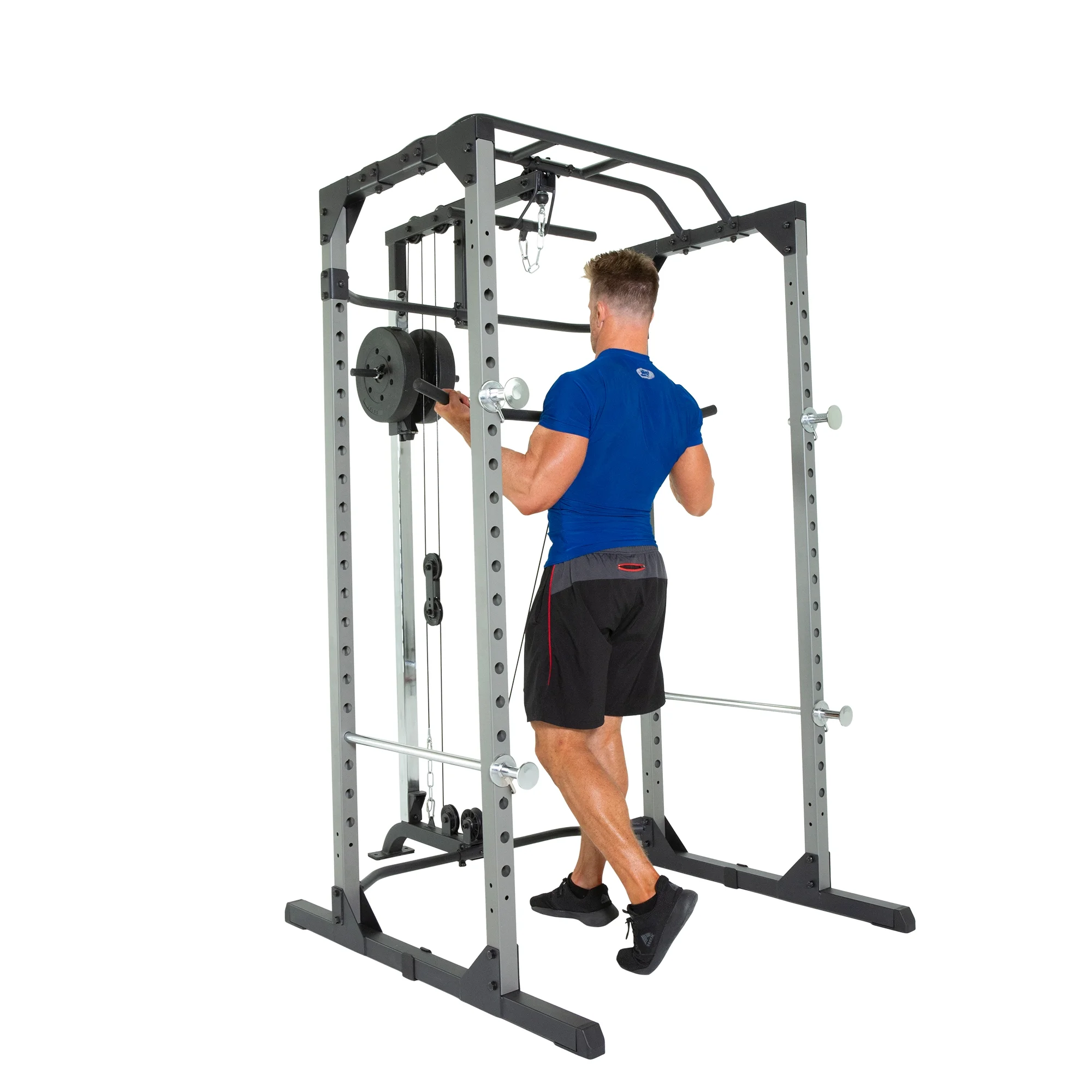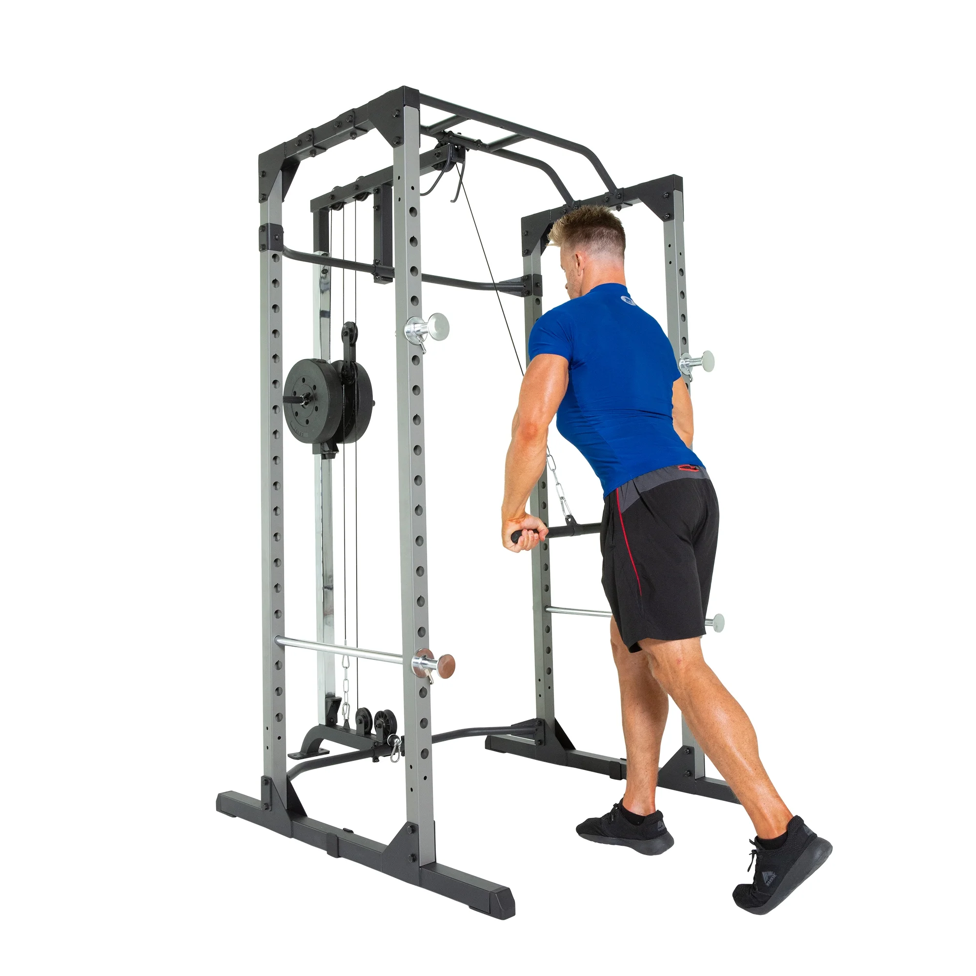 - Extended lower rear crossbar provides extra space for fitting in benches and footrests for seated row exercises