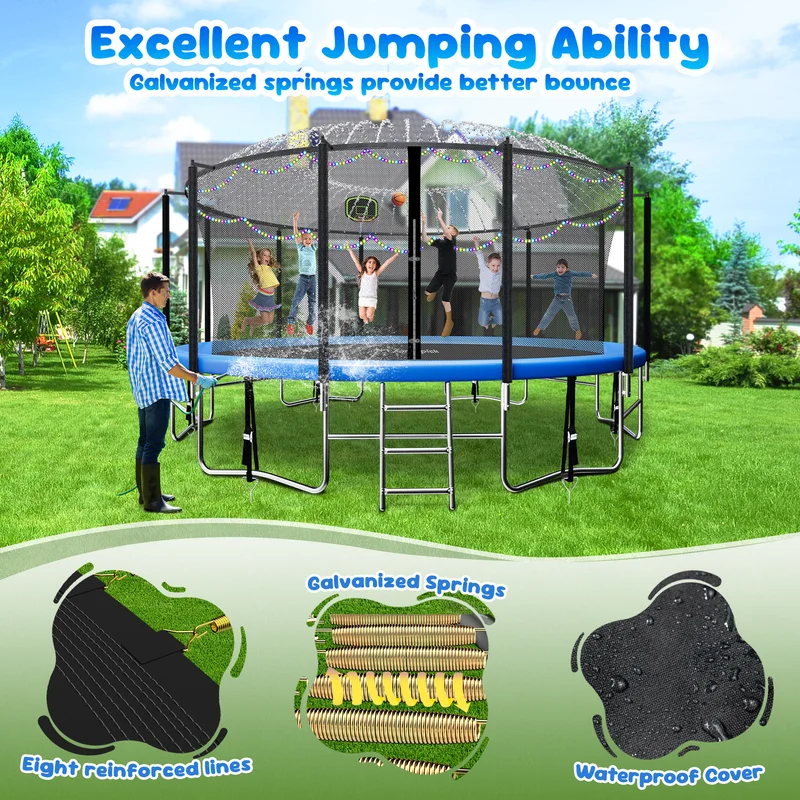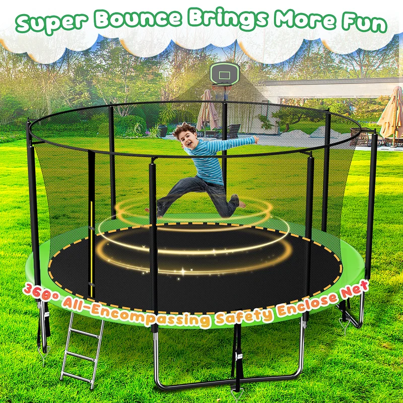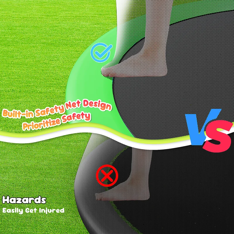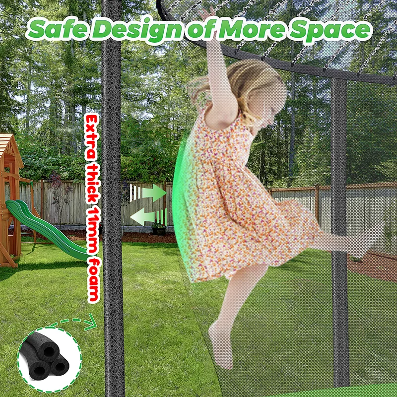 6 W-shaped legs provide 12 balanced points, upgraded T-shaped joint ensures the tight connection of the trampoline structure, to increase the stability of the trampoline. 64 inches height anti-UV high-density trampoline safety enclosure, the thickened foam sleeve, all the springs are covered with thick and durable foam pad is designed to protect the user of your trampoline when bouncing, 12 net poles enhance the stability and safety of this large trampoline.