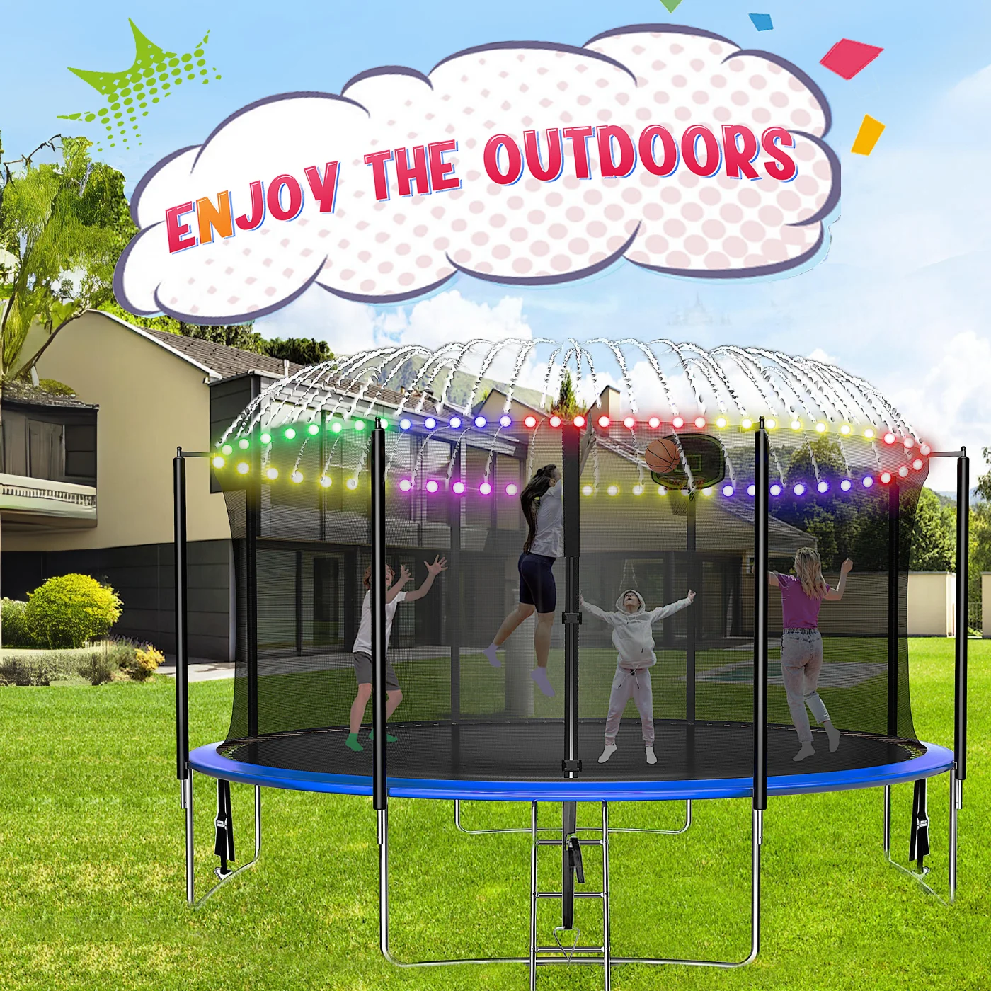 - ��More Extra Free Accessories�� Our outdoor trampoline provides 1* rubber ball & inflator, 1*Sprinkler,1* LED Light,6 pairs of socks,6*wind stakes & straps combination. The wind stakes twist deep into the ground for the highest level of trampoline stability, help protect your trampoline during stormy/windy conditions, safely secure the trampoline to the ground. Strong belt straps easily connect to the steel buckles for fast assembly and disassembly. Playing rubber ball can improve kids' motor coordination, ideal as the best gift for kids.