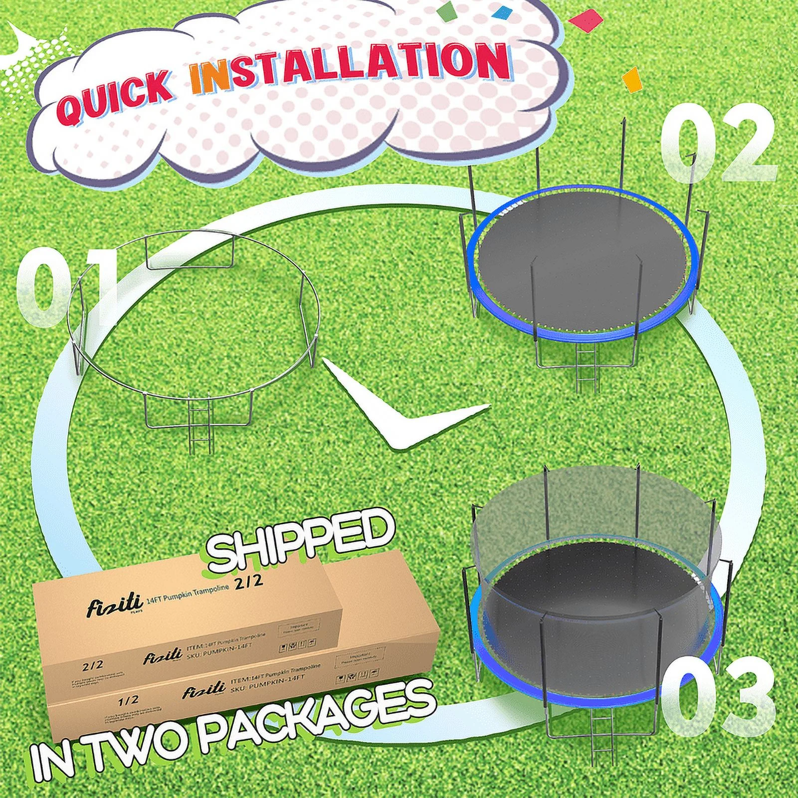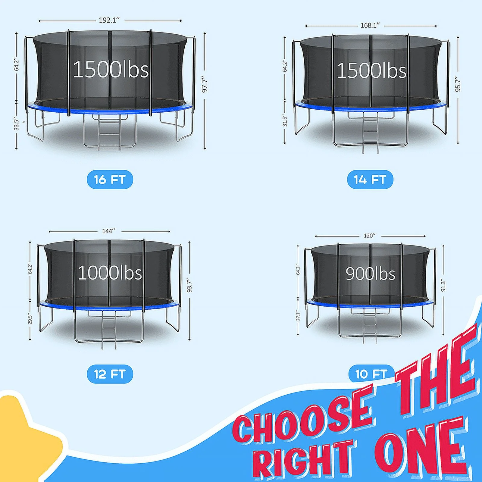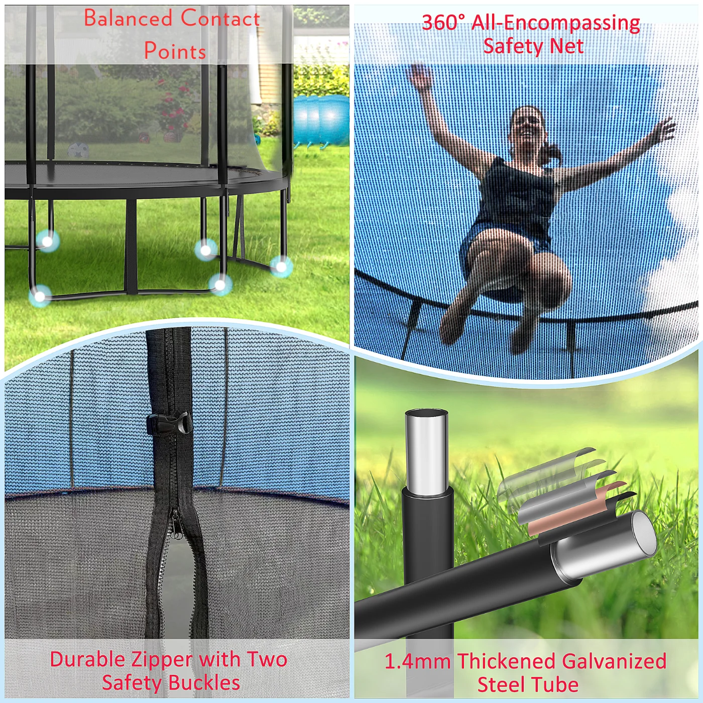 - ��Safety Is Our Priority�� 6 W-shaped legs provide 12 balanced points, upgraded T-shaped joint ensures the tight connection of the trampoline structure, to increase the stability of the trampoline. 64 inches height anti-UV high-density trampoline safety enclosure, the thickened foam sleeve, all the springs are covered with thick and durable foam pad is designed to protect the user of your trampoline when bouncing, 12 net poles enhance the stability and safety of this large trampoline.