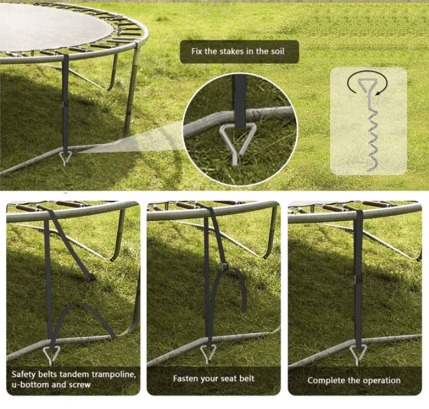 - Installation! We provide professional and detailed instruction, including every step, you can follow the manual. 1. After it is installed, it cannot be lifted at will. 2.In bad weather such as strong winds, please take down the net and pole for safety. 3.In order to avoid bending of the trampoline caused by uneven force, please install the spring from the diagonal line as the starting point. 4.Before installing the spring Need to use wind stakes to fix the top rail to the ground so that the trampoline doesn't tip. 5.When you open the screw package, please put it on the cardboard box, don't scatter it on the grass to avoid losing it.