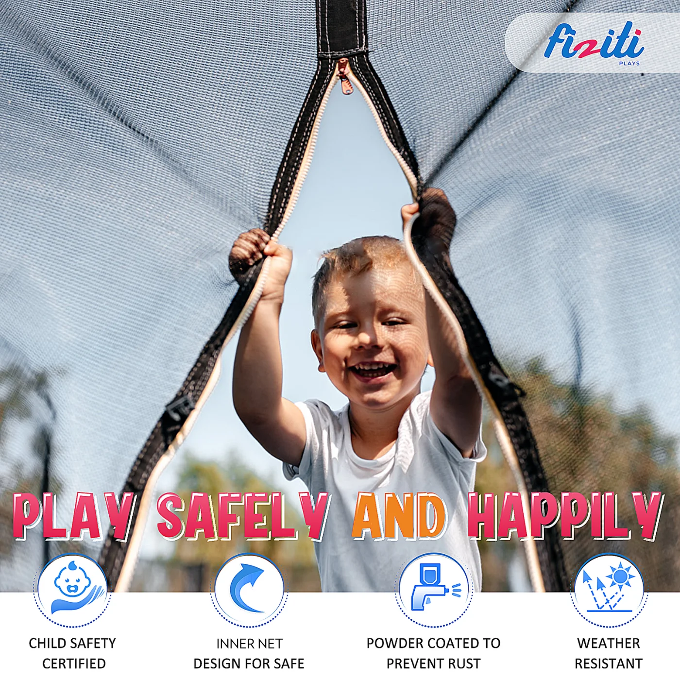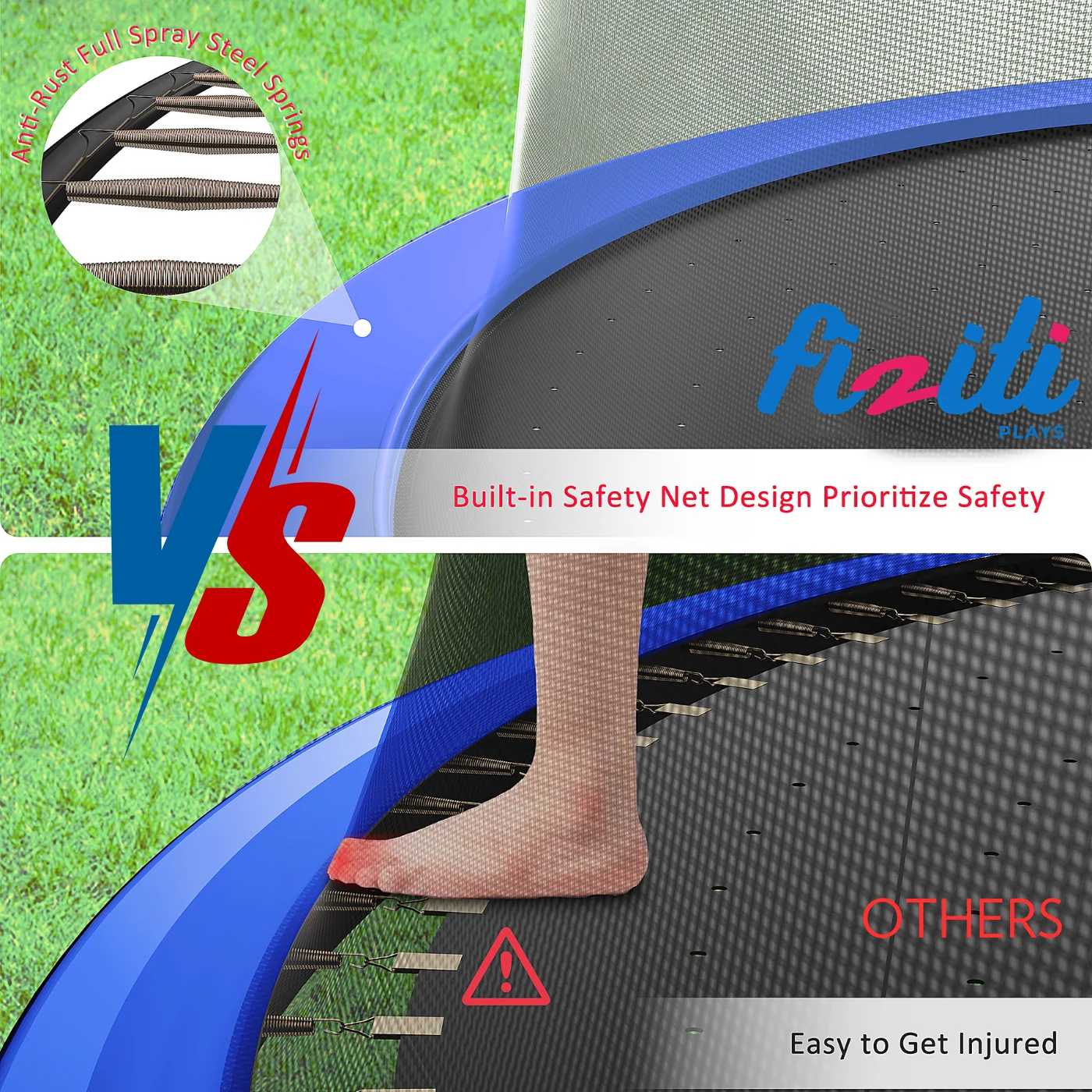 - The backyard trampoline is designed with safety first in mind. For example, the dense enclosure net and the foam-wrapped enclosure poles are conducive to preventing accidental bumps. What's more, the enclosure net and the jumping mat are gap-free, avoiding foot clipping. Premium material and sturdy construction ensure long service life for the outdoor trampoline. The galvanized pipe features great sturdiness, while the UV-protected mat and anti-rust high resilience springs offer a superior rebounding force. In addition, the ladder is designed for convenient and safe climbing. The package includes all tools you need and the installation is easy with detailed instructions.