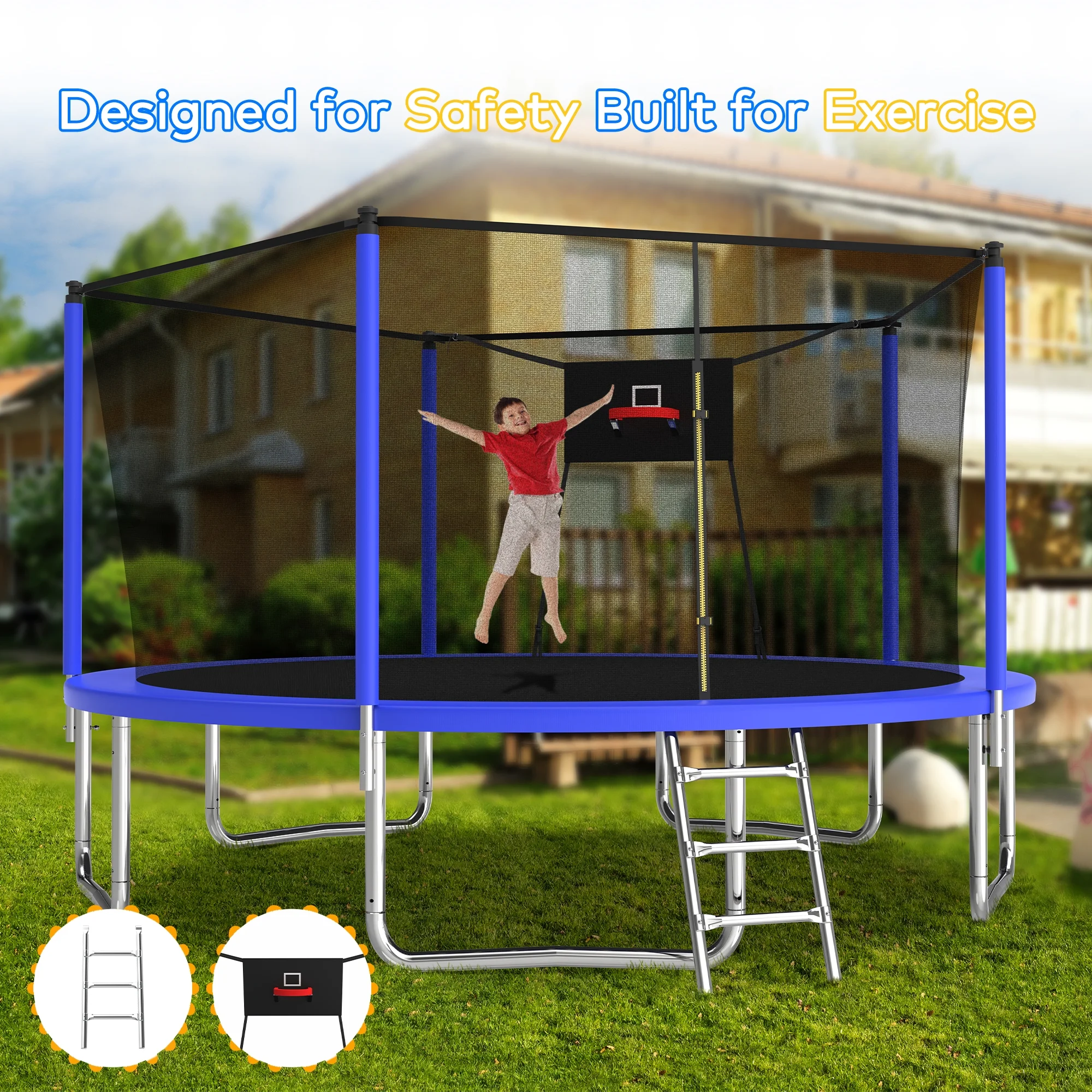 - Solid Structure-5 foam padded poles to support UV-proof safety trampoline enclosure net for maximum safety while jumping. Heavy duty 3-step galvanized steel ladder offers convenient maneuverability in and out of the trampoline.