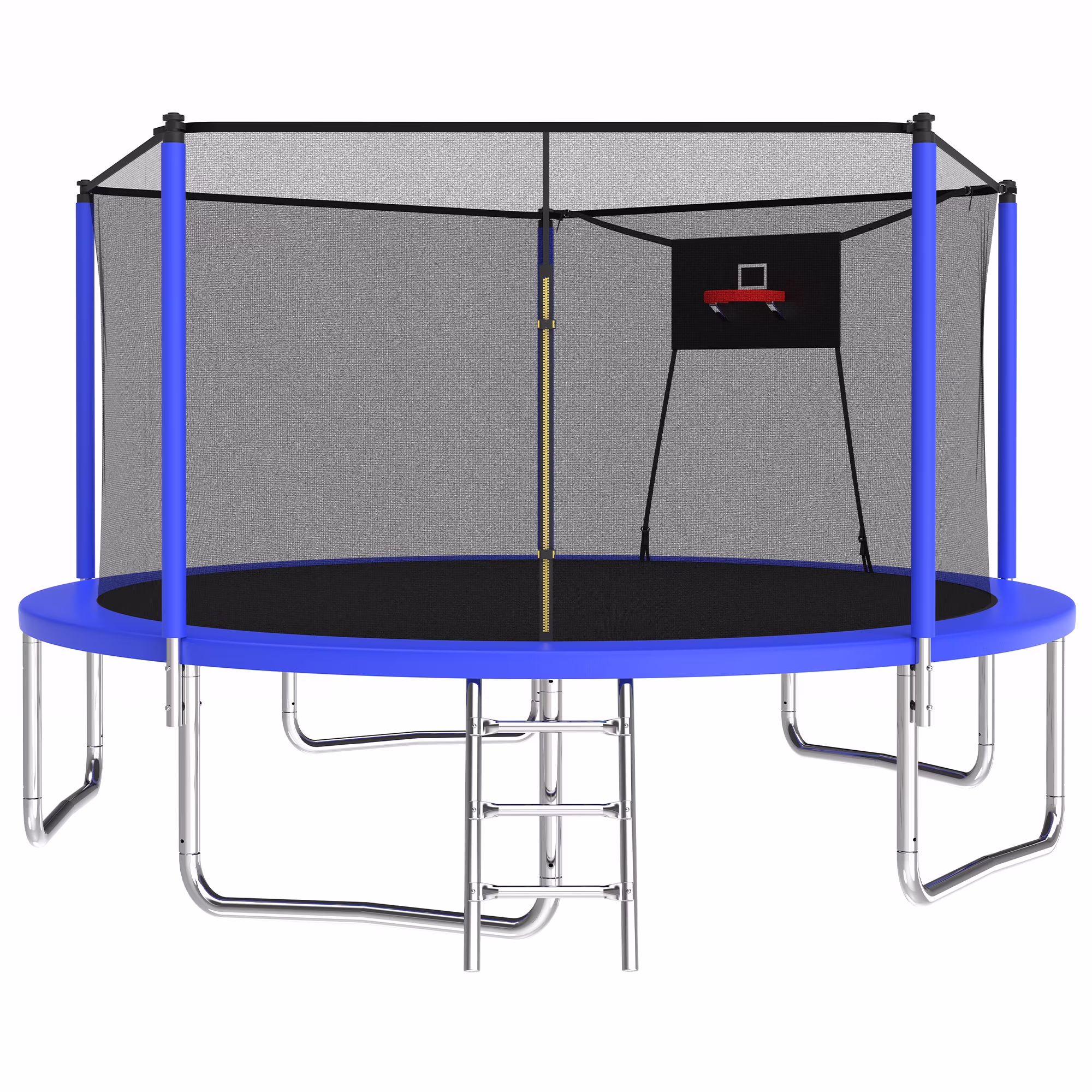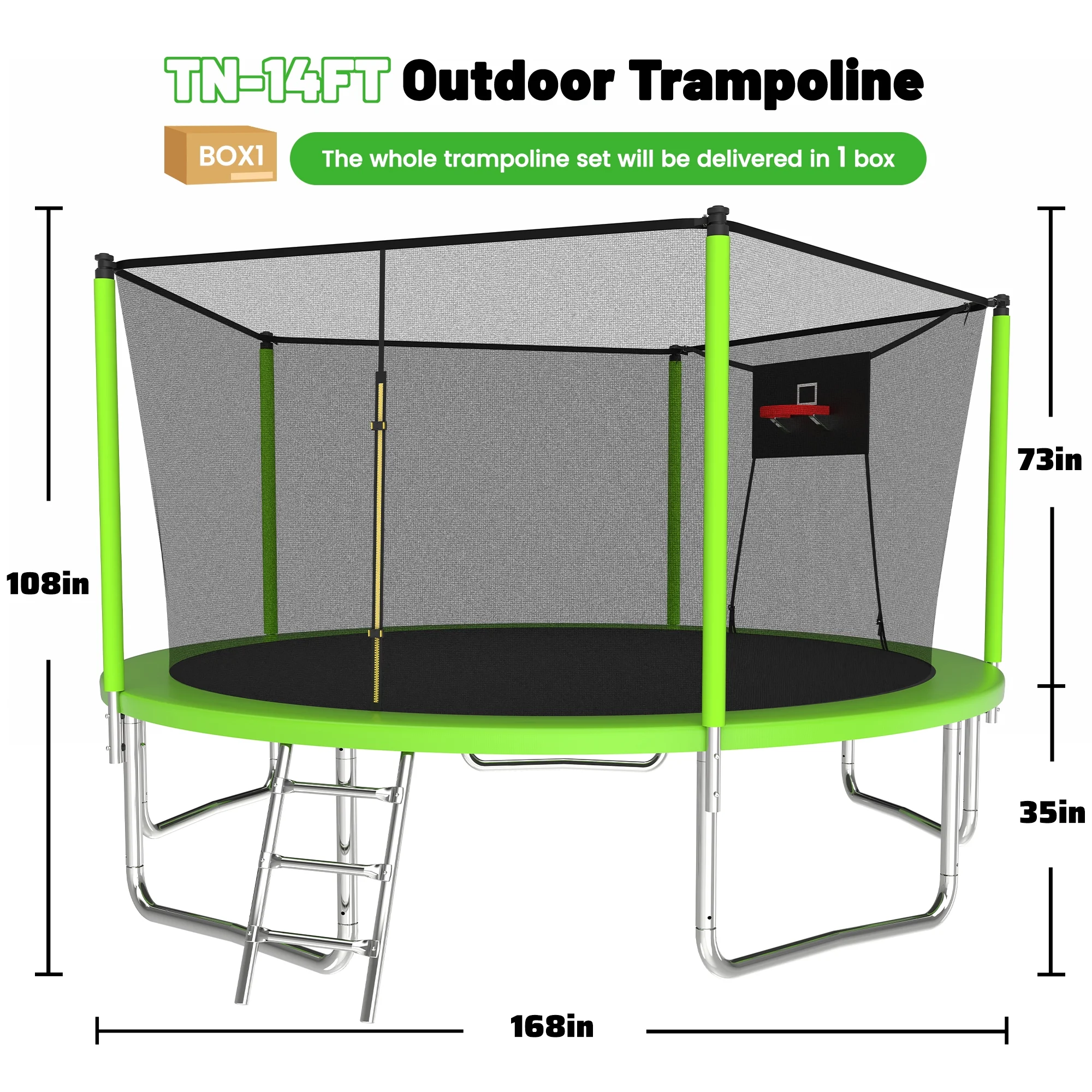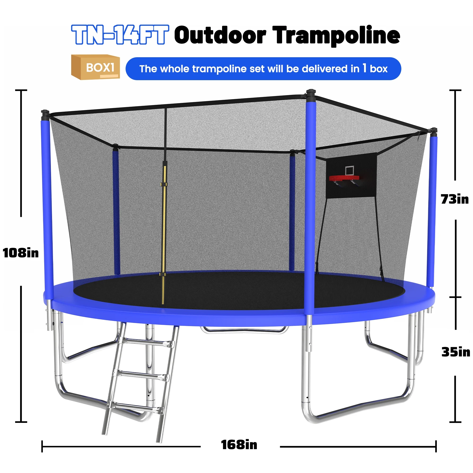 - Safety First-14 FT Trampoline is equipt with 5 high safety enclosure poles and heavy gauge galvanized rust resistance steel construction. 5 W-shaped legs secure stability.