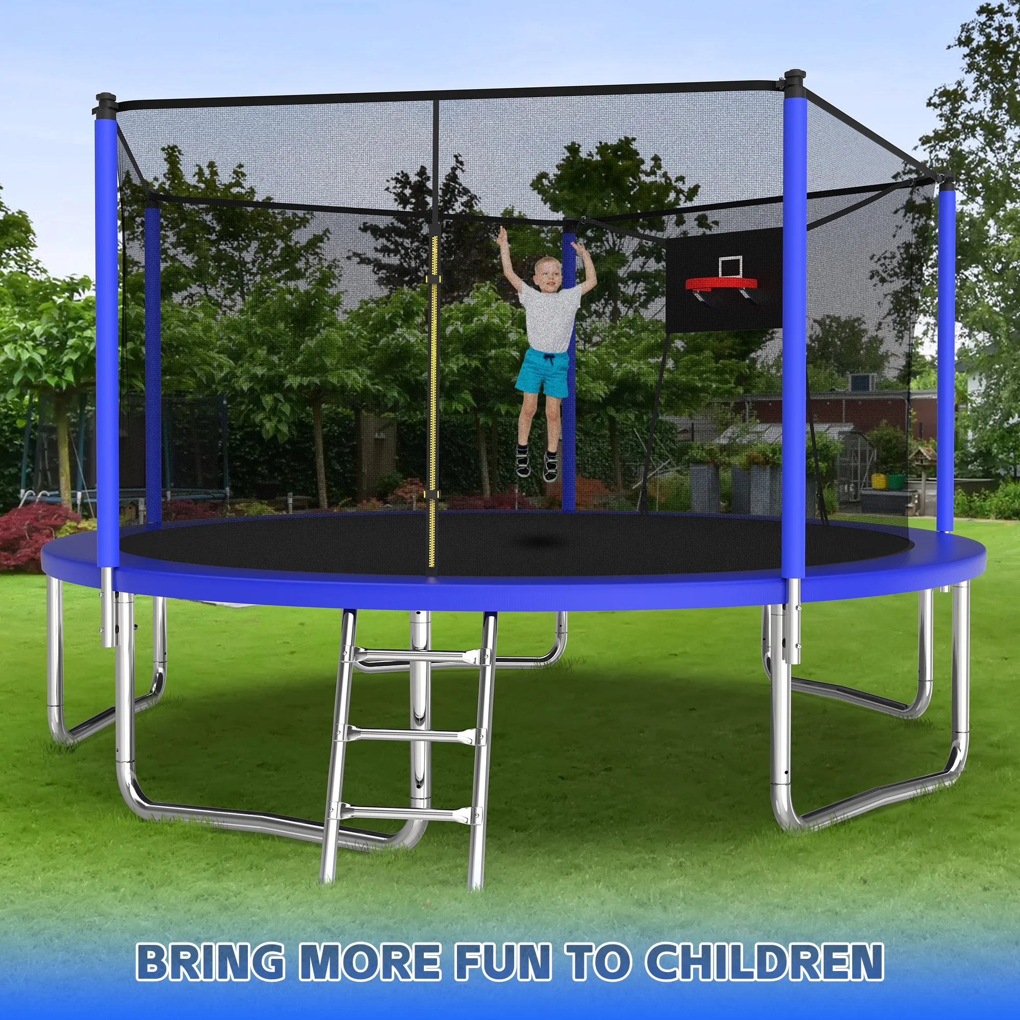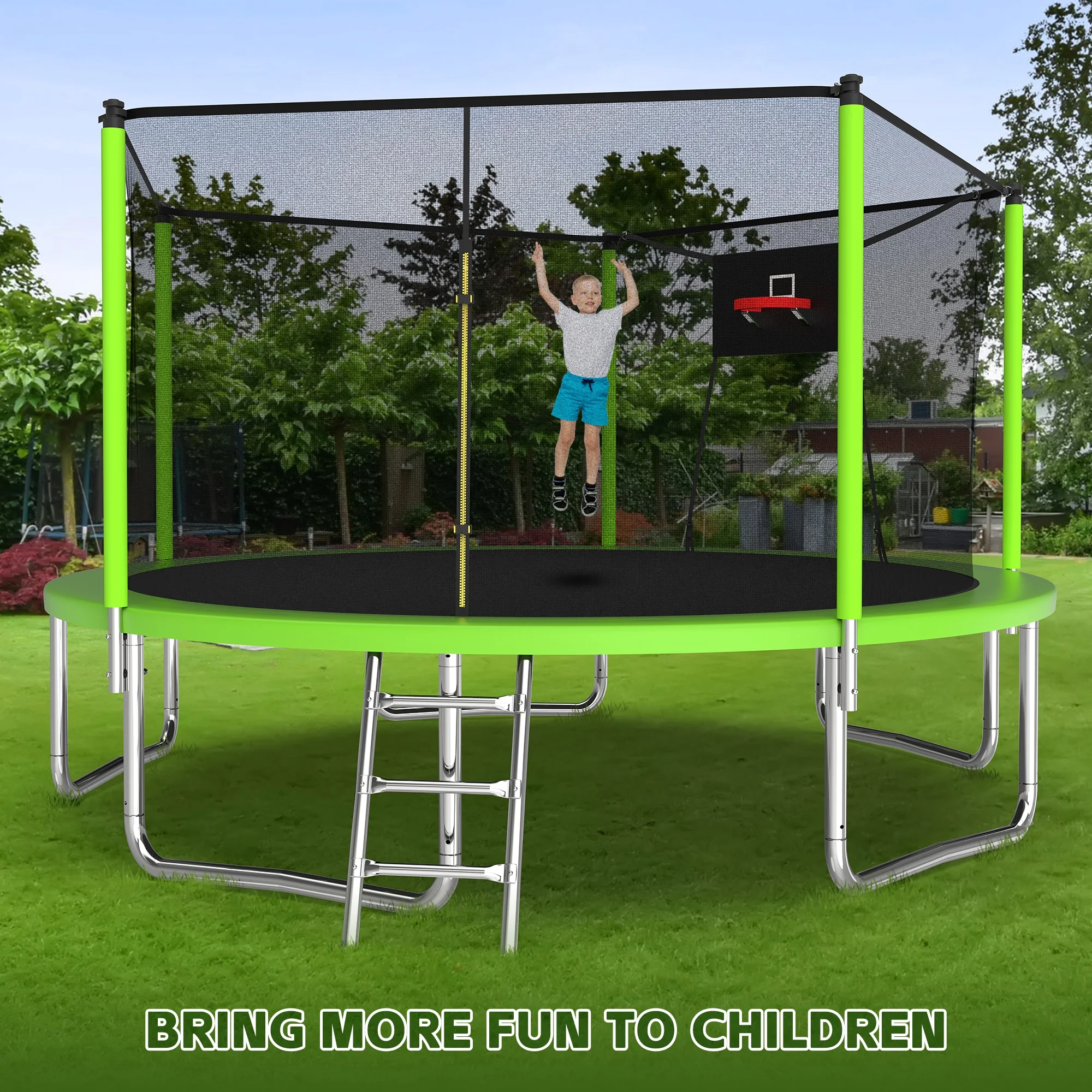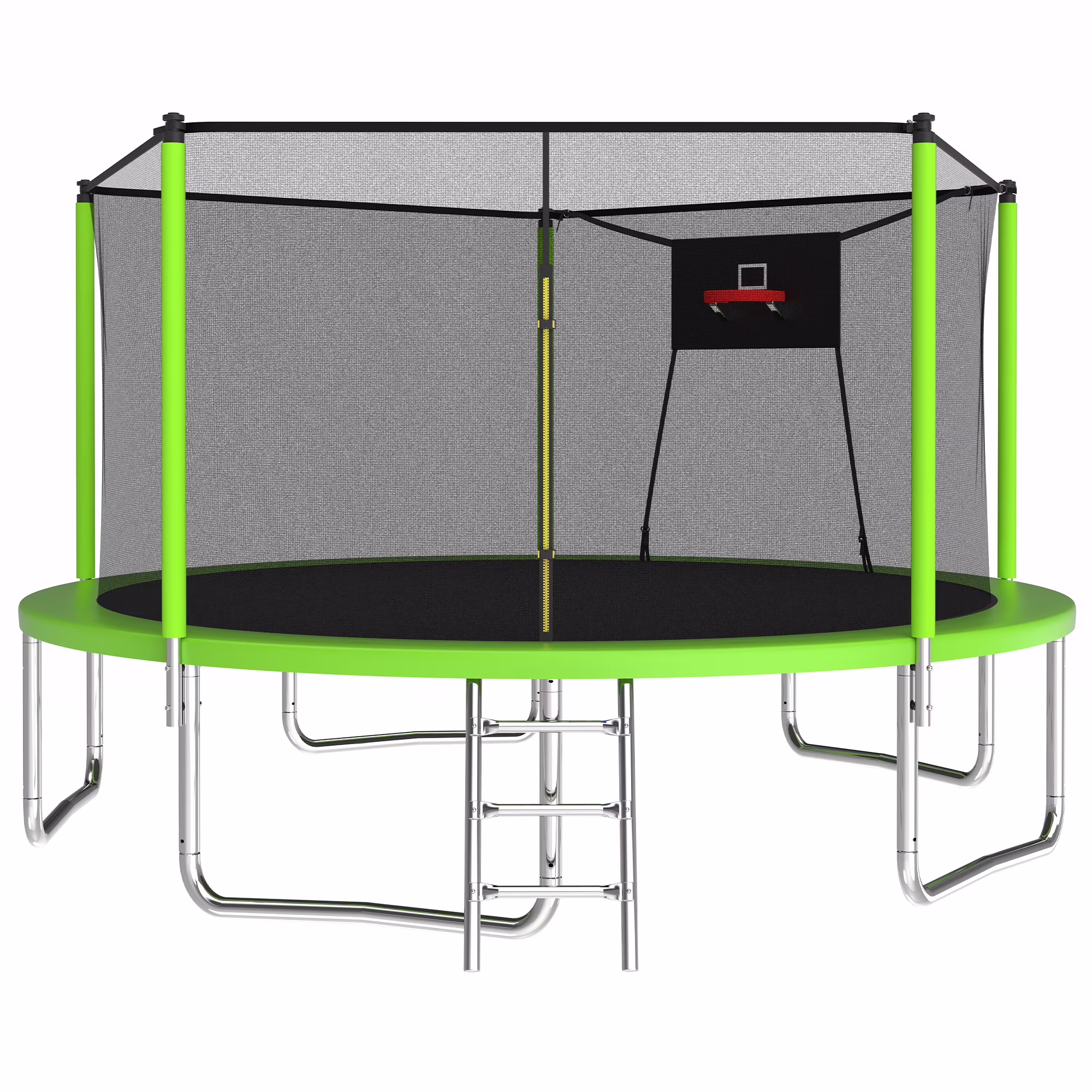 - Safety First-14 FT Trampoline is equipt with 5 high safety enclosure poles and heavy gauge galvanized rust resistance steel construction. 5 W-shaped legs secure stability.