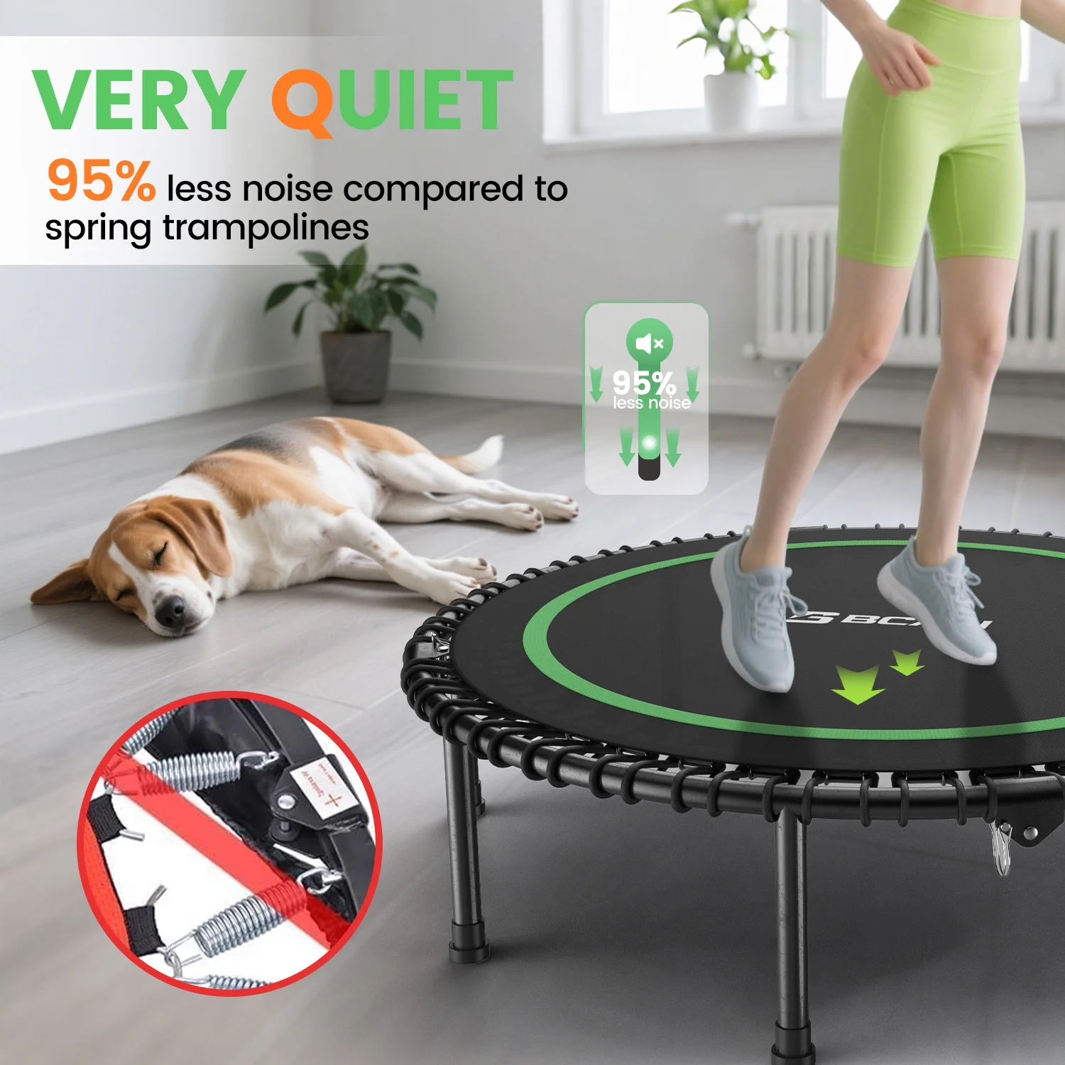 - ��Anti-Slip caps,Safe and Comfortable ��:BCAN 6 legs covered with anti-slid rubber cap ,make the trampoline reduces noise in maximum extent and more stable grip for safety and non-slip and protecting the floor,Gives you the exercise you want from the comfort of your own home, so no need to trek to the gym!