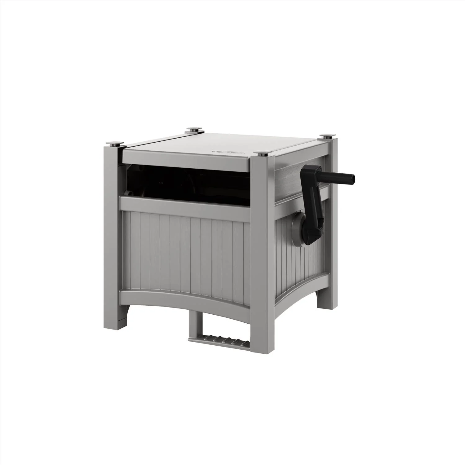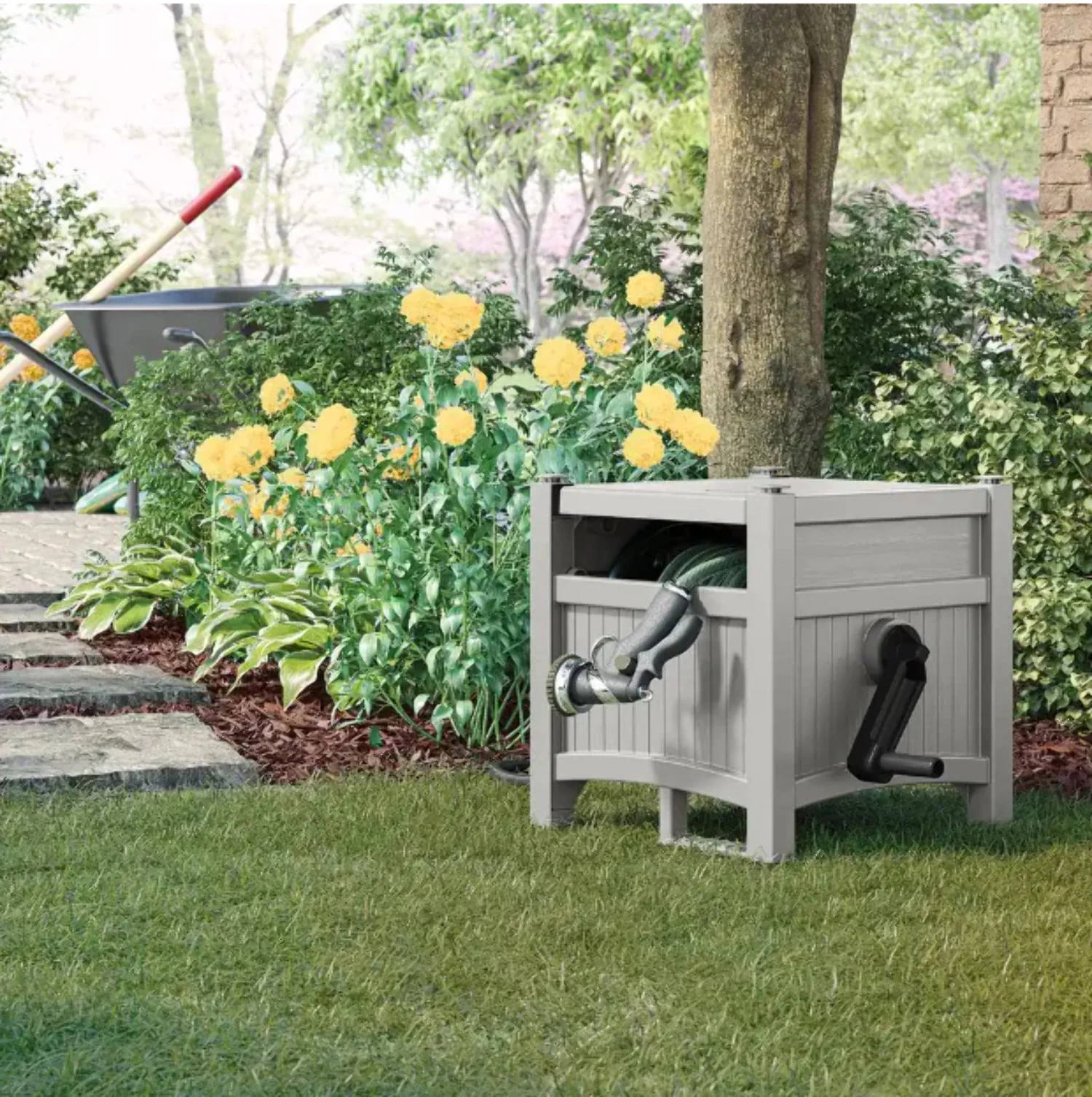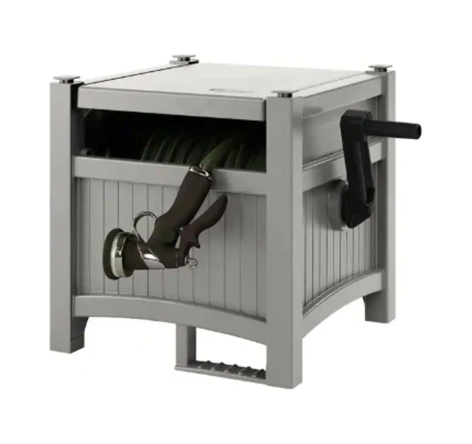 - Conveniently conceals and stores garden hose