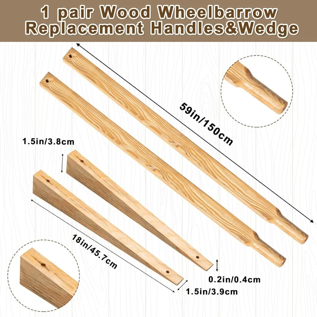 - Appropriate Size: The wheelbarrow handles replacement kit measures approx. 59 inches/150cm in length, and the wood wheelbarrow wedge measures 18.9 inches/48 cm in length, the suitable size for easy storage and installation; The size of the wheelbarrow handles and wheelbarrow wedge can be DIY according to your needs