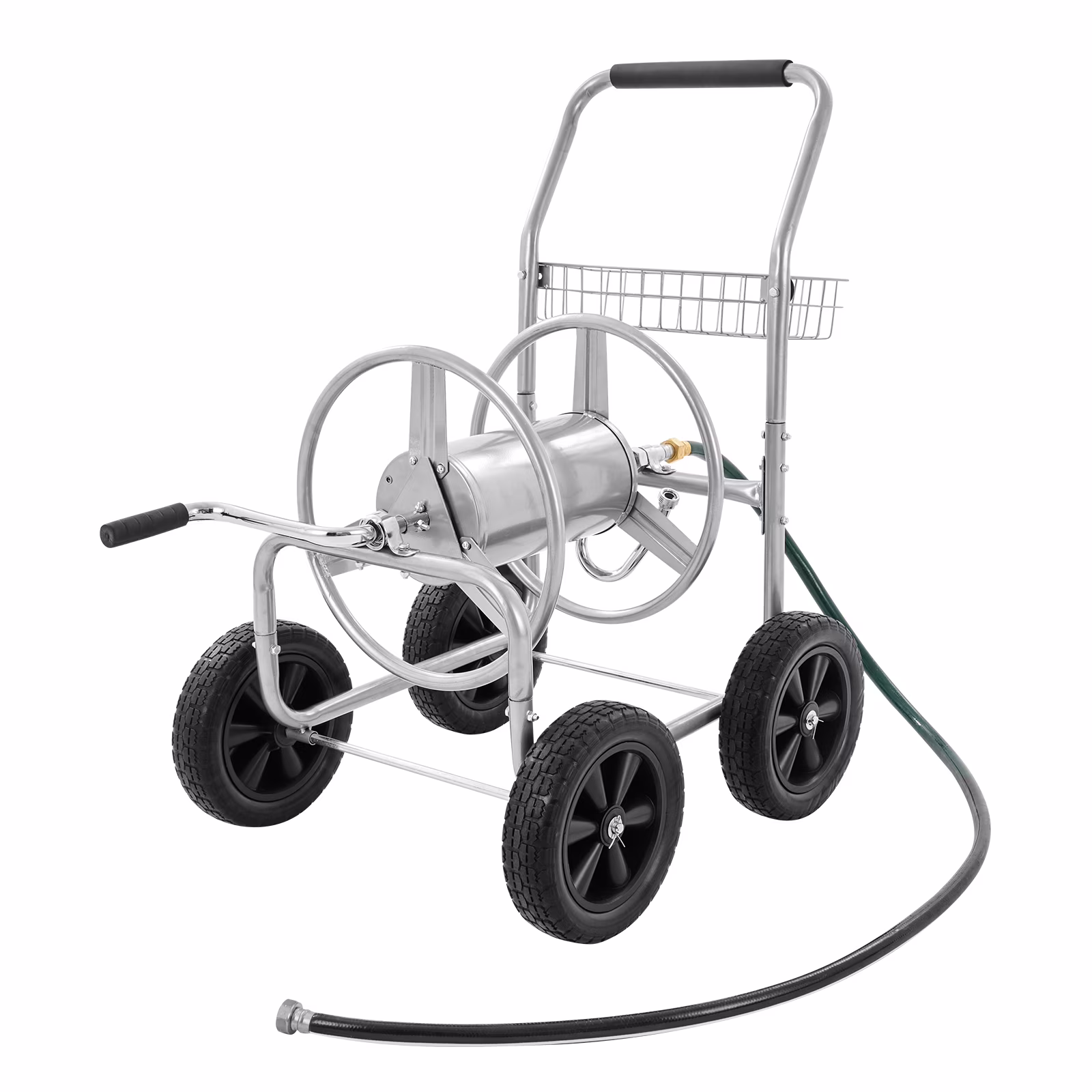 - Stable Mobility: A low center of gravity is beneficial in preventing tipping. The garden hose reel cart is equipped with four solid 10���� PU wheels that are durable and suitable for various terrains. These wheels ensure effortless and smooth movement of the cart, even on rough or uneven ground.