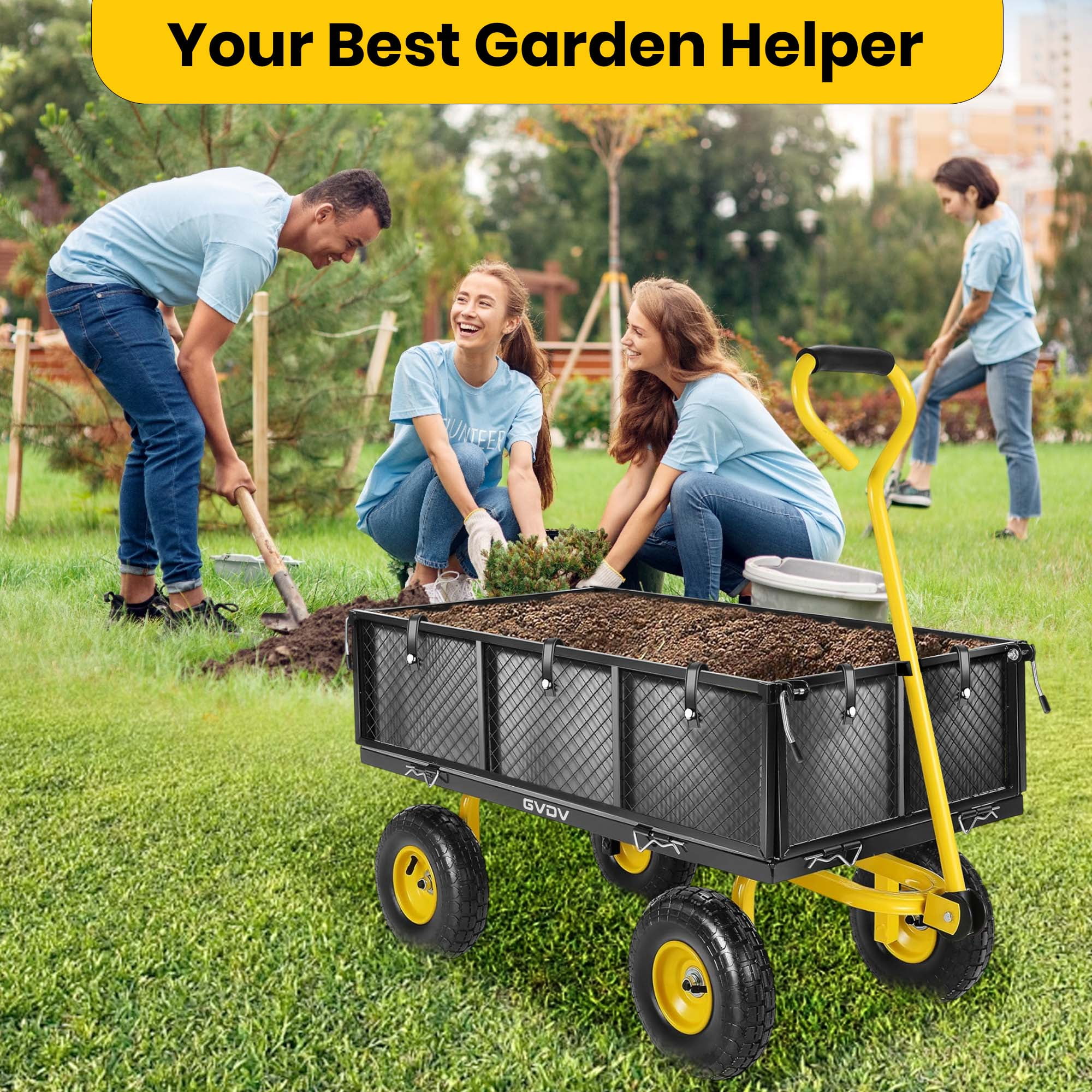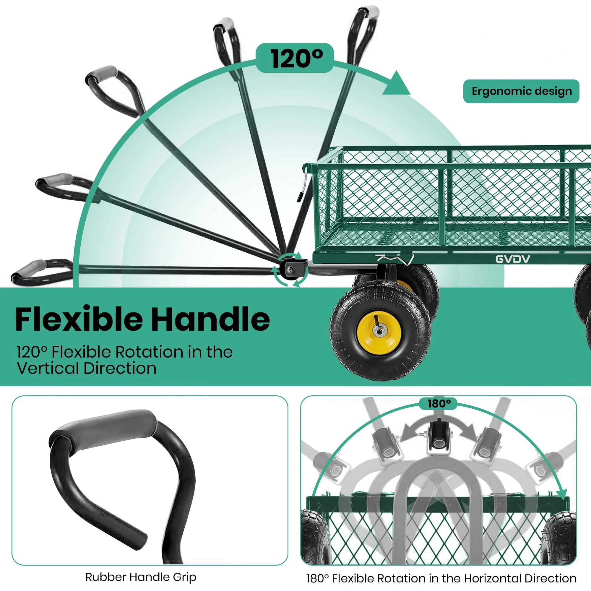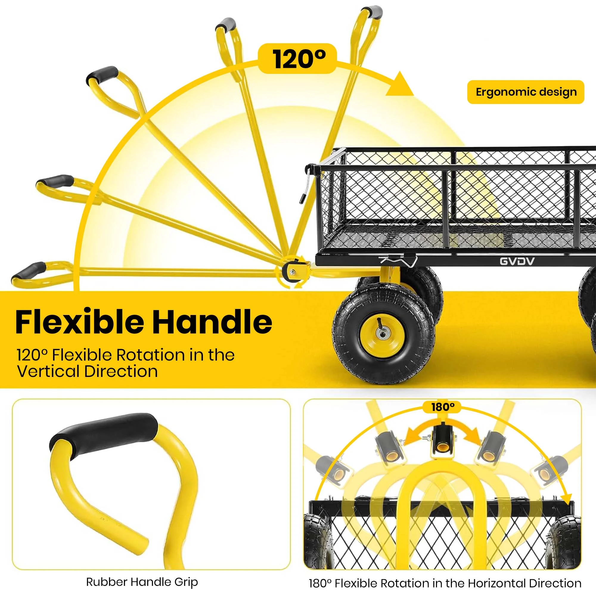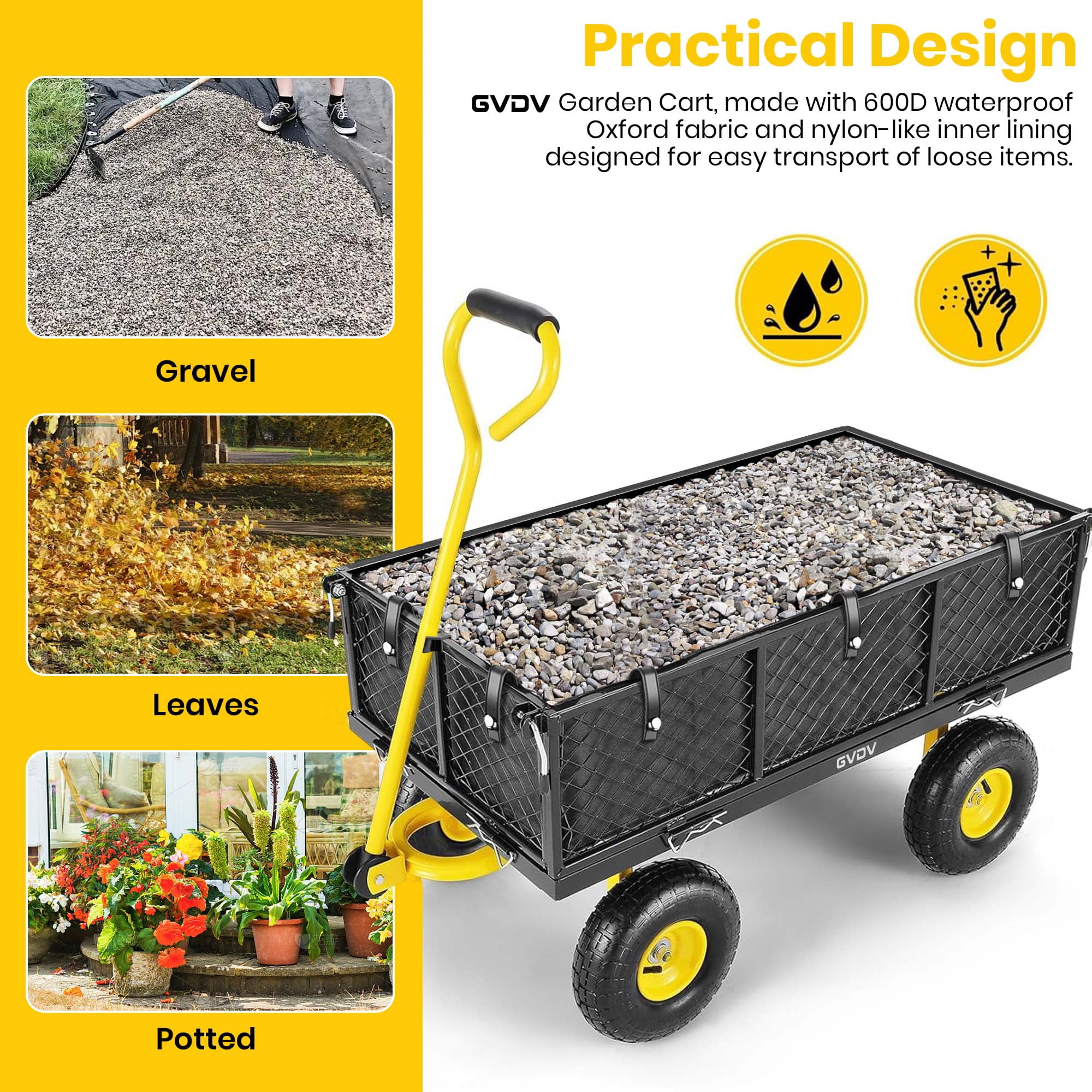 A versatile and durable GVDV garden cart designed for heavy-duty outdoor tasks. With a 660 lbs capacity, it features a steel mesh bed and a sturdy welded frame that can withstand tough weather conditions. The cart's removable side panels allow it to transform into a flatbed for transporting larger loads like tree branches or fence posts. Equipped with 10" pneumatic all-terrain wheels, it offers shock absorption and stability on various surfaces like grass, sand, and snow. The ergonomic 180�� rotating handle provides easy maneuverability, even when fully loaded. Ideal for yard work, hauling materials, or transporting tools, pets, and more. Choose GVDV for superior quality and convenience in your yard work.