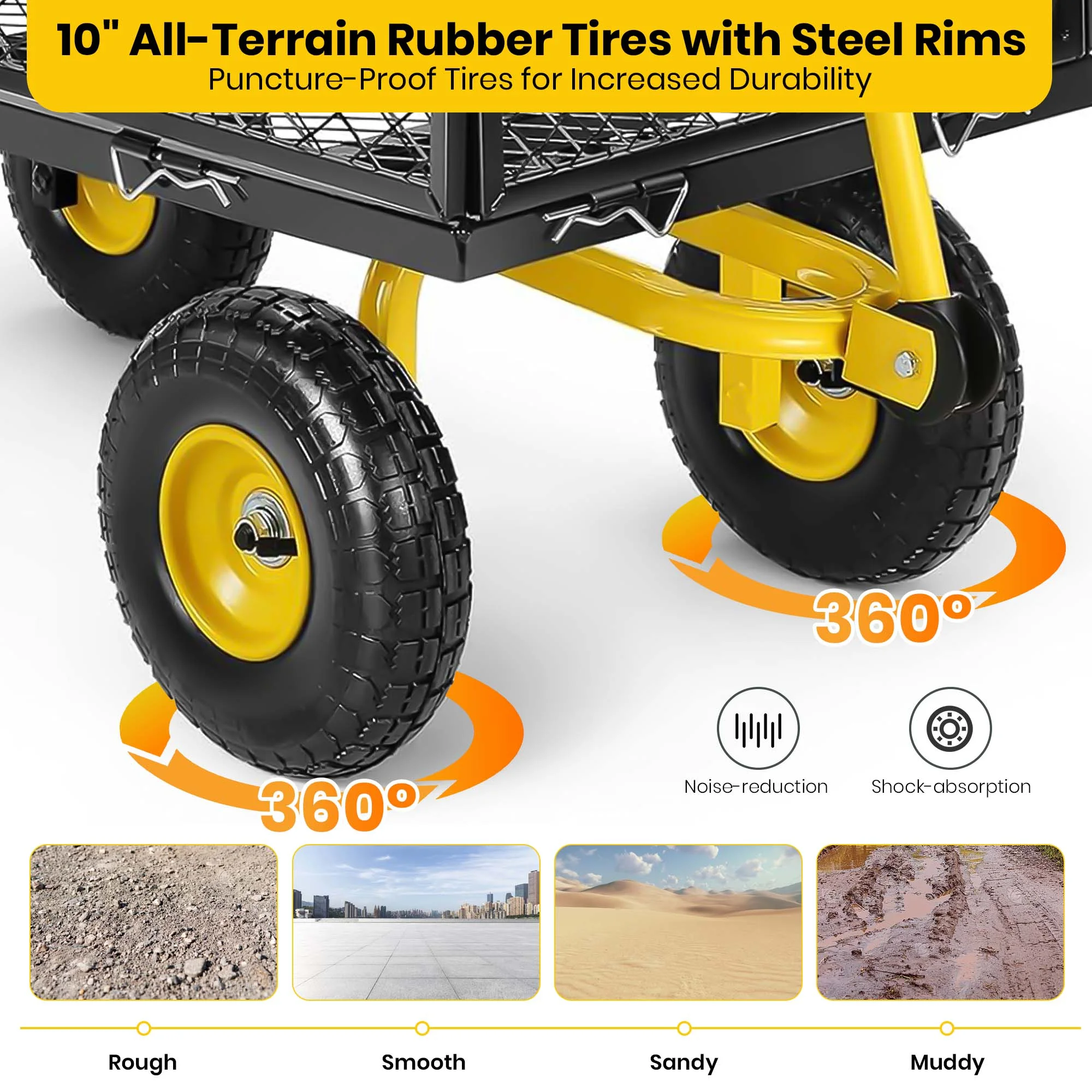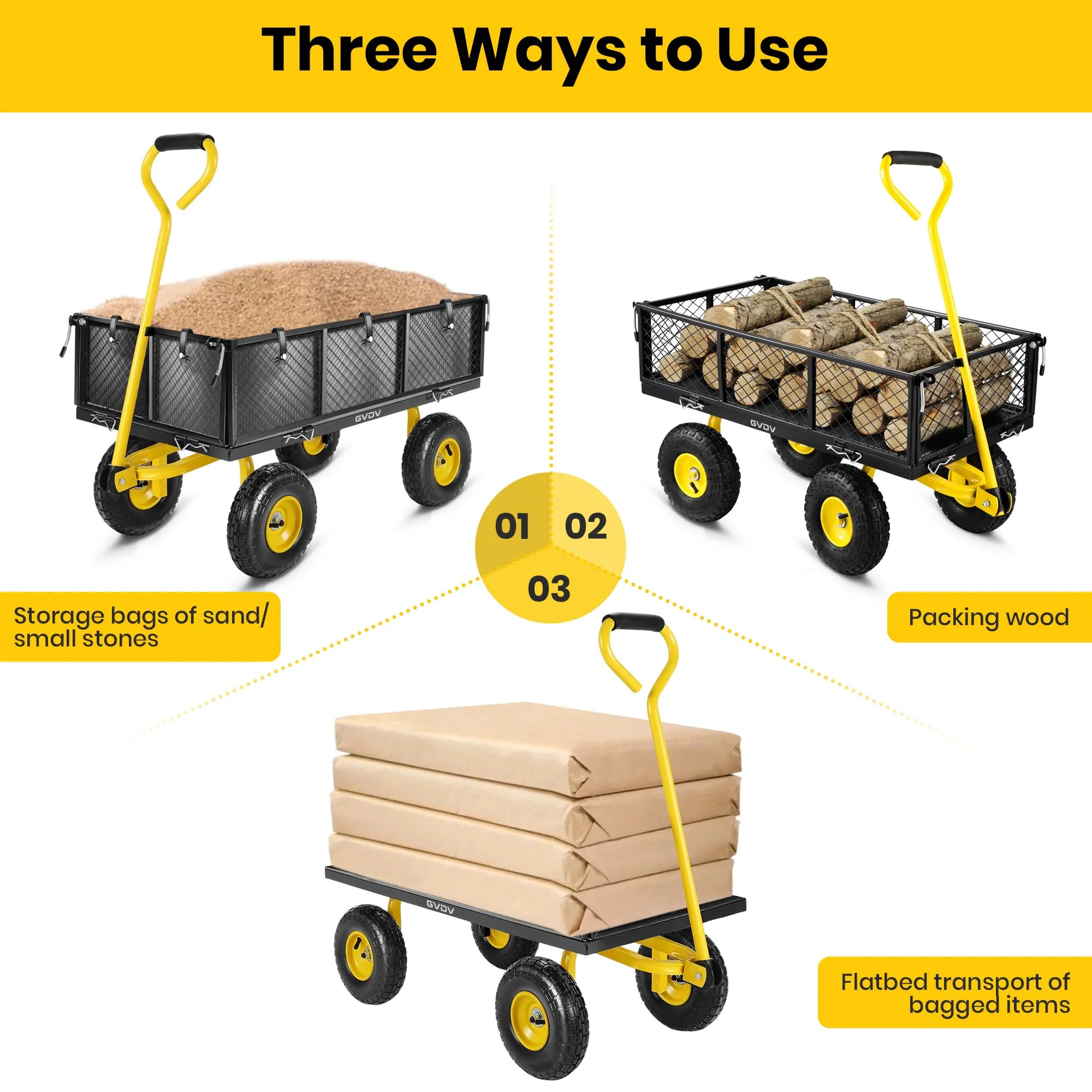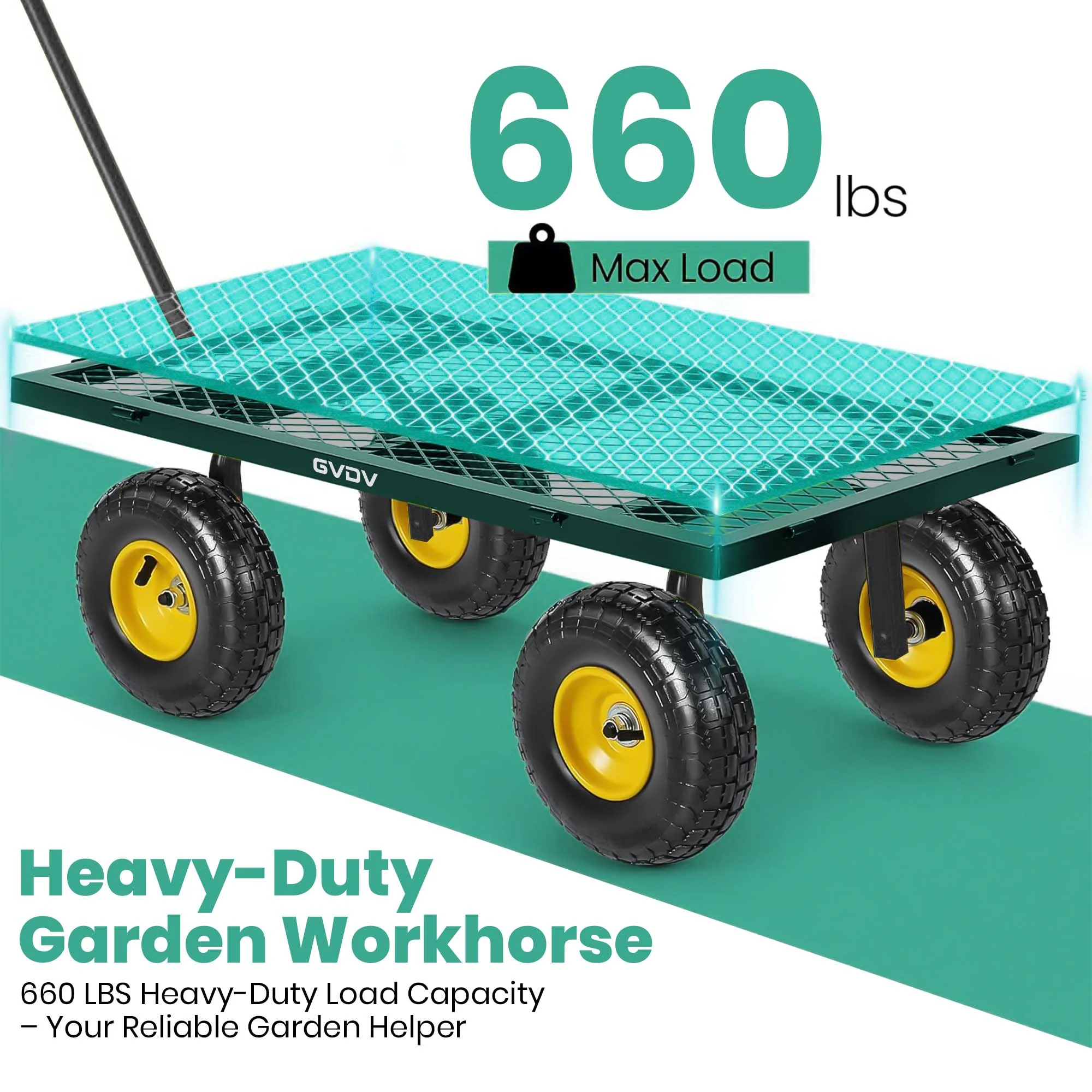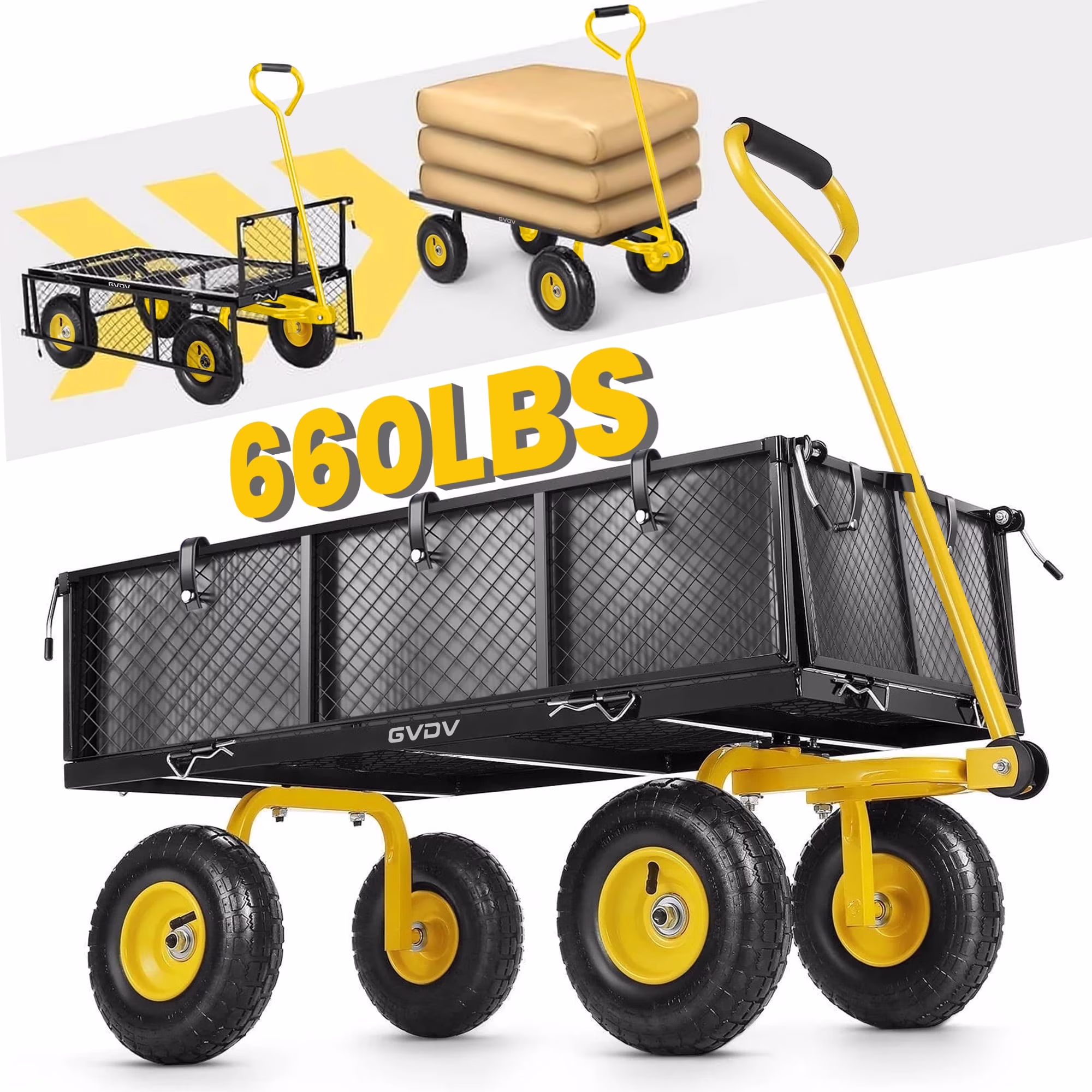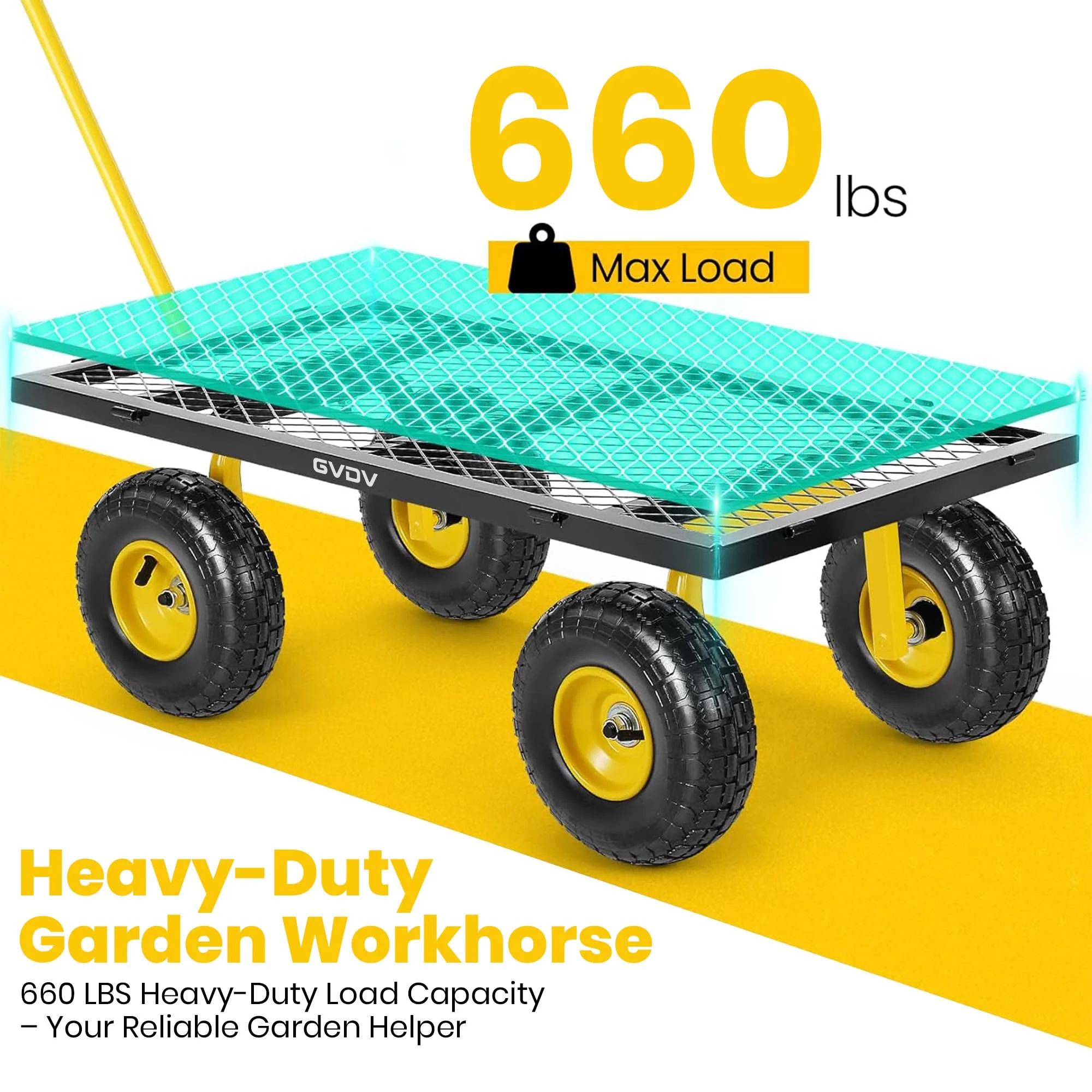 A versatile and durable GVDV garden cart designed for heavy-duty outdoor tasks. With a 660 lbs capacity, it features a steel mesh bed and a sturdy welded frame that can withstand tough weather conditions. The cart's removable side panels allow it to transform into a flatbed for transporting larger loads like tree branches or fence posts. Equipped with 10" pneumatic all-terrain wheels, it offers shock absorption and stability on various surfaces like grass, sand, and snow. The ergonomic 180�� rotating handle provides easy maneuverability, even when fully loaded. Ideal for yard work, hauling materials, or transporting tools, pets, and more. Choose GVDV for superior quality and convenience in your yard work.
