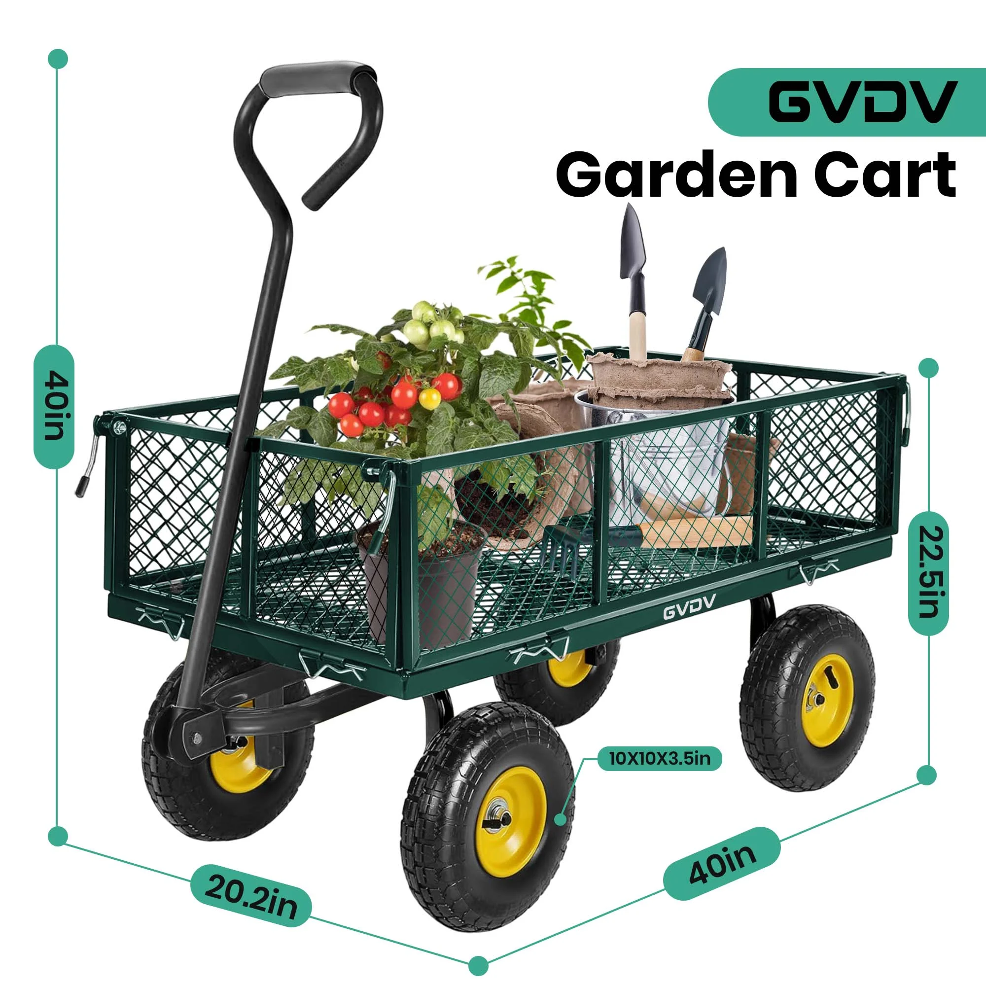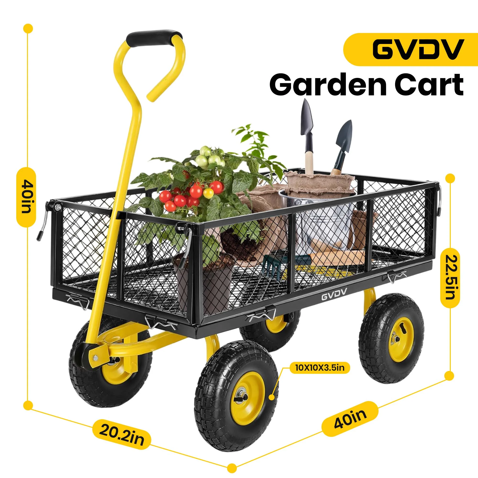 - Durable with Super Capacity: GVDV's multi-functional steel garden cart will become your number 1 assistant for garden planting. It will solve all problems when transporting equipment weighing up to 660 LBS. The cart has a steel mesh bed that is 40 in long and 20 in wide, carrying large amounts of planting tools with ease. Thanks to its fully-welded powder-coated steel frame and iron mesh frame, the cart withstands all outdoor weather conditions for years to come.