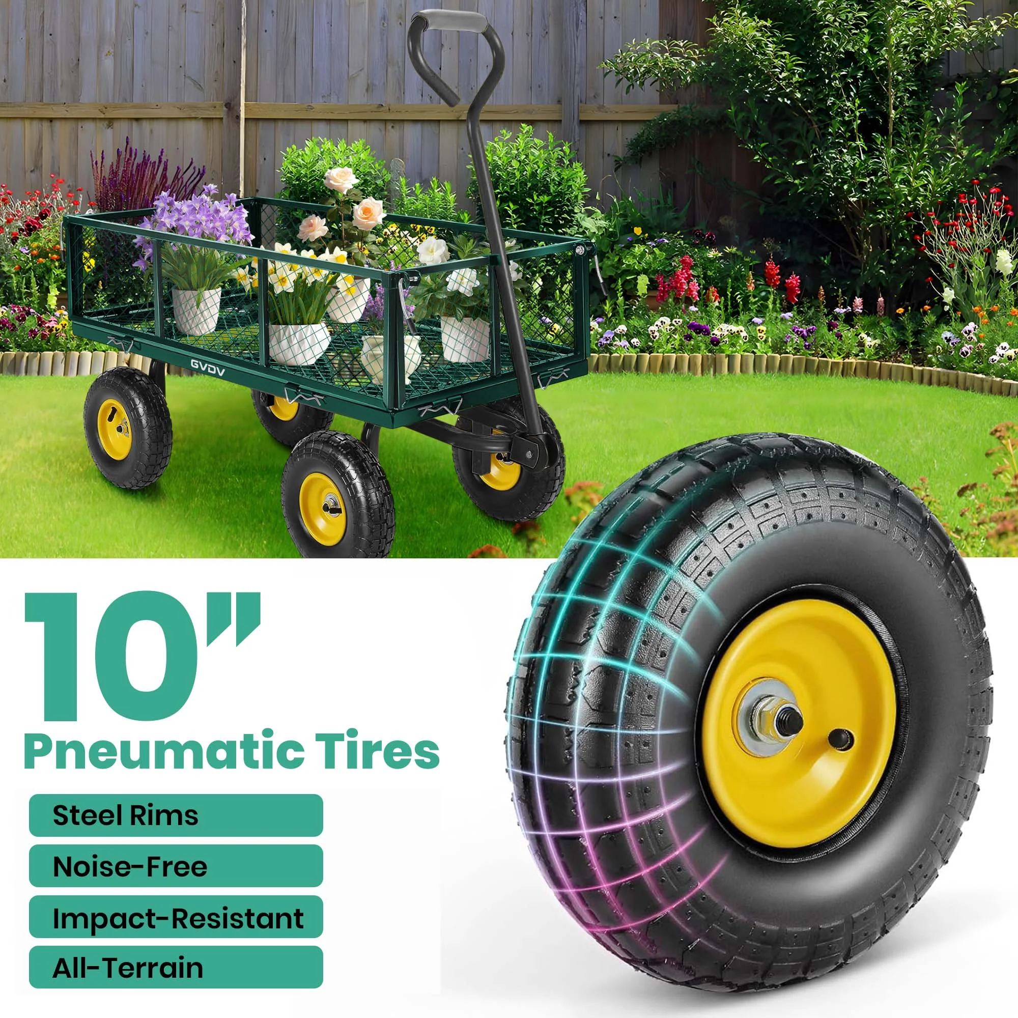 - The King of Terrain: Our garden cart flatbed is equipped with 10 inch tires, enhancing stability and security during use. The upgraded pneumatic tires feature noise-reduction and shock absorption. These impact-proof tires ensure the garden cart adapts to various road conditions, such as grass, snow, beaches, rock, etc. Get ready to roll over any surface and go where you need to be!