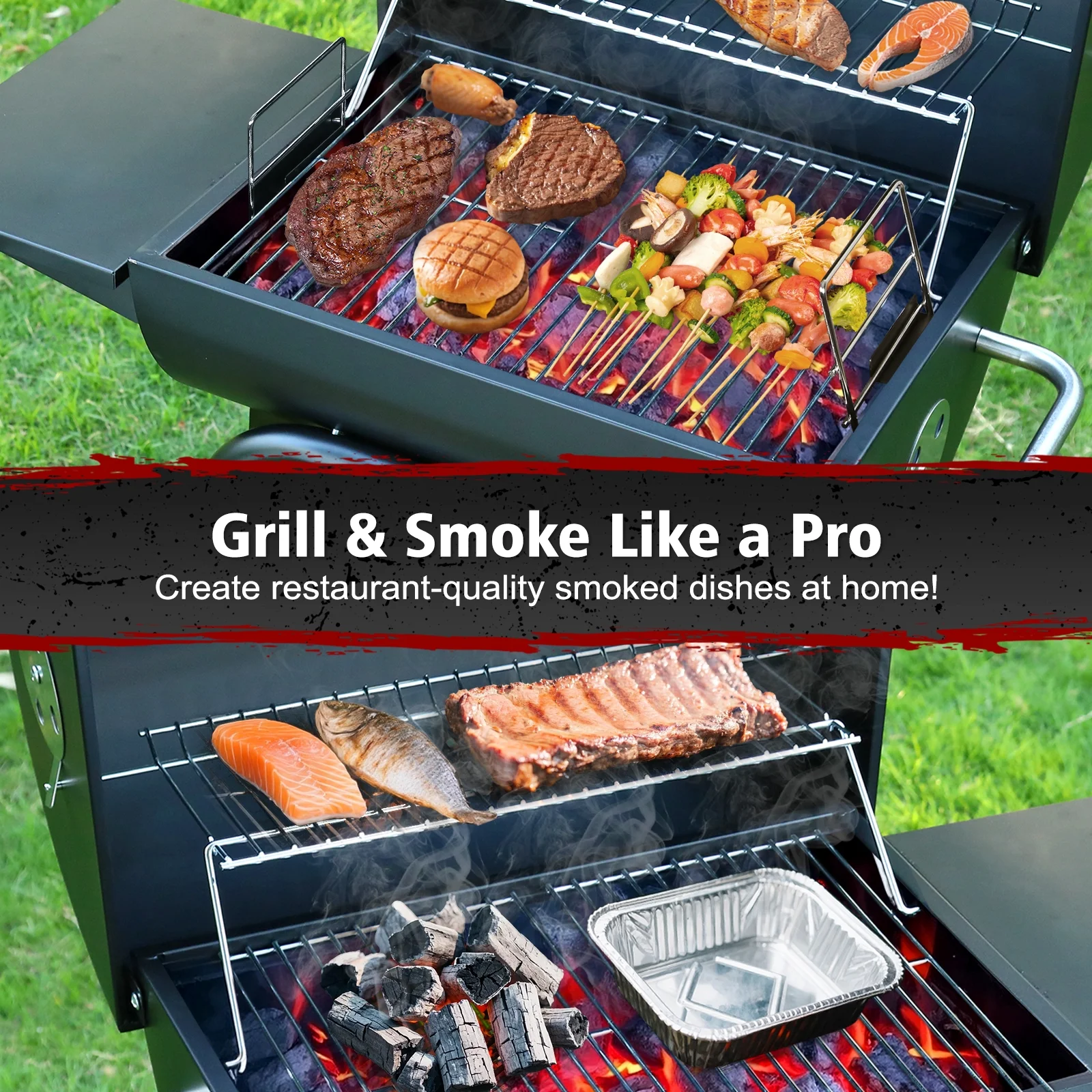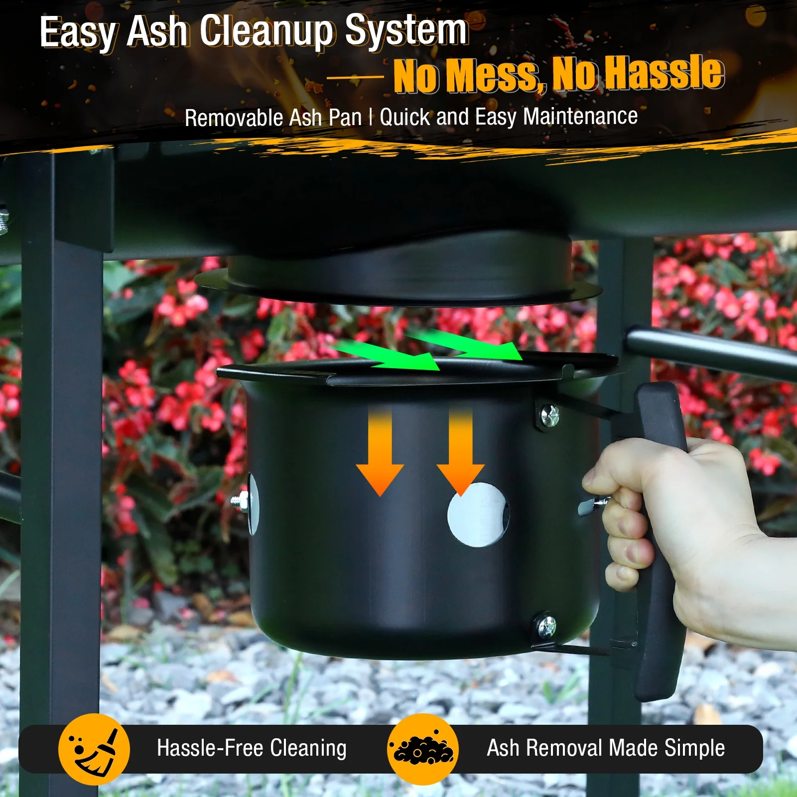 - Easy cleanup: Removable ash pan + porcelain-coated grates