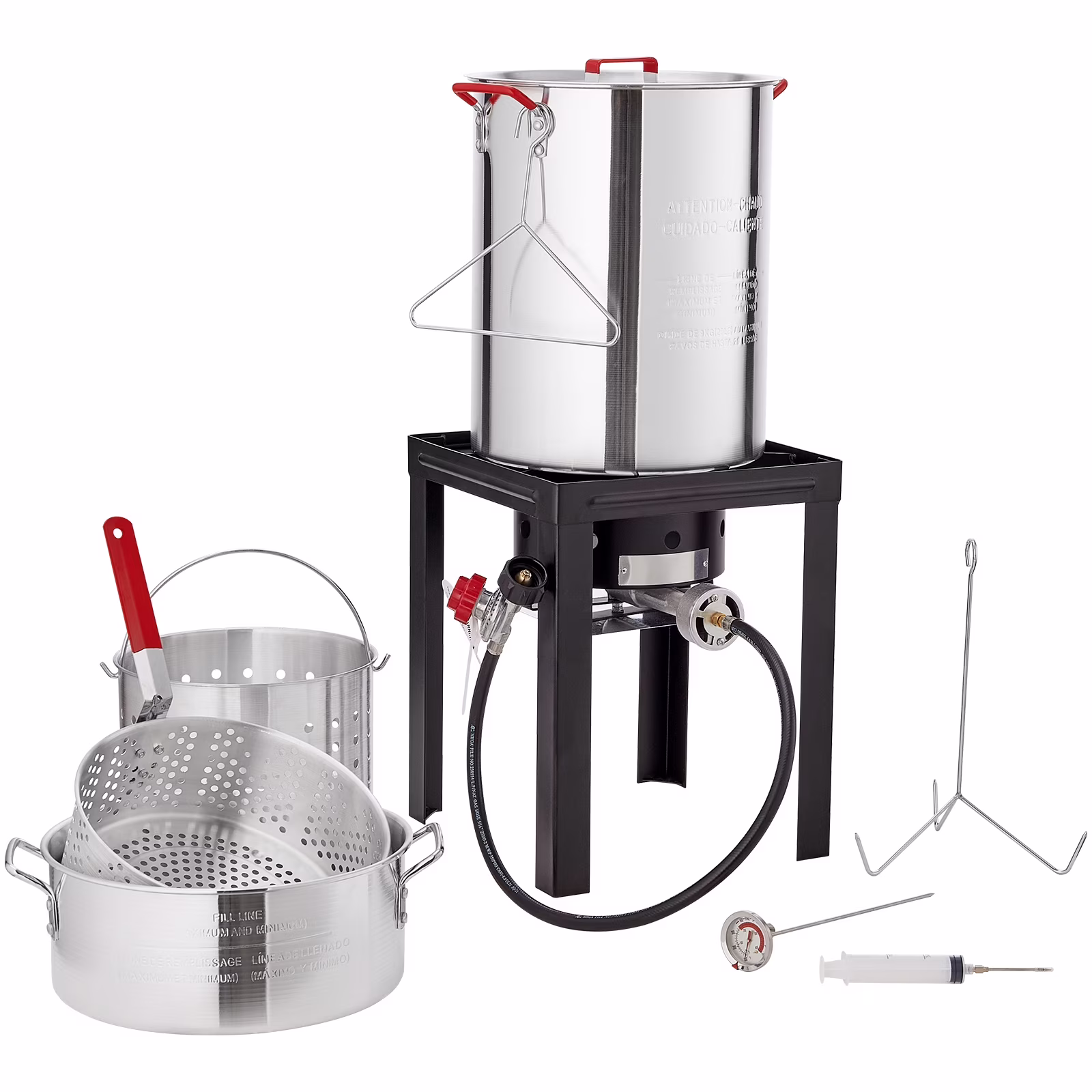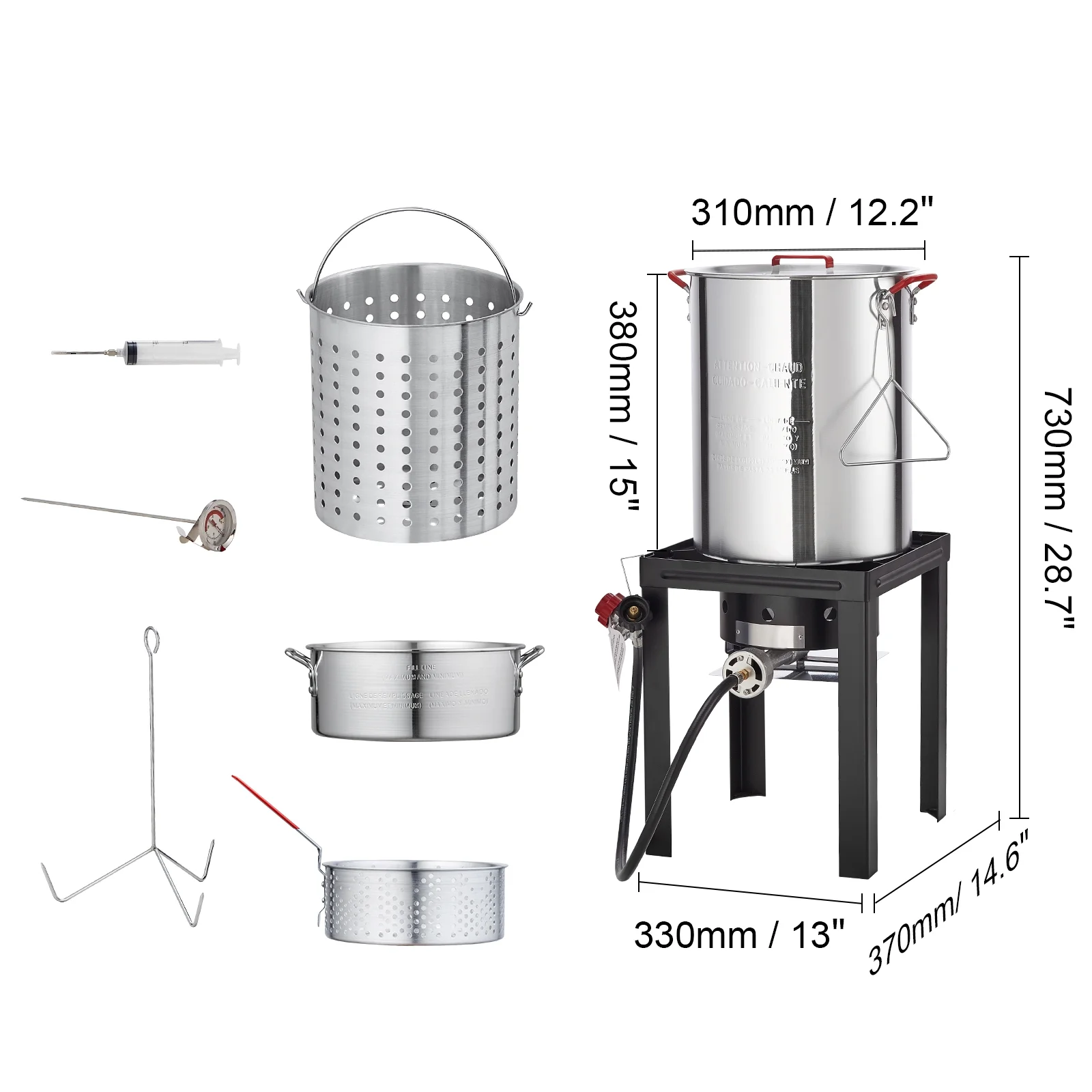 - Abundant Accessories: This KFFKFF propane gas boiler set includes a 30-quart pot, a 10-quart pot, a lid, a perforated frying basket/steamer, a thermometer, a perforated turkey rack, a hanging hook, a marinade injector, a burner stand, an LP hose, and a regulator. All the accessories are complete and most of them have CSA certification. The stand is thickened for a secure base and to prevent tipping. The materials used for the steamer stock pot are sturdy and safe.