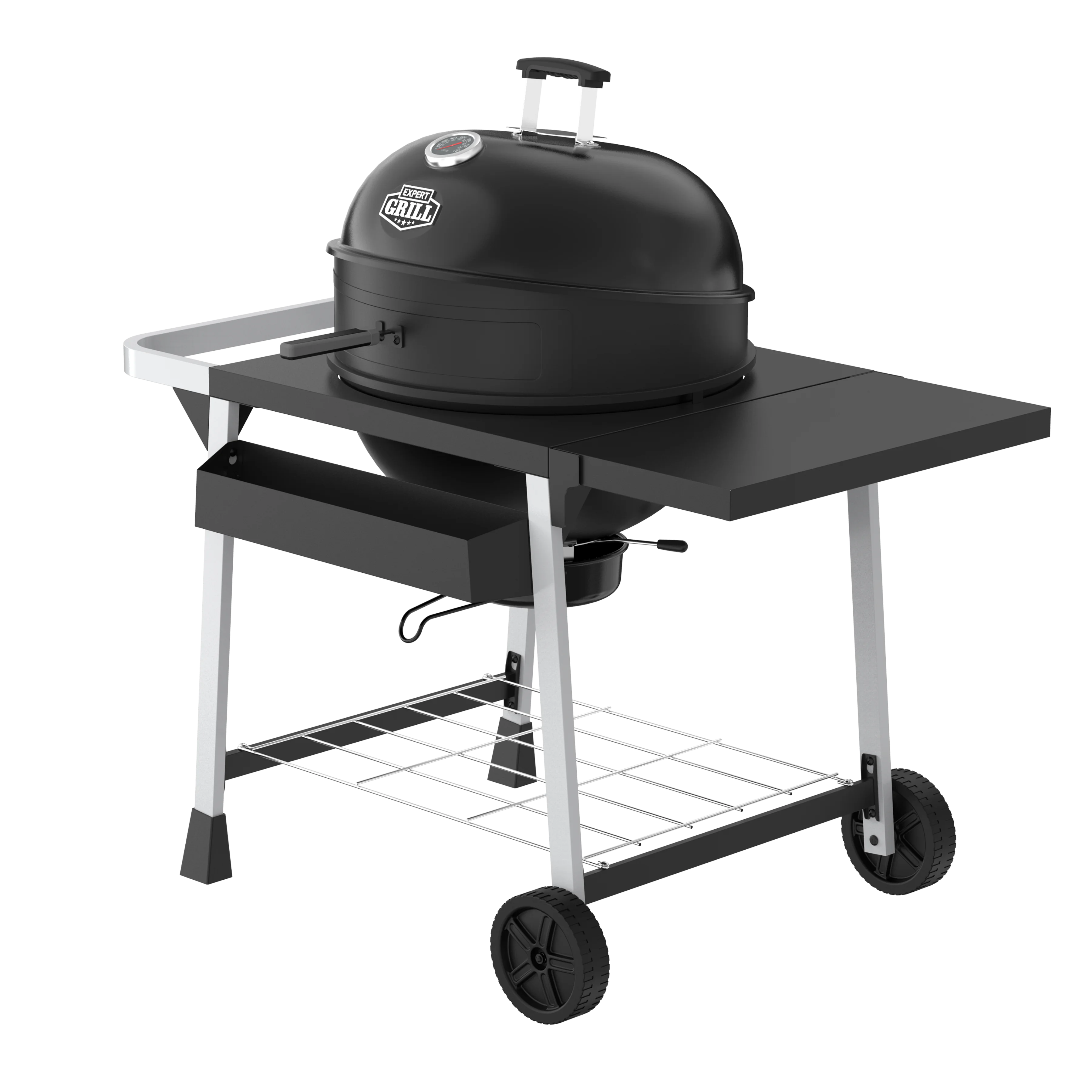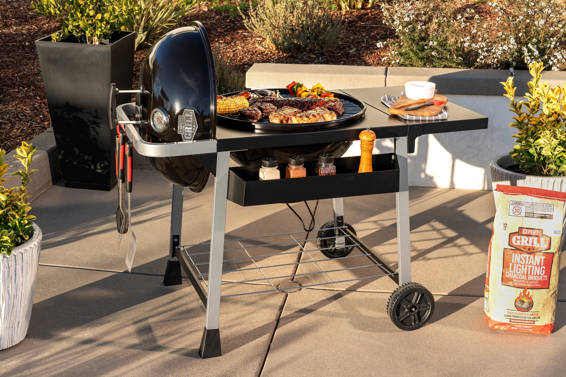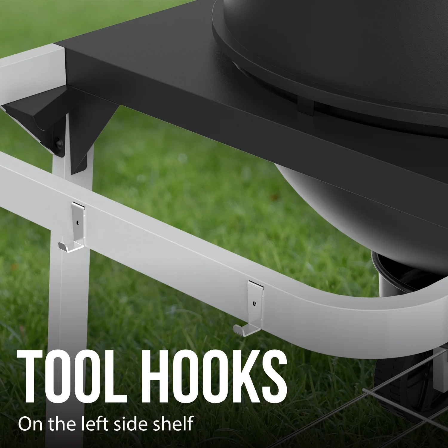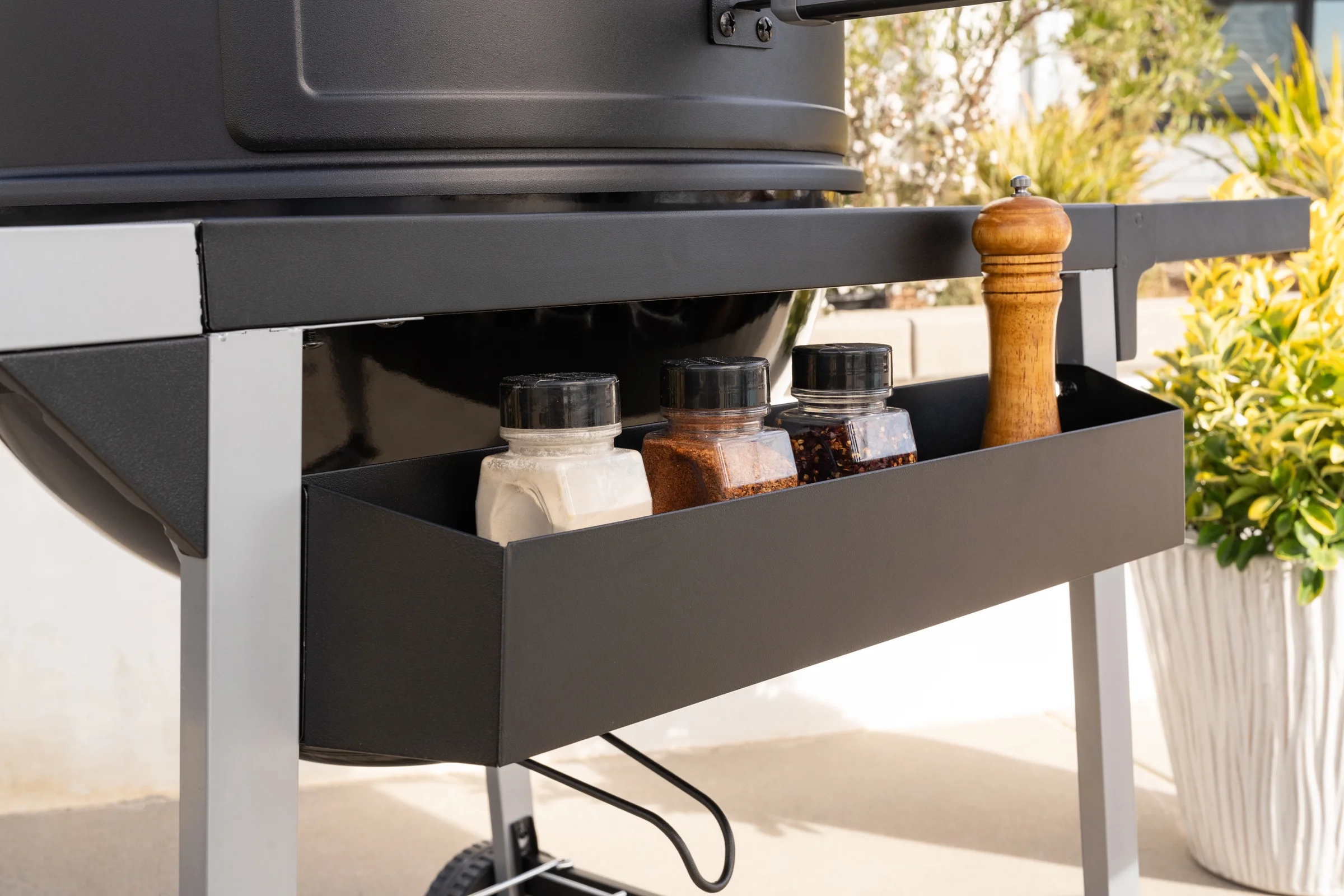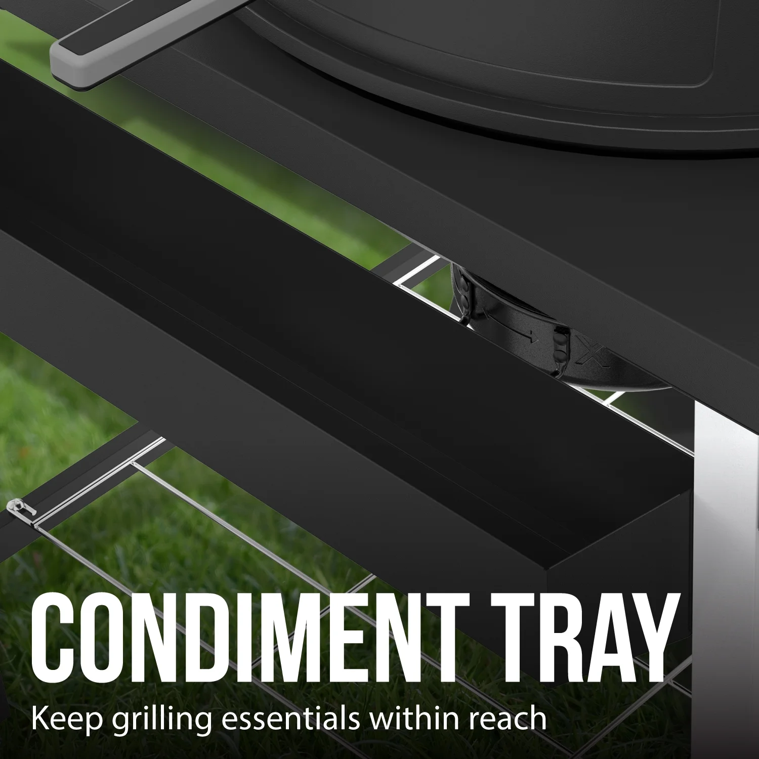 - Features a right side-shelf, front condiment tray, and bottom storage rack to keep your grilling essentials within reach.