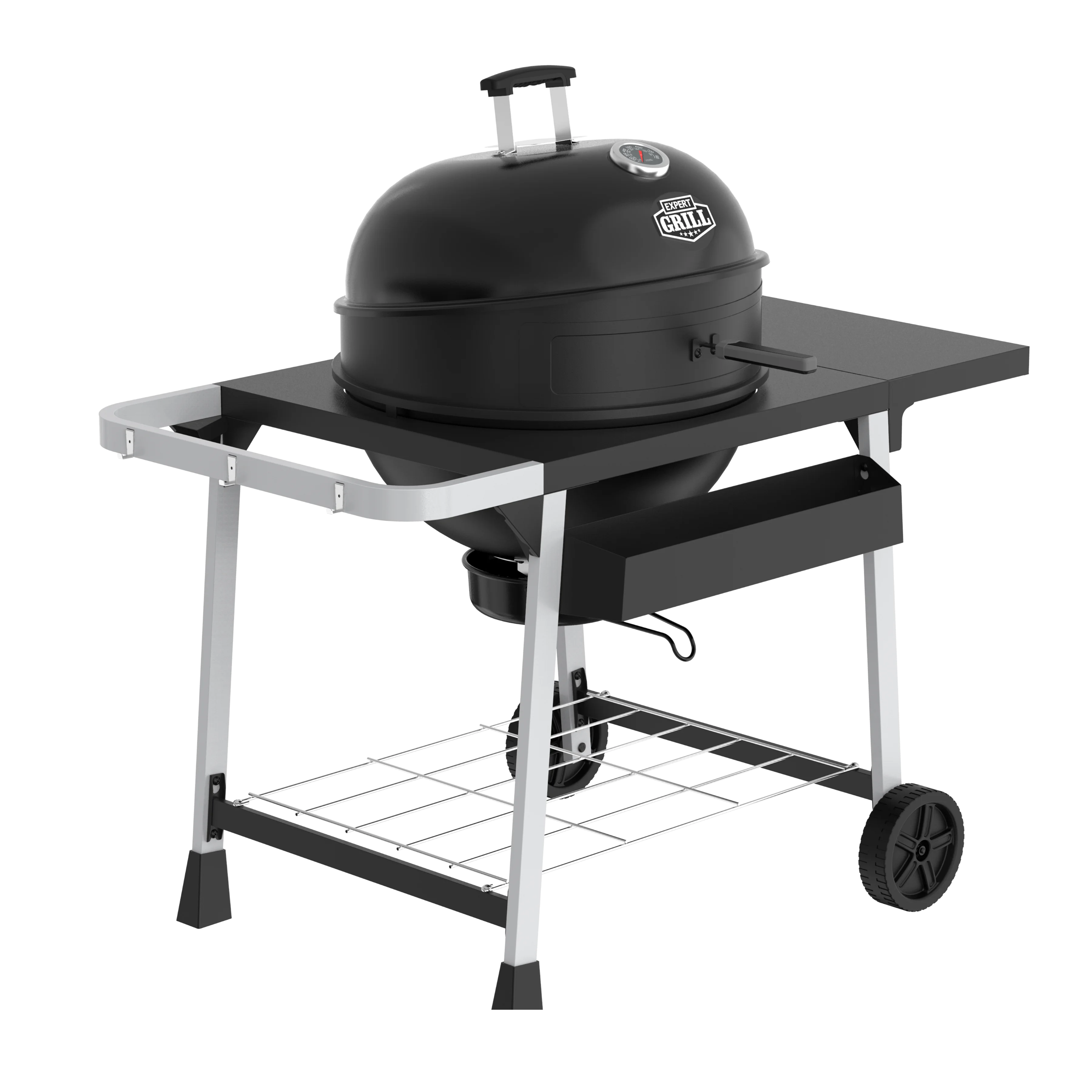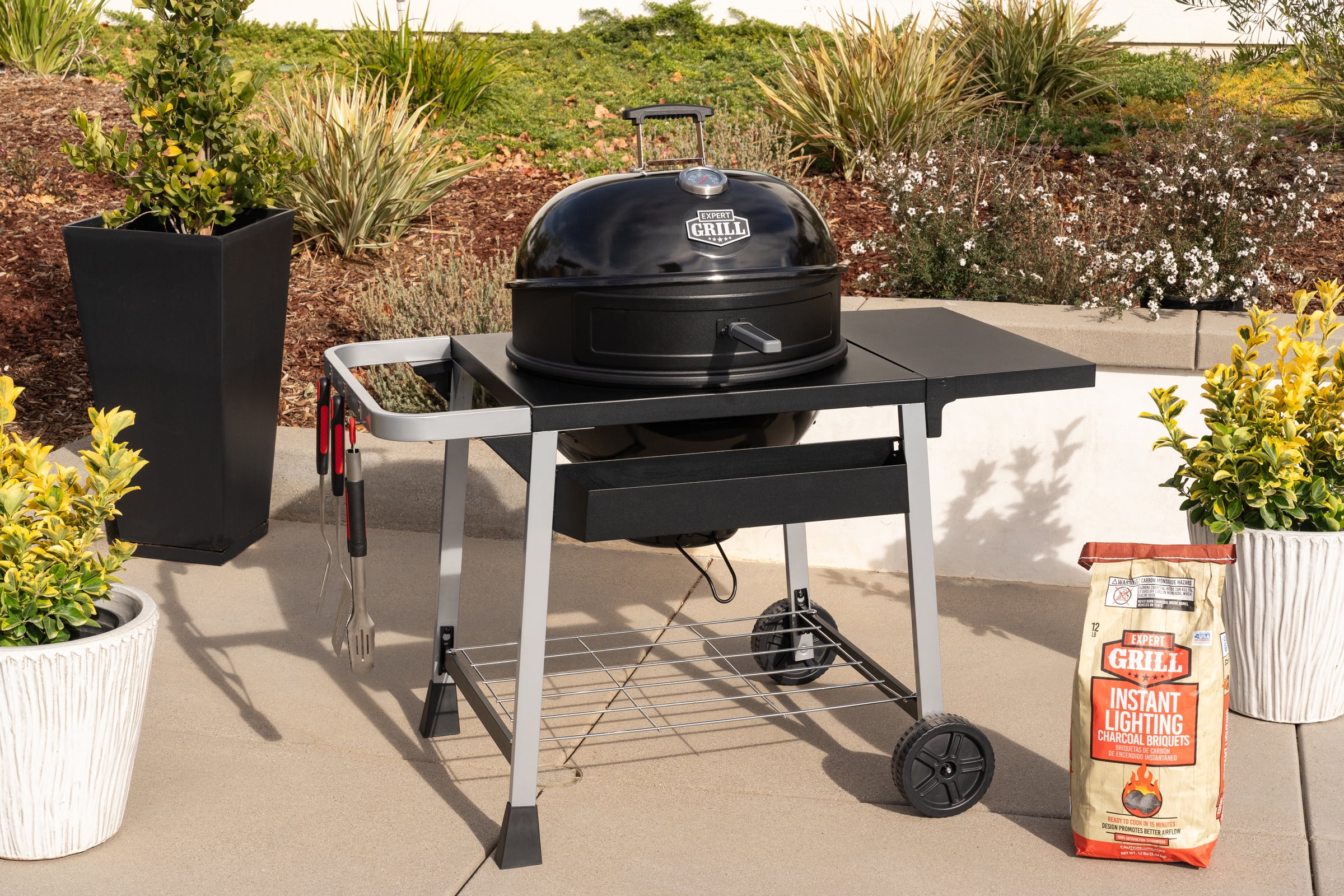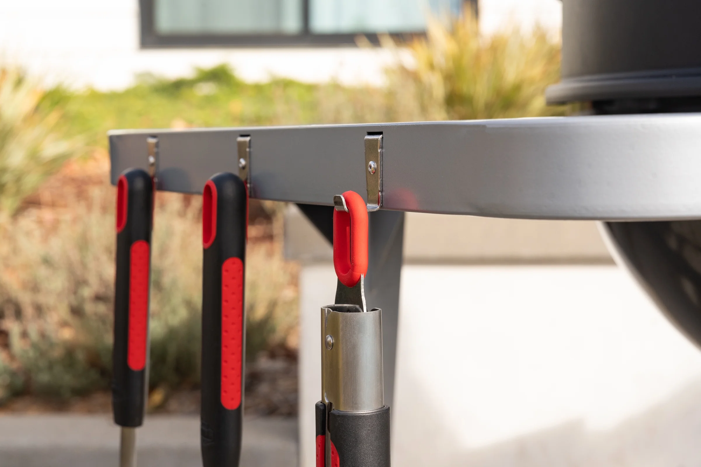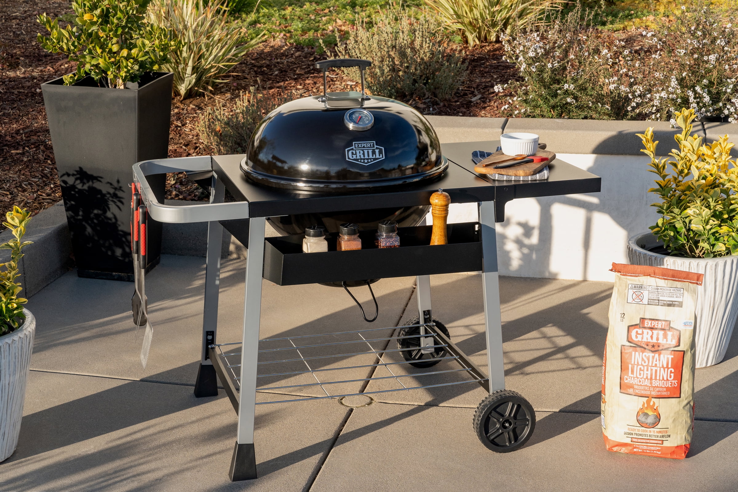 - Features a right side-shelf, front condiment tray, and bottom storage rack to keep your grilling essentials within reach.