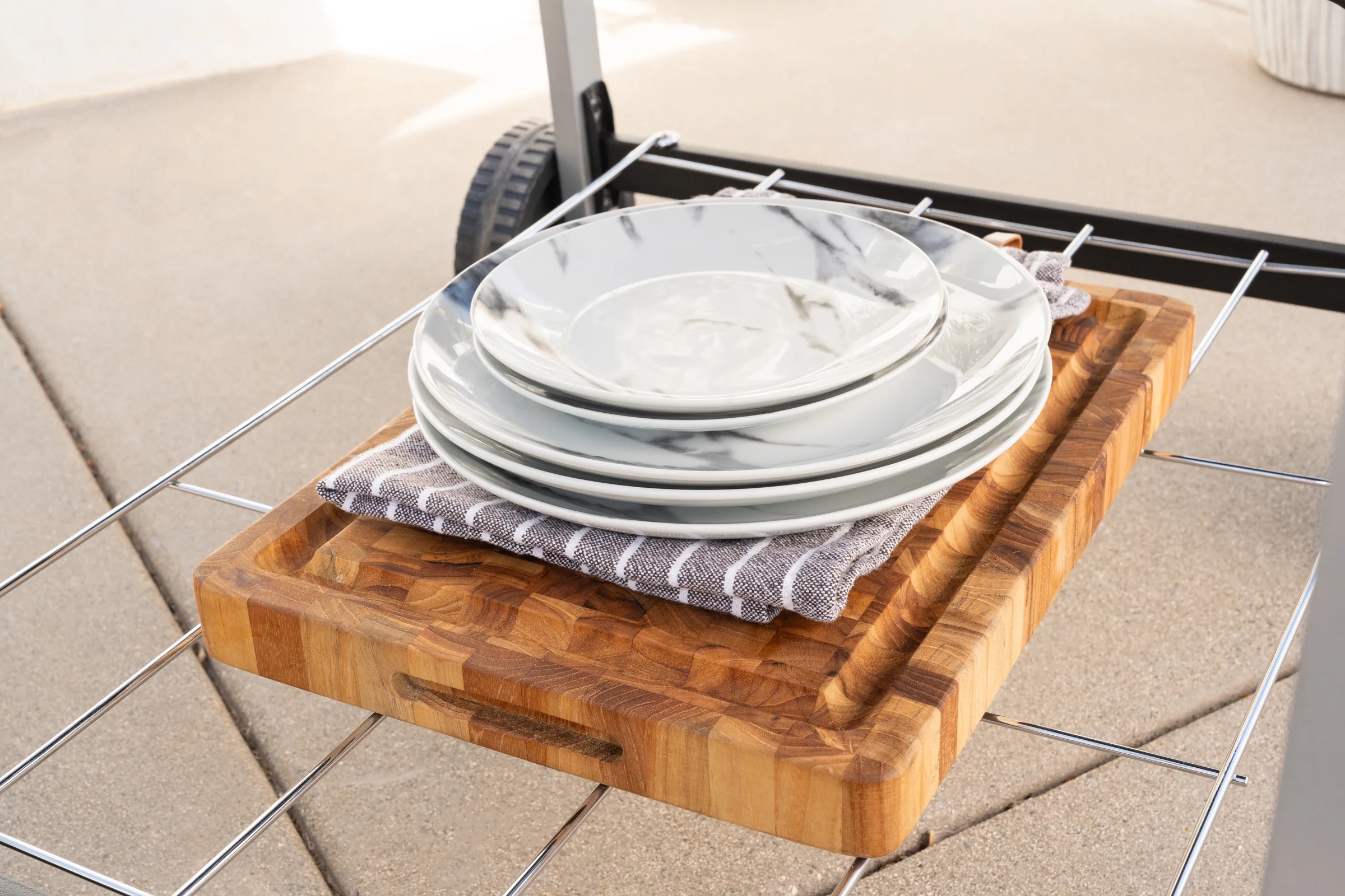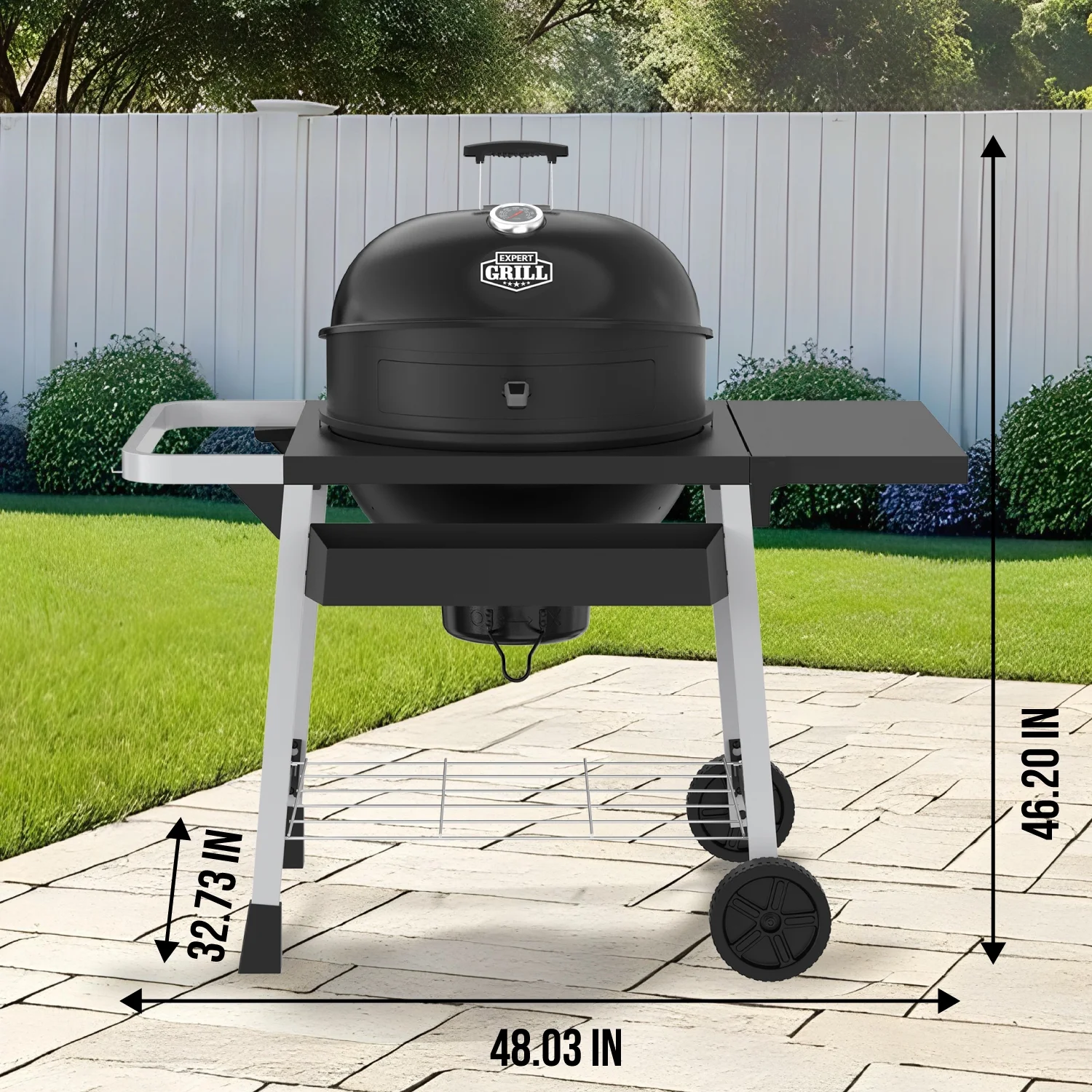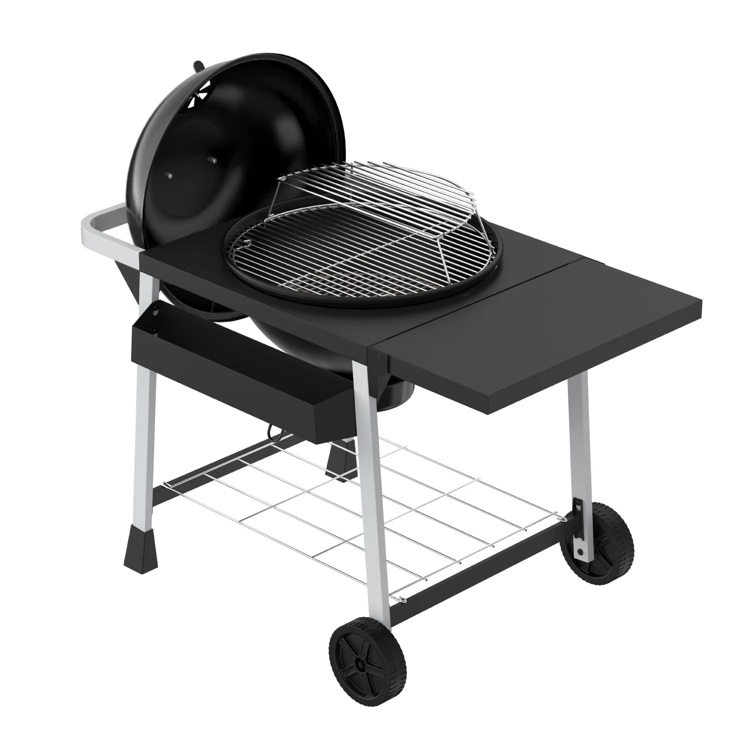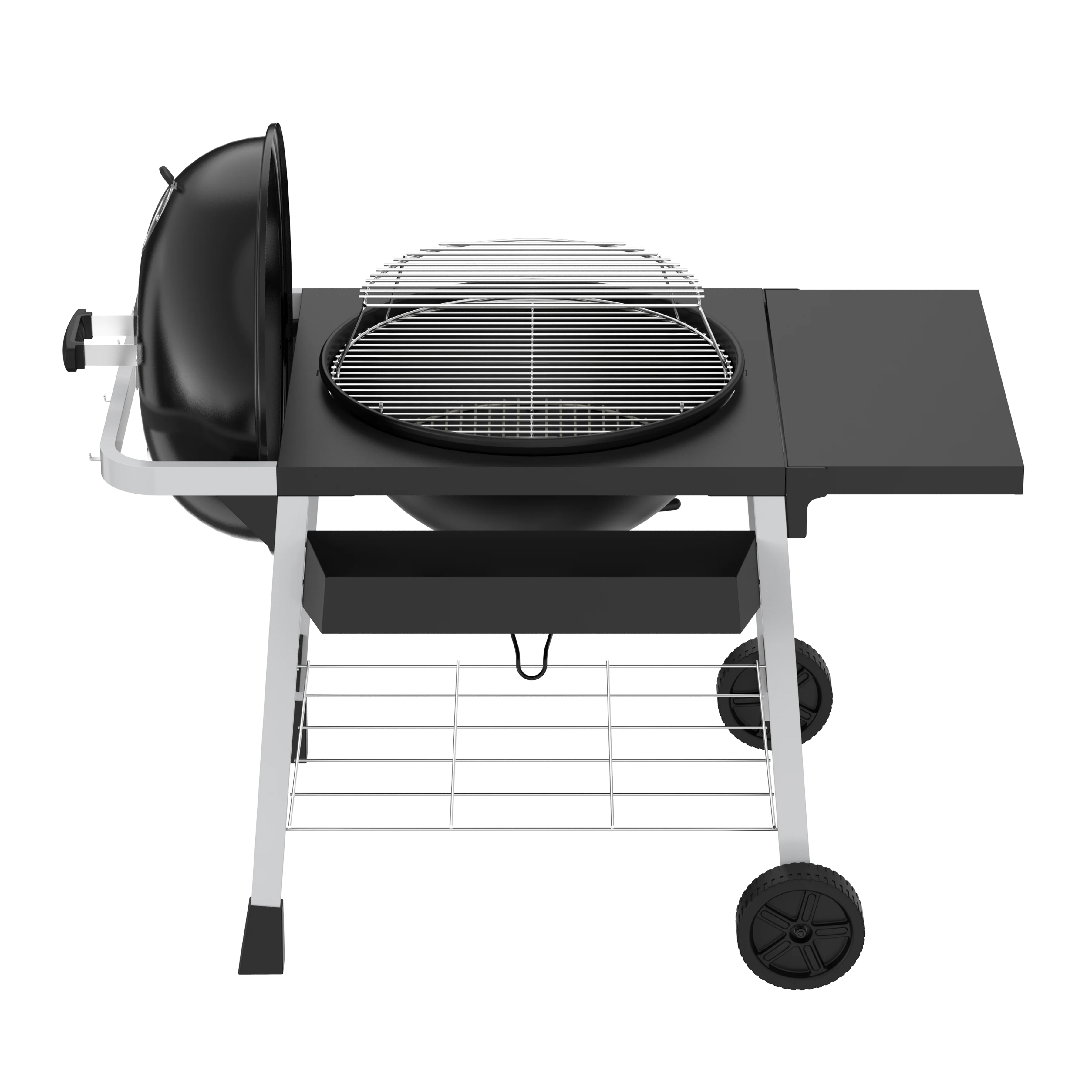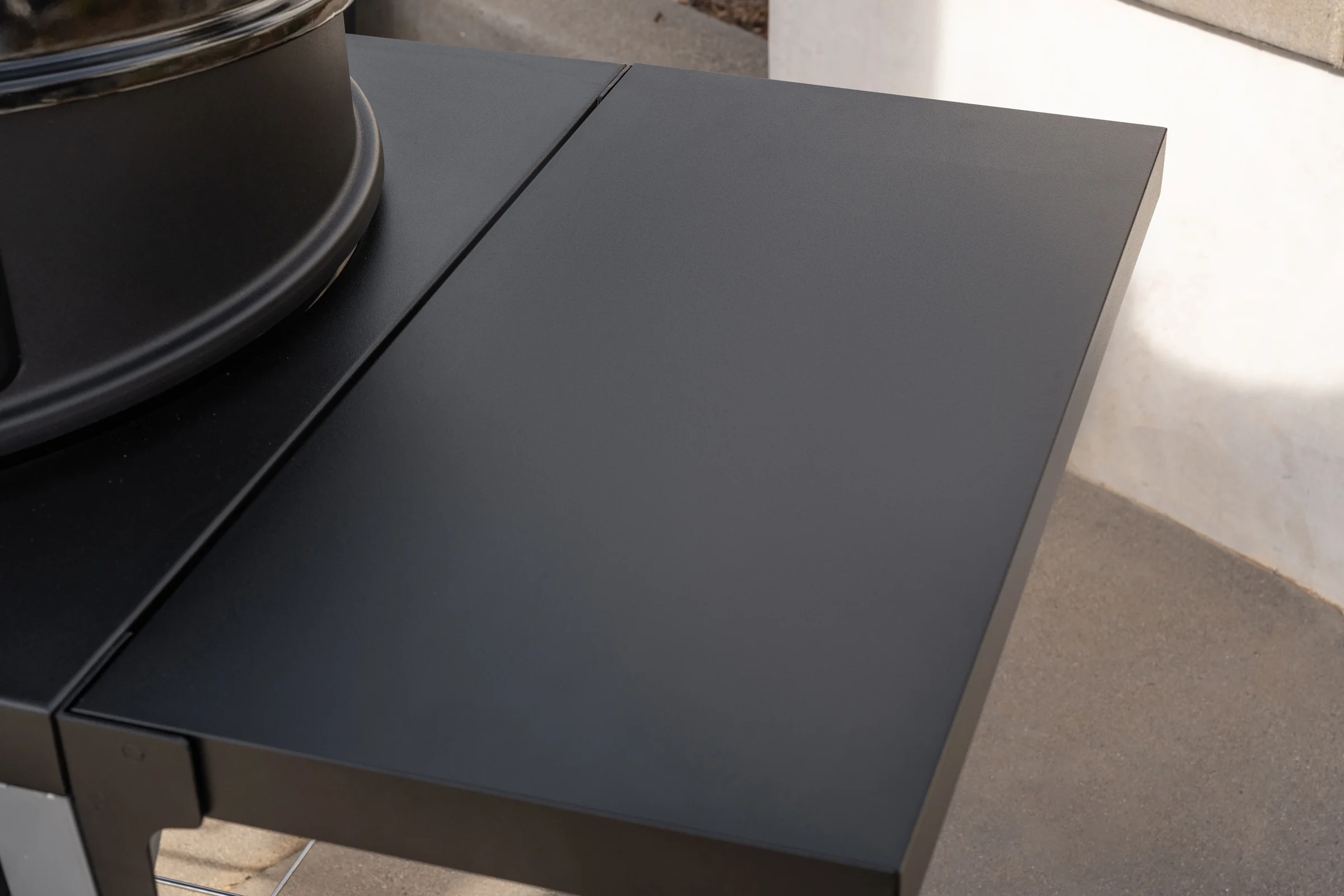 - Features a right side-shelf, front condiment tray, and bottom storage rack to keep your grilling essentials within reach.