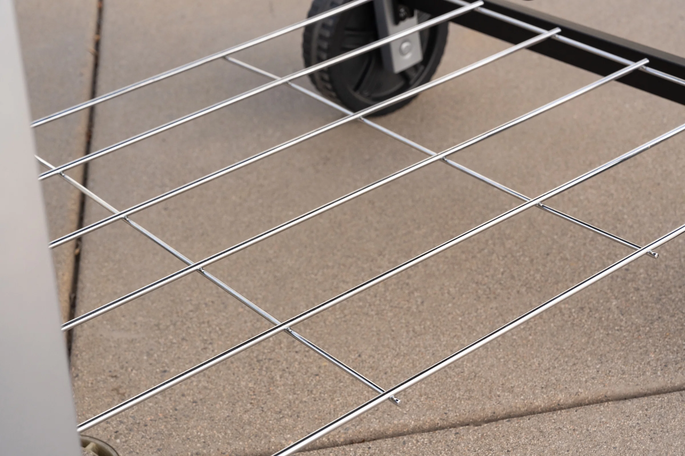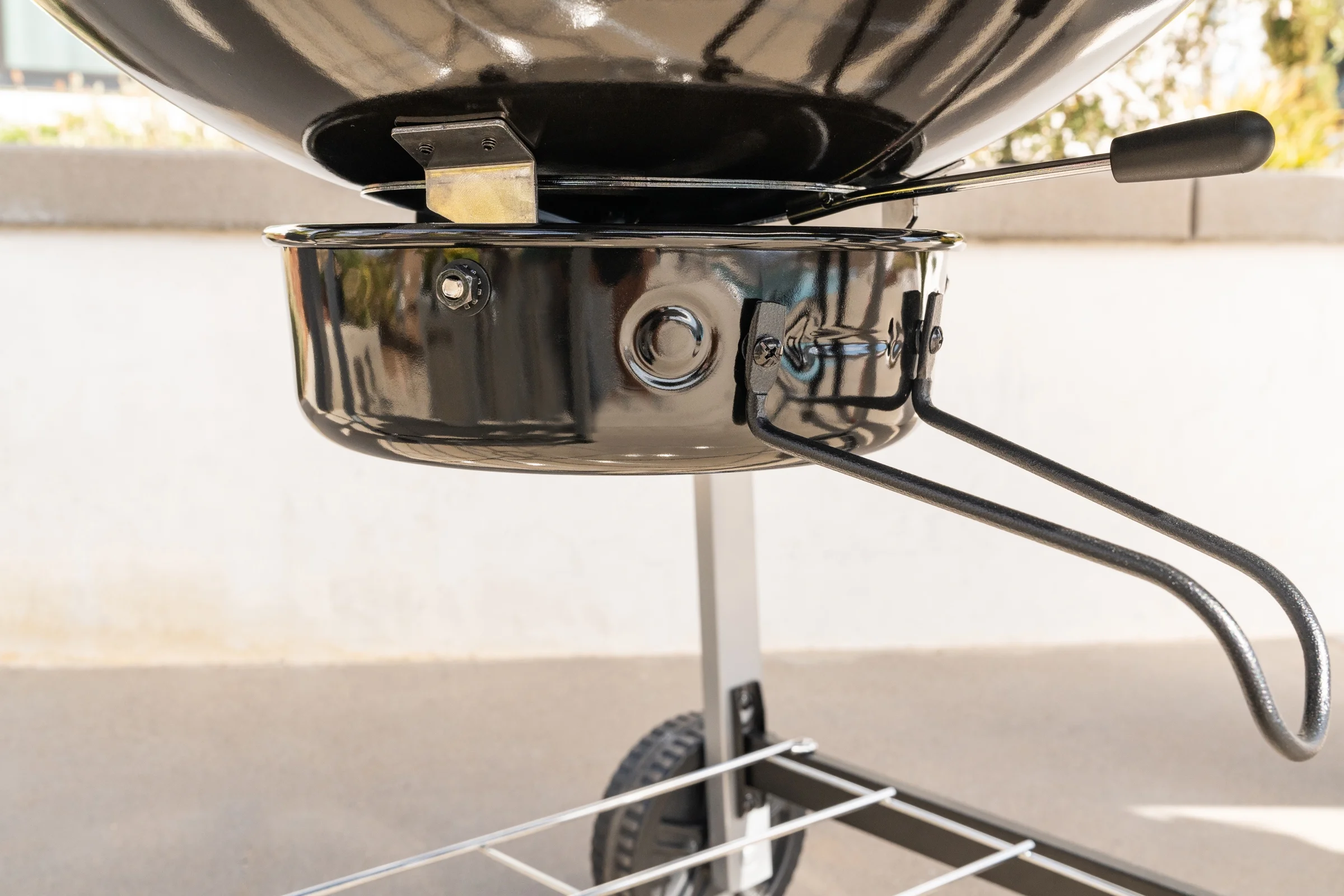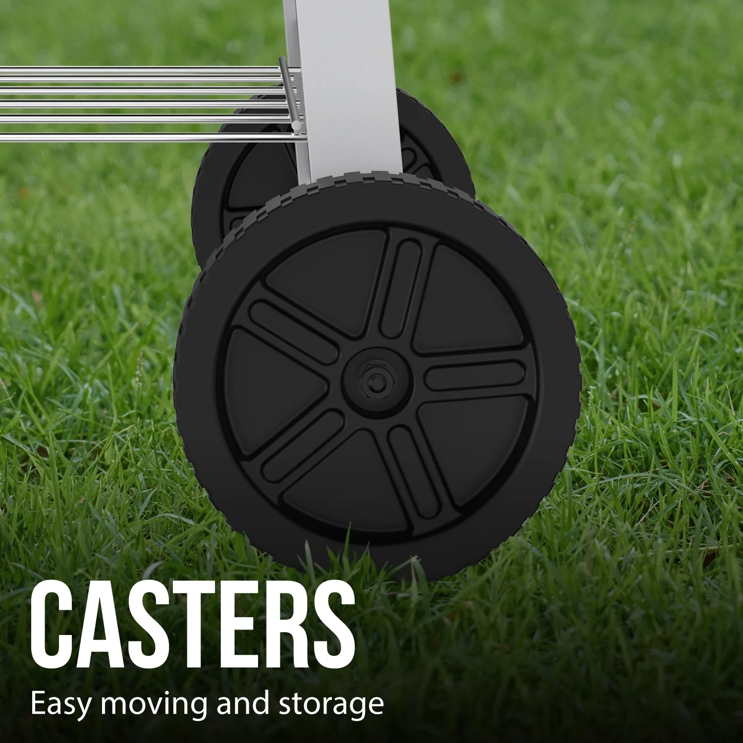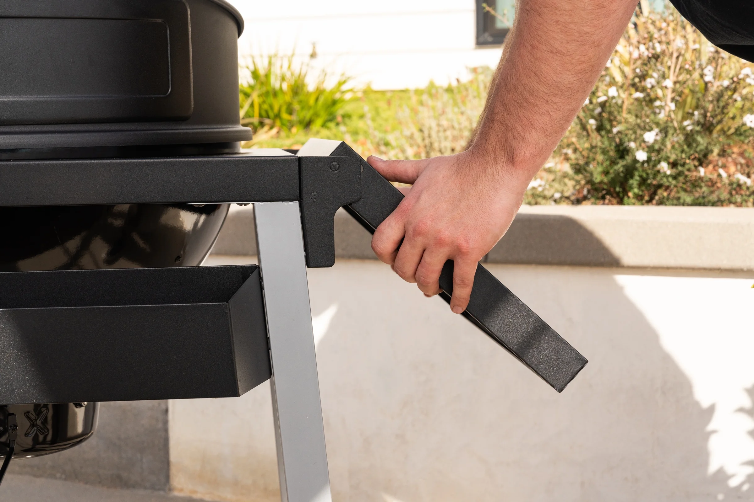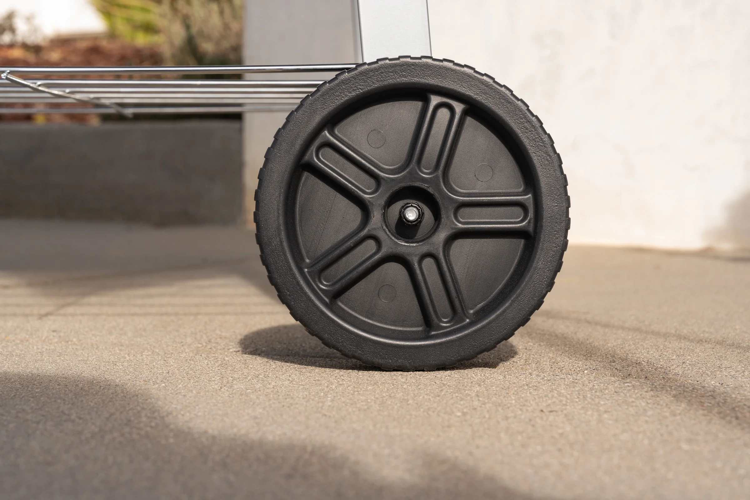 - Two heavy-duty wheels and a sturdy side handle make moving the grill effortless.